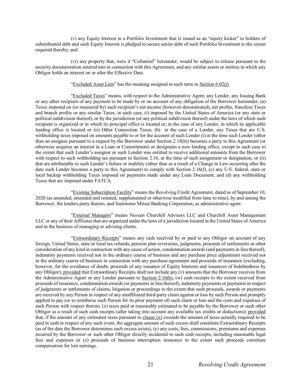 21 Revolving Credit Agreement (v) any Equity Interest in a Portfolio Investment that is issued as an “equity kicker” to holders of subordinated debt and such Equity Interest is pledged to secure senior debt of such Portfolio Investment to the extent required thereby; and (vi) any property that, were it “Collateral” hereunder, would be subject to release pursuant to the security documentation entered into in connection with this Agreement, and any similar assets or entities in which any Obligor holds an interest on or after the Effective Date. “Excluded Asset Lien” has the meaning assigned to such term in Section 6.02(j). “Excluded Taxes” means, with respect to the Administrative Agent, any Lender, any Issuing Bank or any other recipient of any payment to be made by or on account of any obligation of the Borrower hereunder, (a) Taxes imposed on (or measured by) such recipient’s net income (however denominated), net profits, franchise Taxes and branch profits or any similar Taxes, in each case, (i) imposed by the United States of America (or any state or political subdivision thereof), or by the jurisdiction (or any political subdivision thereof) under the laws of which such recipient is organized or in which its principal office is located or, in the case of any Lender, in which its applicable lending office is located or (ii) Other Connection Taxes, (b) in the case of a Lender, any Taxes that are U.S. withholding taxes imposed on amounts payable to or for the account of such Lender (i) at the time such Lender (other than an assignee pursuant to a request by the Borrower under Section 2.18(b)) becomes a party to this Agreement (or otherwise acquires an interest in a Loan or Commitment) or designates a new lending office, except in each case to the extent that such Lender’s assignor or such Lender was entitled to receive additional amounts from the Borrower with respect to such withholding tax pursuant to Section 2.16, at the time of such assignment or designation, or (ii) that are attributable to such Lender’s failure or inability (other than as a result of a Change in Law occurring after the date such Lender becomes a party to this Agreement) to comply with Section 2.16(f), (c) any U.S. federal, state or local backup withholding Taxes imposed on payments made under any Loan Document, and (d) any withholding Taxes that are imposed under FATCA. “Existing Subscription Facility” means the Revolving Credit Agreement, dated as of September 10, 2020 (as amended, amended and restated, supplemented or otherwise modified from time to time), by and among the Borrower, the lenders party thereto, and Sumitomo Mitsui Banking Corporation, as administrative agent. “External Managers” means Nuveen Churchill Advisors LLC and Churchill Asset Management LLC or any of their Affiliates that are organized under the laws of a jurisdiction located in the United States of America and in the business of managing or advising clients. “Extraordinary Receipts” means any cash received by or paid to any Obligor on account of any foreign, United States, state or local tax refunds, pension plan reversions, judgments, proceeds of settlements or other consideration of any kind in connection with any cause of action, condemnation awards (and payments in lieu thereof), indemnity payments received not in the ordinary course of business and any purchase price adjustment received not in the ordinary course of business in connection with any purchase agreement and proceeds of insurance (excluding, however, for the avoidance of doubt, proceeds of any issuance of Equity Interests and issuances of Indebtedness by any Obligor); provided that Extraordinary Receipts shall not include any (v) amounts that the Borrower receives from the Administrative Agent or any Lender pursuant to Section 2.16(h), (w) cash receipts to the extent received from proceeds of insurance, condemnation awards (or payments in lieu thereof), indemnity payments or payments in respect of judgments or settlements of claims, litigation or proceedings to the extent that such proceeds, awards or payments are received by any Person in respect of any unaffiliated third-party claim against or loss by such Person and promptly applied to pay (or to reimburse such Person for its prior payment of) such claim or loss and the costs and expenses of such Person with respect thereto, (x) taxes paid or reasonably estimated to be payable by the Borrower or such other Obligor as a result of such cash receipts (after taking into account any available tax credits or deductions); provided that, if the amount of any estimated taxes pursuant to clause (x) exceeds the amount of taxes actually required to be paid in cash in respect of any such event, the aggregate amount of such excess shall constitute Extraordinary Receipts (as of the date the Borrower determines such excess exists), (y) any costs, fees, commissions, premiums and expenses incurred by the Borrower or such other Obligor directly incidental to such cash receipts, including reasonable legal fees and expenses or (z) proceeds of business interruption insurance to the extent such proceeds constitute compensation for lost earnings.
