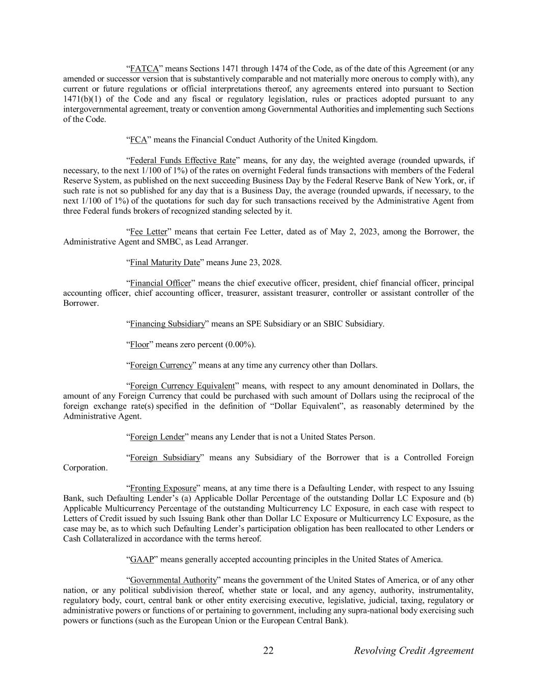 22 Revolving Credit Agreement “FATCA” means Sections 1471 through 1474 of the Code, as of the date of this Agreement (or any amended or successor version that is substantively comparable and not materially more onerous to comply with), any current or future regulations or official interpretations thereof, any agreements entered into pursuant to Section 1471(b)(1) of the Code and any fiscal or regulatory legislation, rules or practices adopted pursuant to any intergovernmental agreement, treaty or convention among Governmental Authorities and implementing such Sections of the Code. “FCA” means the Financial Conduct Authority of the United Kingdom. “Federal Funds Effective Rate” means, for any day, the weighted average (rounded upwards, if necessary, to the next 1/100 of 1%) of the rates on overnight Federal funds transactions with members of the Federal Reserve System, as published on the next succeeding Business Day by the Federal Reserve Bank of New York, or, if such rate is not so published for any day that is a Business Day, the average (rounded upwards, if necessary, to the next 1/100 of 1%) of the quotations for such day for such transactions received by the Administrative Agent from three Federal funds brokers of recognized standing selected by it. “Fee Letter” means that certain Fee Letter, dated as of May 2, 2023, among the Borrower, the Administrative Agent and SMBC, as Lead Arranger. “Final Maturity Date” means June 23, 2028. “Financial Officer” means the chief executive officer, president, chief financial officer, principal accounting officer, chief accounting officer, treasurer, assistant treasurer, controller or assistant controller of the Borrower. “Financing Subsidiary” means an SPE Subsidiary or an SBIC Subsidiary. “Floor” means zero percent (0.00%). “Foreign Currency” means at any time any currency other than Dollars. “Foreign Currency Equivalent” means, with respect to any amount denominated in Dollars, the amount of any Foreign Currency that could be purchased with such amount of Dollars using the reciprocal of the foreign exchange rate(s) specified in the definition of “Dollar Equivalent”, as reasonably determined by the Administrative Agent. “Foreign Lender” means any Lender that is not a United States Person. “Foreign Subsidiary” means any Subsidiary of the Borrower that is a Controlled Foreign Corporation. “Fronting Exposure” means, at any time there is a Defaulting Lender, with respect to any Issuing Bank, such Defaulting Lender’s (a) Applicable Dollar Percentage of the outstanding Dollar LC Exposure and (b) Applicable Multicurrency Percentage of the outstanding Multicurrency LC Exposure, in each case with respect to Letters of Credit issued by such Issuing Bank other than Dollar LC Exposure or Multicurrency LC Exposure, as the case may be, as to which such Defaulting Lender’s participation obligation has been reallocated to other Lenders or Cash Collateralized in accordance with the terms hereof. “GAAP” means generally accepted accounting principles in the United States of America. “Governmental Authority” means the government of the United States of America, or of any other nation, or any political subdivision thereof, whether state or local, and any agency, authority, instrumentality, regulatory body, court, central bank or other entity exercising executive, legislative, judicial, taxing, regulatory or administrative powers or functions of or pertaining to government, including any supra-national body exercising such powers or functions (such as the European Union or the European Central Bank).