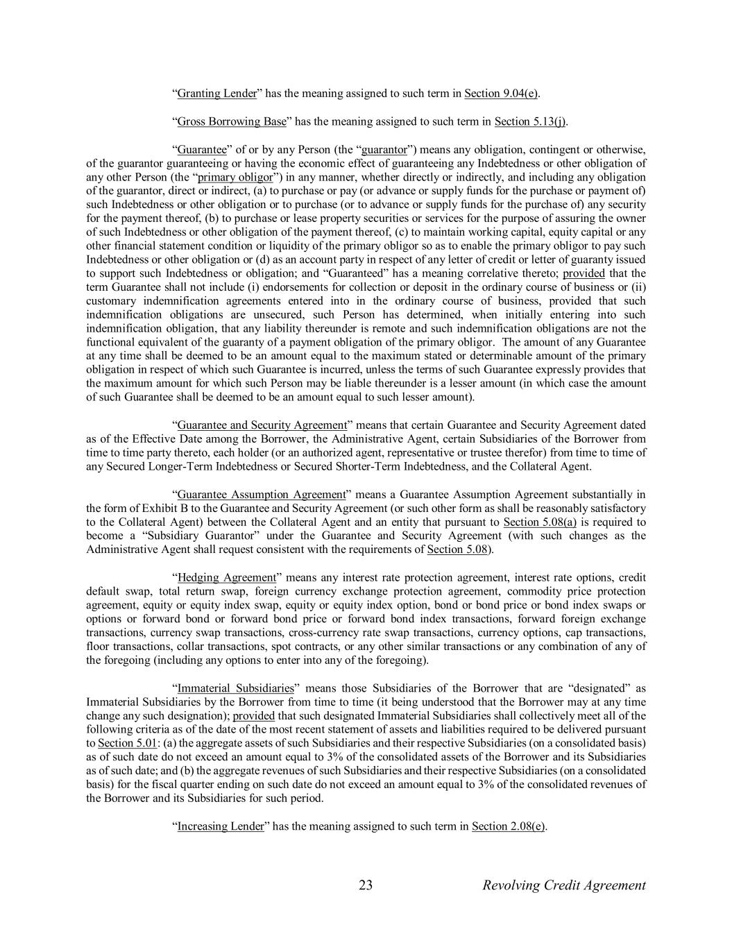 23 Revolving Credit Agreement “Granting Lender” has the meaning assigned to such term in Section 9.04(e). “Gross Borrowing Base” has the meaning assigned to such term in Section 5.13(j). “Guarantee” of or by any Person (the “guarantor”) means any obligation, contingent or otherwise, of the guarantor guaranteeing or having the economic effect of guaranteeing any Indebtedness or other obligation of any other Person (the “primary obligor”) in any manner, whether directly or indirectly, and including any obligation of the guarantor, direct or indirect, (a) to purchase or pay (or advance or supply funds for the purchase or payment of) such Indebtedness or other obligation or to purchase (or to advance or supply funds for the purchase of) any security for the payment thereof, (b) to purchase or lease property securities or services for the purpose of assuring the owner of such Indebtedness or other obligation of the payment thereof, (c) to maintain working capital, equity capital or any other financial statement condition or liquidity of the primary obligor so as to enable the primary obligor to pay such Indebtedness or other obligation or (d) as an account party in respect of any letter of credit or letter of guaranty issued to support such Indebtedness or obligation; and “Guaranteed” has a meaning correlative thereto; provided that the term Guarantee shall not include (i) endorsements for collection or deposit in the ordinary course of business or (ii) customary indemnification agreements entered into in the ordinary course of business, provided that such indemnification obligations are unsecured, such Person has determined, when initially entering into such indemnification obligation, that any liability thereunder is remote and such indemnification obligations are not the functional equivalent of the guaranty of a payment obligation of the primary obligor. The amount of any Guarantee at any time shall be deemed to be an amount equal to the maximum stated or determinable amount of the primary obligation in respect of which such Guarantee is incurred, unless the terms of such Guarantee expressly provides that the maximum amount for which such Person may be liable thereunder is a lesser amount (in which case the amount of such Guarantee shall be deemed to be an amount equal to such lesser amount). “Guarantee and Security Agreement” means that certain Guarantee and Security Agreement dated as of the Effective Date among the Borrower, the Administrative Agent, certain Subsidiaries of the Borrower from time to time party thereto, each holder (or an authorized agent, representative or trustee therefor) from time to time of any Secured Longer-Term Indebtedness or Secured Shorter-Term Indebtedness, and the Collateral Agent. “Guarantee Assumption Agreement” means a Guarantee Assumption Agreement substantially in the form of Exhibit B to the Guarantee and Security Agreement (or such other form as shall be reasonably satisfactory to the Collateral Agent) between the Collateral Agent and an entity that pursuant to Section 5.08(a) is required to become a “Subsidiary Guarantor” under the Guarantee and Security Agreement (with such changes as the Administrative Agent shall request consistent with the requirements of Section 5.08). “Hedging Agreement” means any interest rate protection agreement, interest rate options, credit default swap, total return swap, foreign currency exchange protection agreement, commodity price protection agreement, equity or equity index swap, equity or equity index option, bond or bond price or bond index swaps or options or forward bond or forward bond price or forward bond index transactions, forward foreign exchange transactions, currency swap transactions, cross-currency rate swap transactions, currency options, cap transactions, floor transactions, collar transactions, spot contracts, or any other similar transactions or any combination of any of the foregoing (including any options to enter into any of the foregoing). “Immaterial Subsidiaries” means those Subsidiaries of the Borrower that are “designated” as Immaterial Subsidiaries by the Borrower from time to time (it being understood that the Borrower may at any time change any such designation); provided that such designated Immaterial Subsidiaries shall collectively meet all of the following criteria as of the date of the most recent statement of assets and liabilities required to be delivered pursuant to Section 5.01: (a) the aggregate assets of such Subsidiaries and their respective Subsidiaries (on a consolidated basis) as of such date do not exceed an amount equal to 3% of the consolidated assets of the Borrower and its Subsidiaries as of such date; and (b) the aggregate revenues of such Subsidiaries and their respective Subsidiaries (on a consolidated basis) for the fiscal quarter ending on such date do not exceed an amount equal to 3% of the consolidated revenues of the Borrower and its Subsidiaries for such period. “Increasing Lender” has the meaning assigned to such term in Section 2.08(e).