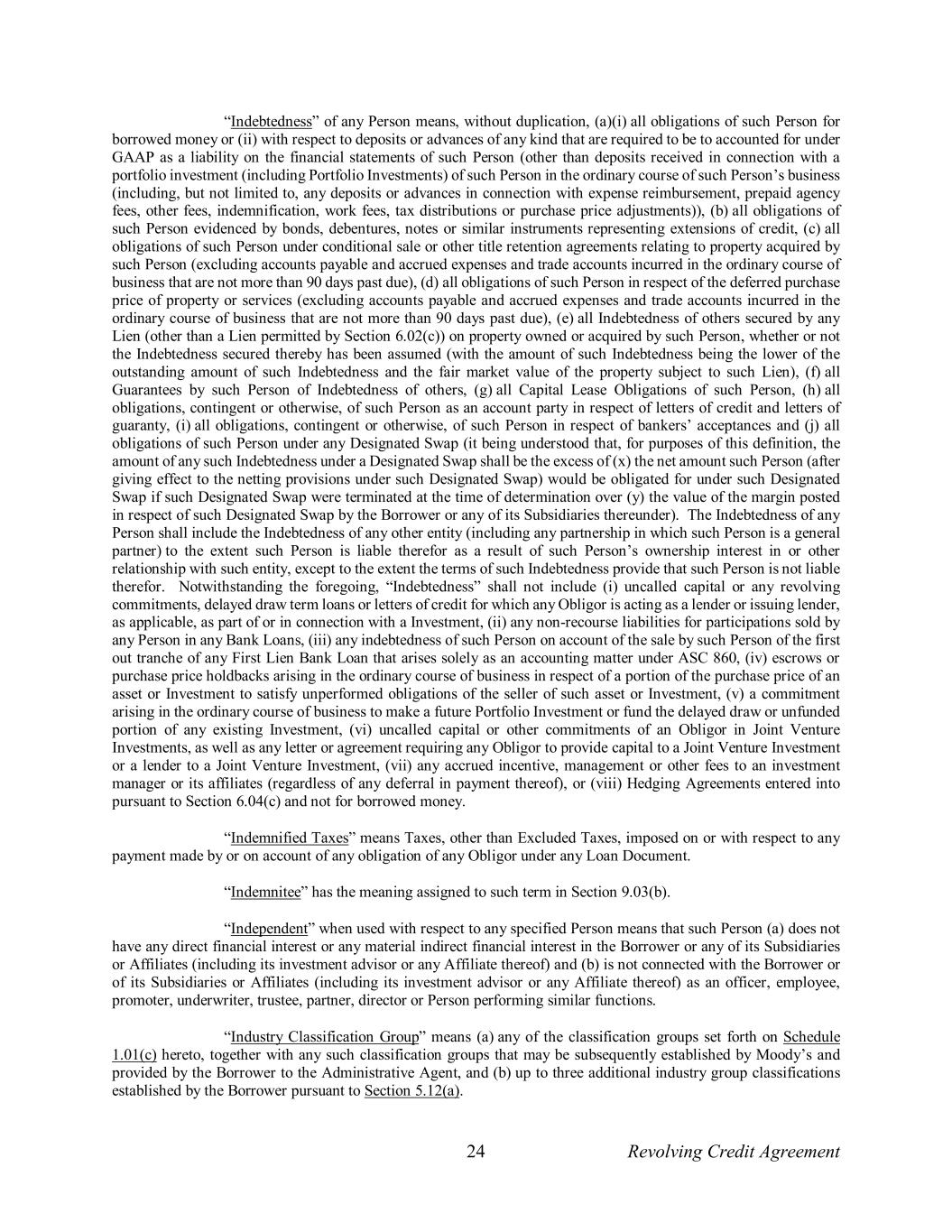 24 Revolving Credit Agreement “Indebtedness” of any Person means, without duplication, (a)(i) all obligations of such Person for borrowed money or (ii) with respect to deposits or advances of any kind that are required to be to accounted for under GAAP as a liability on the financial statements of such Person (other than deposits received in connection with a portfolio investment (including Portfolio Investments) of such Person in the ordinary course of such Person’s business (including, but not limited to, any deposits or advances in connection with expense reimbursement, prepaid agency fees, other fees, indemnification, work fees, tax distributions or purchase price adjustments)), (b) all obligations of such Person evidenced by bonds, debentures, notes or similar instruments representing extensions of credit, (c) all obligations of such Person under conditional sale or other title retention agreements relating to property acquired by such Person (excluding accounts payable and accrued expenses and trade accounts incurred in the ordinary course of business that are not more than 90 days past due), (d) all obligations of such Person in respect of the deferred purchase price of property or services (excluding accounts payable and accrued expenses and trade accounts incurred in the ordinary course of business that are not more than 90 days past due), (e) all Indebtedness of others secured by any Lien (other than a Lien permitted by Section 6.02(c)) on property owned or acquired by such Person, whether or not the Indebtedness secured thereby has been assumed (with the amount of such Indebtedness being the lower of the outstanding amount of such Indebtedness and the fair market value of the property subject to such Lien), (f) all Guarantees by such Person of Indebtedness of others, (g) all Capital Lease Obligations of such Person, (h) all obligations, contingent or otherwise, of such Person as an account party in respect of letters of credit and letters of guaranty, (i) all obligations, contingent or otherwise, of such Person in respect of bankers’ acceptances and (j) all obligations of such Person under any Designated Swap (it being understood that, for purposes of this definition, the amount of any such Indebtedness under a Designated Swap shall be the excess of (x) the net amount such Person (after giving effect to the netting provisions under such Designated Swap) would be obligated for under such Designated Swap if such Designated Swap were terminated at the time of determination over (y) the value of the margin posted in respect of such Designated Swap by the Borrower or any of its Subsidiaries thereunder). The Indebtedness of any Person shall include the Indebtedness of any other entity (including any partnership in which such Person is a general partner) to the extent such Person is liable therefor as a result of such Person’s ownership interest in or other relationship with such entity, except to the extent the terms of such Indebtedness provide that such Person is not liable therefor. Notwithstanding the foregoing, “Indebtedness” shall not include (i) uncalled capital or any revolving commitments, delayed draw term loans or letters of credit for which any Obligor is acting as a lender or issuing lender, as applicable, as part of or in connection with a Investment, (ii) any non-recourse liabilities for participations sold by any Person in any Bank Loans, (iii) any indebtedness of such Person on account of the sale by such Person of the first out tranche of any First Lien Bank Loan that arises solely as an accounting matter under ASC 860, (iv) escrows or purchase price holdbacks arising in the ordinary course of business in respect of a portion of the purchase price of an asset or Investment to satisfy unperformed obligations of the seller of such asset or Investment, (v) a commitment arising in the ordinary course of business to make a future Portfolio Investment or fund the delayed draw or unfunded portion of any existing Investment, (vi) uncalled capital or other commitments of an Obligor in Joint Venture Investments, as well as any letter or agreement requiring any Obligor to provide capital to a Joint Venture Investment or a lender to a Joint Venture Investment, (vii) any accrued incentive, management or other fees to an investment manager or its affiliates (regardless of any deferral in payment thereof), or (viii) Hedging Agreements entered into pursuant to Section 6.04(c) and not for borrowed money. “Indemnified Taxes” means Taxes, other than Excluded Taxes, imposed on or with respect to any payment made by or on account of any obligation of any Obligor under any Loan Document. “Indemnitee” has the meaning assigned to such term in Section 9.03(b). “Independent” when used with respect to any specified Person means that such Person (a) does not have any direct financial interest or any material indirect financial interest in the Borrower or any of its Subsidiaries or Affiliates (including its investment advisor or any Affiliate thereof) and (b) is not connected with the Borrower or of its Subsidiaries or Affiliates (including its investment advisor or any Affiliate thereof) as an officer, employee, promoter, underwriter, trustee, partner, director or Person performing similar functions. “Industry Classification Group” means (a) any of the classification groups set forth on Schedule 1.01(c) hereto, together with any such classification groups that may be subsequently established by Moody’s and provided by the Borrower to the Administrative Agent, and (b) up to three additional industry group classifications established by the Borrower pursuant to Section 5.12(a).