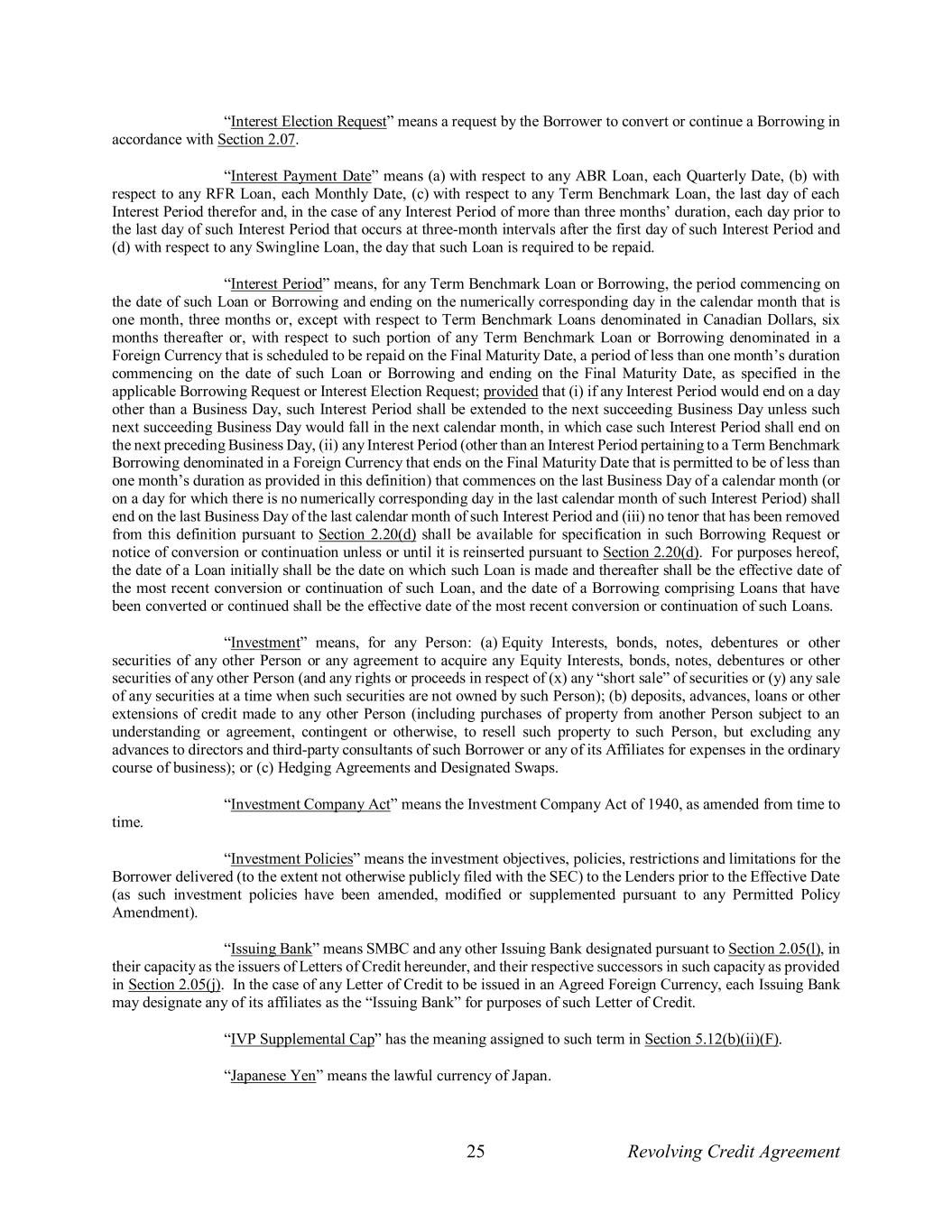 25 Revolving Credit Agreement “Interest Election Request” means a request by the Borrower to convert or continue a Borrowing in accordance with Section 2.07. “Interest Payment Date” means (a) with respect to any ABR Loan, each Quarterly Date, (b) with respect to any RFR Loan, each Monthly Date, (c) with respect to any Term Benchmark Loan, the last day of each Interest Period therefor and, in the case of any Interest Period of more than three months’ duration, each day prior to the last day of such Interest Period that occurs at three-month intervals after the first day of such Interest Period and (d) with respect to any Swingline Loan, the day that such Loan is required to be repaid. “Interest Period” means, for any Term Benchmark Loan or Borrowing, the period commencing on the date of such Loan or Borrowing and ending on the numerically corresponding day in the calendar month that is one month, three months or, except with respect to Term Benchmark Loans denominated in Canadian Dollars, six months thereafter or, with respect to such portion of any Term Benchmark Loan or Borrowing denominated in a Foreign Currency that is scheduled to be repaid on the Final Maturity Date, a period of less than one month’s duration commencing on the date of such Loan or Borrowing and ending on the Final Maturity Date, as specified in the applicable Borrowing Request or Interest Election Request; provided that (i) if any Interest Period would end on a day other than a Business Day, such Interest Period shall be extended to the next succeeding Business Day unless such next succeeding Business Day would fall in the next calendar month, in which case such Interest Period shall end on the next preceding Business Day, (ii) any Interest Period (other than an Interest Period pertaining to a Term Benchmark Borrowing denominated in a Foreign Currency that ends on the Final Maturity Date that is permitted to be of less than one month’s duration as provided in this definition) that commences on the last Business Day of a calendar month (or on a day for which there is no numerically corresponding day in the last calendar month of such Interest Period) shall end on the last Business Day of the last calendar month of such Interest Period and (iii) no tenor that has been removed from this definition pursuant to Section 2.20(d) shall be available for specification in such Borrowing Request or notice of conversion or continuation unless or until it is reinserted pursuant to Section 2.20(d). For purposes hereof, the date of a Loan initially shall be the date on which such Loan is made and thereafter shall be the effective date of the most recent conversion or continuation of such Loan, and the date of a Borrowing comprising Loans that have been converted or continued shall be the effective date of the most recent conversion or continuation of such Loans. “Investment” means, for any Person: (a) Equity Interests, bonds, notes, debentures or other securities of any other Person or any agreement to acquire any Equity Interests, bonds, notes, debentures or other securities of any other Person (and any rights or proceeds in respect of (x) any “short sale” of securities or (y) any sale of any securities at a time when such securities are not owned by such Person); (b) deposits, advances, loans or other extensions of credit made to any other Person (including purchases of property from another Person subject to an understanding or agreement, contingent or otherwise, to resell such property to such Person, but excluding any advances to directors and third-party consultants of such Borrower or any of its Affiliates for expenses in the ordinary course of business); or (c) Hedging Agreements and Designated Swaps. “Investment Company Act” means the Investment Company Act of 1940, as amended from time to time. “Investment Policies” means the investment objectives, policies, restrictions and limitations for the Borrower delivered (to the extent not otherwise publicly filed with the SEC) to the Lenders prior to the Effective Date (as such investment policies have been amended, modified or supplemented pursuant to any Permitted Policy Amendment). “Issuing Bank” means SMBC and any other Issuing Bank designated pursuant to Section 2.05(l), in their capacity as the issuers of Letters of Credit hereunder, and their respective successors in such capacity as provided in Section 2.05(j). In the case of any Letter of Credit to be issued in an Agreed Foreign Currency, each Issuing Bank may designate any of its affiliates as the “Issuing Bank” for purposes of such Letter of Credit. “IVP Supplemental Cap” has the meaning assigned to such term in Section 5.12(b)(ii)(F). “Japanese Yen” means the lawful currency of Japan.