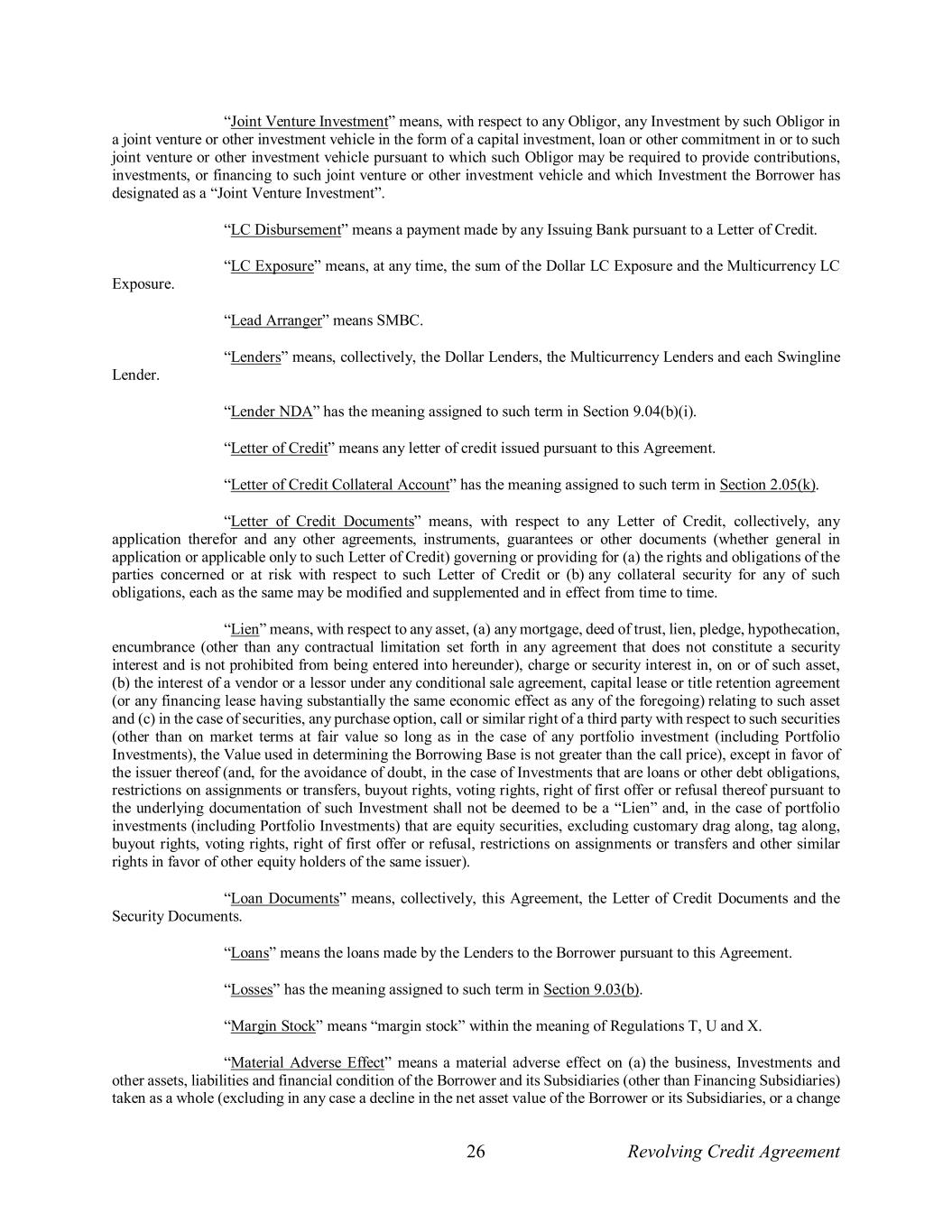 26 Revolving Credit Agreement “Joint Venture Investment” means, with respect to any Obligor, any Investment by such Obligor in a joint venture or other investment vehicle in the form of a capital investment, loan or other commitment in or to such joint venture or other investment vehicle pursuant to which such Obligor may be required to provide contributions, investments, or financing to such joint venture or other investment vehicle and which Investment the Borrower has designated as a “Joint Venture Investment”. “LC Disbursement” means a payment made by any Issuing Bank pursuant to a Letter of Credit. “LC Exposure” means, at any time, the sum of the Dollar LC Exposure and the Multicurrency LC Exposure. “Lead Arranger” means SMBC. “Lenders” means, collectively, the Dollar Lenders, the Multicurrency Lenders and each Swingline Lender. “Lender NDA” has the meaning assigned to such term in Section 9.04(b)(i). “Letter of Credit” means any letter of credit issued pursuant to this Agreement. “Letter of Credit Collateral Account” has the meaning assigned to such term in Section 2.05(k). “Letter of Credit Documents” means, with respect to any Letter of Credit, collectively, any application therefor and any other agreements, instruments, guarantees or other documents (whether general in application or applicable only to such Letter of Credit) governing or providing for (a) the rights and obligations of the parties concerned or at risk with respect to such Letter of Credit or (b) any collateral security for any of such obligations, each as the same may be modified and supplemented and in effect from time to time. “Lien” means, with respect to any asset, (a) any mortgage, deed of trust, lien, pledge, hypothecation, encumbrance (other than any contractual limitation set forth in any agreement that does not constitute a security interest and is not prohibited from being entered into hereunder), charge or security interest in, on or of such asset, (b) the interest of a vendor or a lessor under any conditional sale agreement, capital lease or title retention agreement (or any financing lease having substantially the same economic effect as any of the foregoing) relating to such asset and (c) in the case of securities, any purchase option, call or similar right of a third party with respect to such securities (other than on market terms at fair value so long as in the case of any portfolio investment (including Portfolio Investments), the Value used in determining the Borrowing Base is not greater than the call price), except in favor of the issuer thereof (and, for the avoidance of doubt, in the case of Investments that are loans or other debt obligations, restrictions on assignments or transfers, buyout rights, voting rights, right of first offer or refusal thereof pursuant to the underlying documentation of such Investment shall not be deemed to be a “Lien” and, in the case of portfolio investments (including Portfolio Investments) that are equity securities, excluding customary drag along, tag along, buyout rights, voting rights, right of first offer or refusal, restrictions on assignments or transfers and other similar rights in favor of other equity holders of the same issuer). “Loan Documents” means, collectively, this Agreement, the Letter of Credit Documents and the Security Documents. “Loans” means the loans made by the Lenders to the Borrower pursuant to this Agreement. “Losses” has the meaning assigned to such term in Section 9.03(b). “Margin Stock” means “margin stock” within the meaning of Regulations T, U and X. “Material Adverse Effect” means a material adverse effect on (a) the business, Investments and other assets, liabilities and financial condition of the Borrower and its Subsidiaries (other than Financing Subsidiaries) taken as a whole (excluding in any case a decline in the net asset value of the Borrower or its Subsidiaries, or a change