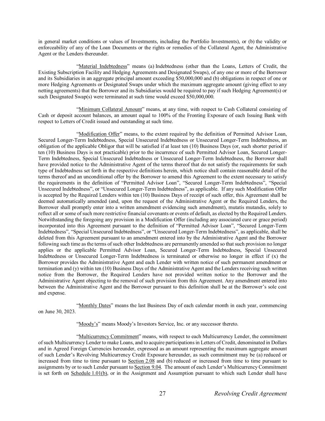 27 Revolving Credit Agreement in general market conditions or values of Investments, including the Portfolio Investments), or (b) the validity or enforceability of any of the Loan Documents or the rights or remedies of the Collateral Agent, the Administrative Agent or the Lenders thereunder. “Material Indebtedness” means (a) Indebtedness (other than the Loans, Letters of Credit, the Existing Subscription Facility and Hedging Agreements and Designated Swaps), of any one or more of the Borrower and its Subsidiaries in an aggregate principal amount exceeding $50,000,000 and (b) obligations in respect of one or more Hedging Agreements or Designated Swaps under which the maximum aggregate amount (giving effect to any netting agreements) that the Borrower and its Subsidiaries would be required to pay if such Hedging Agreement(s) or such Designated Swap(s) were terminated at such time would exceed $50,000,000. “Minimum Collateral Amount” means, at any time, with respect to Cash Collateral consisting of Cash or deposit account balances, an amount equal to 100% of the Fronting Exposure of each Issuing Bank with respect to Letters of Credit issued and outstanding at such time. “Modification Offer” means, to the extent required by the definition of Permitted Advisor Loan, Secured Longer-Term Indebtedness, Special Unsecured Indebtedness or Unsecured Longer-Term Indebtedness, an obligation of the applicable Obligor that will be satisfied if at least ten (10) Business Days (or, such shorter period if ten (10) Business Days is not practicable) prior to the incurrence of such Permitted Advisor Loan, Secured Longer- Term Indebtedness, Special Unsecured Indebtedness or Unsecured Longer-Term Indebtedness, the Borrower shall have provided notice to the Administrative Agent of the terms thereof that do not satisfy the requirements for such type of Indebtedness set forth in the respective definitions herein, which notice shall contain reasonable detail of the terms thereof and an unconditional offer by the Borrower to amend this Agreement to the extent necessary to satisfy the requirements in the definition of “Permitted Advisor Loan”, “Secured Longer-Term Indebtedness”, “Special Unsecured Indebtedness”, or “Unsecured Longer-Term Indebtedness”, as applicable. If any such Modification Offer is accepted by the Required Lenders within ten (10) Business Days of receipt of such offer, this Agreement shall be deemed automatically amended (and, upon the request of the Administrative Agent or the Required Lenders, the Borrower shall promptly enter into a written amendment evidencing such amendment), mutatis mutandis, solely to reflect all or some of such more restrictive financial covenants or events of default, as elected by the Required Lenders. Notwithstanding the foregoing any provision in a Modification Offer (including any associated cure or grace period) incorporated into this Agreement pursuant to the definition of “Permitted Advisor Loan”, “Secured Longer-Term Indebtedness”, “Special Unsecured Indebtedness”, or “Unsecured Longer-Term Indebtedness”, as applicable, shall be deleted from this Agreement pursuant to an amendment entered into by the Administrative Agent and the Borrower following such time as the terms of such other Indebtedness are permanently amended so that such provision no longer applies or the applicable Permitted Advisor Loan, Secured Longer-Term Indebtedness, Special Unsecured Indebtedness or Unsecured Longer-Term Indebtedness is terminated or otherwise no longer in effect if (x) the Borrower provides the Administrative Agent and each Lender with written notice of such permanent amendment or termination and (y) within ten (10) Business Days of the Administrative Agent and the Lenders receiving such written notice from the Borrower, the Required Lenders have not provided written notice to the Borrower and the Administrative Agent objecting to the removal of such provision from this Agreement. Any amendment entered into between the Administrative Agent and the Borrower pursuant to this definition shall be at the Borrower’s sole cost and expense. “Monthly Dates” means the last Business Day of each calendar month in each year, commencing on June 30, 2023. “Moody’s” means Moody’s Investors Service, Inc. or any successor thereto. “Multicurrency Commitment” means, with respect to each Multicurrency Lender, the commitment of such Multicurrency Lender to make Loans, and to acquire participations in Letters of Credit, denominated in Dollars and in Agreed Foreign Currencies hereunder, expressed as an amount representing the maximum aggregate amount of such Lender’s Revolving Multicurrency Credit Exposure hereunder, as such commitment may be (a) reduced or increased from time to time pursuant to Section 2.08 and (b) reduced or increased from time to time pursuant to assignments by or to such Lender pursuant to Section 9.04. The amount of each Lender’s Multicurrency Commitment is set forth on Schedule 1.01(b), or in the Assignment and Assumption pursuant to which such Lender shall have