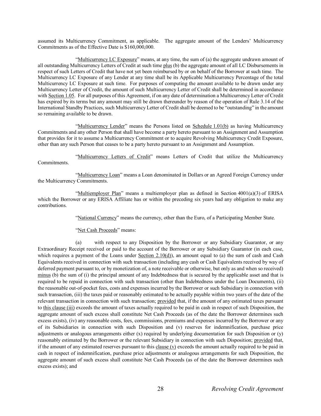 28 Revolving Credit Agreement assumed its Multicurrency Commitment, as applicable. The aggregate amount of the Lenders’ Multicurrency Commitments as of the Effective Date is $160,000,000. “Multicurrency LC Exposure” means, at any time, the sum of (a) the aggregate undrawn amount of all outstanding Multicurrency Letters of Credit at such time plus (b) the aggregate amount of all LC Disbursements in respect of such Letters of Credit that have not yet been reimbursed by or on behalf of the Borrower at such time. The Multicurrency LC Exposure of any Lender at any time shall be its Applicable Multicurrency Percentage of the total Multicurrency LC Exposure at such time. For purposes of computing the amount available to be drawn under any Multicurrency Letter of Credit, the amount of such Multicurrency Letter of Credit shall be determined in accordance with Section 1.05. For all purposes of this Agreement, if on any date of determination a Multicurrency Letter of Credit has expired by its terms but any amount may still be drawn thereunder by reason of the operation of Rule 3.14 of the International Standby Practices, such Multicurrency Letter of Credit shall be deemed to be “outstanding” in the amount so remaining available to be drawn. “Multicurrency Lender” means the Persons listed on Schedule 1.01(b) as having Multicurrency Commitments and any other Person that shall have become a party hereto pursuant to an Assignment and Assumption that provides for it to assume a Multicurrency Commitment or to acquire Revolving Multicurrency Credit Exposure, other than any such Person that ceases to be a party hereto pursuant to an Assignment and Assumption. “Multicurrency Letters of Credit” means Letters of Credit that utilize the Multicurrency Commitments. “Multicurrency Loan” means a Loan denominated in Dollars or an Agreed Foreign Currency under the Multicurrency Commitments. “Multiemployer Plan” means a multiemployer plan as defined in Section 4001(a)(3) of ERISA which the Borrower or any ERISA Affiliate has or within the preceding six years had any obligation to make any contributions. “National Currency” means the currency, other than the Euro, of a Participating Member State. “Net Cash Proceeds” means: (a) with respect to any Disposition by the Borrower or any Subsidiary Guarantor, or any Extraordinary Receipt received or paid to the account of the Borrower or any Subsidiary Guarantor (in each case, which requires a payment of the Loans under Section 2.10(d)), an amount equal to (a) the sum of cash and Cash Equivalents received in connection with such transaction (including any cash or Cash Equivalents received by way of deferred payment pursuant to, or by monetization of, a note receivable or otherwise, but only as and when so received) minus (b) the sum of (i) the principal amount of any Indebtedness that is secured by the applicable asset and that is required to be repaid in connection with such transaction (other than Indebtedness under the Loan Documents), (ii) the reasonable out-of-pocket fees, costs and expenses incurred by the Borrower or such Subsidiary in connection with such transaction, (iii) the taxes paid or reasonably estimated to be actually payable within two years of the date of the relevant transaction in connection with such transaction; provided that, if the amount of any estimated taxes pursuant to this clause (iii) exceeds the amount of taxes actually required to be paid in cash in respect of such Disposition, the aggregate amount of such excess shall constitute Net Cash Proceeds (as of the date the Borrower determines such excess exists), (iv) any reasonable costs, fees, commissions, premiums and expenses incurred by the Borrower or any of its Subsidiaries in connection with such Disposition and (v) reserves for indemnification, purchase price adjustments or analogous arrangements either (x) required by underlying documentation for such Disposition or (y) reasonably estimated by the Borrower or the relevant Subsidiary in connection with such Disposition; provided that, if the amount of any estimated reserves pursuant to this clause (v) exceeds the amount actually required to be paid in cash in respect of indemnification, purchase price adjustments or analogous arrangements for such Disposition, the aggregate amount of such excess shall constitute Net Cash Proceeds (as of the date the Borrower determines such excess exists); and