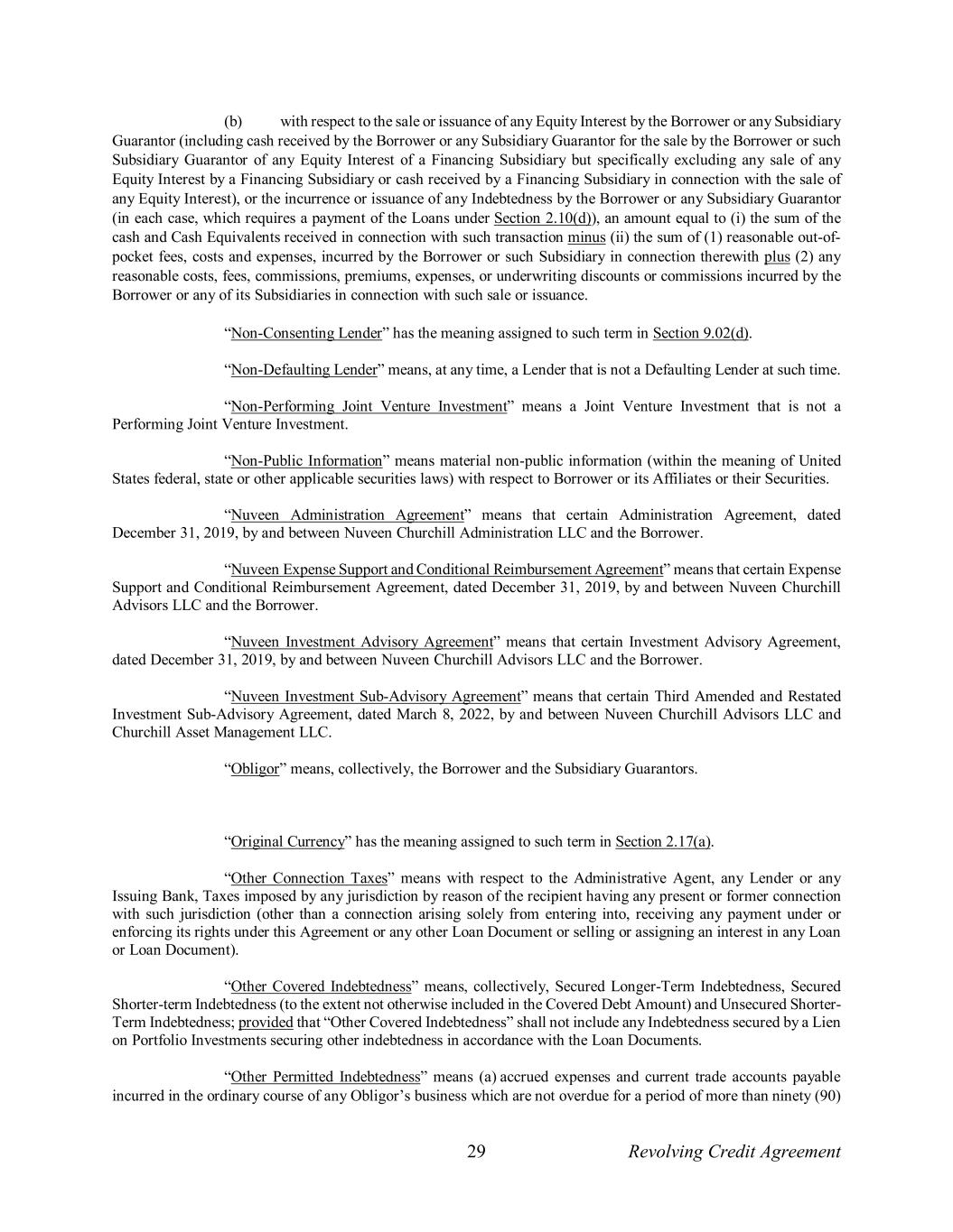 29 Revolving Credit Agreement (b) with respect to the sale or issuance of any Equity Interest by the Borrower or any Subsidiary Guarantor (including cash received by the Borrower or any Subsidiary Guarantor for the sale by the Borrower or such Subsidiary Guarantor of any Equity Interest of a Financing Subsidiary but specifically excluding any sale of any Equity Interest by a Financing Subsidiary or cash received by a Financing Subsidiary in connection with the sale of any Equity Interest), or the incurrence or issuance of any Indebtedness by the Borrower or any Subsidiary Guarantor (in each case, which requires a payment of the Loans under Section 2.10(d)), an amount equal to (i) the sum of the cash and Cash Equivalents received in connection with such transaction minus (ii) the sum of (1) reasonable out-of- pocket fees, costs and expenses, incurred by the Borrower or such Subsidiary in connection therewith plus (2) any reasonable costs, fees, commissions, premiums, expenses, or underwriting discounts or commissions incurred by the Borrower or any of its Subsidiaries in connection with such sale or issuance. “Non-Consenting Lender” has the meaning assigned to such term in Section 9.02(d). “Non-Defaulting Lender” means, at any time, a Lender that is not a Defaulting Lender at such time. “Non-Performing Joint Venture Investment” means a Joint Venture Investment that is not a Performing Joint Venture Investment. “Non-Public Information” means material non-public information (within the meaning of United States federal, state or other applicable securities laws) with respect to Borrower or its Affiliates or their Securities. “Nuveen Administration Agreement” means that certain Administration Agreement, dated December 31, 2019, by and between Nuveen Churchill Administration LLC and the Borrower. “Nuveen Expense Support and Conditional Reimbursement Agreement” means that certain Expense Support and Conditional Reimbursement Agreement, dated December 31, 2019, by and between Nuveen Churchill Advisors LLC and the Borrower. “Nuveen Investment Advisory Agreement” means that certain Investment Advisory Agreement, dated December 31, 2019, by and between Nuveen Churchill Advisors LLC and the Borrower. “Nuveen Investment Sub-Advisory Agreement” means that certain Third Amended and Restated Investment Sub-Advisory Agreement, dated March 8, 2022, by and between Nuveen Churchill Advisors LLC and Churchill Asset Management LLC. “Obligor” means, collectively, the Borrower and the Subsidiary Guarantors. “Original Currency” has the meaning assigned to such term in Section 2.17(a). “Other Connection Taxes” means with respect to the Administrative Agent, any Lender or any Issuing Bank, Taxes imposed by any jurisdiction by reason of the recipient having any present or former connection with such jurisdiction (other than a connection arising solely from entering into, receiving any payment under or enforcing its rights under this Agreement or any other Loan Document or selling or assigning an interest in any Loan or Loan Document). “Other Covered Indebtedness” means, collectively, Secured Longer-Term Indebtedness, Secured Shorter-term Indebtedness (to the extent not otherwise included in the Covered Debt Amount) and Unsecured Shorter- Term Indebtedness; provided that “Other Covered Indebtedness” shall not include any Indebtedness secured by a Lien on Portfolio Investments securing other indebtedness in accordance with the Loan Documents. “Other Permitted Indebtedness” means (a) accrued expenses and current trade accounts payable incurred in the ordinary course of any Obligor’s business which are not overdue for a period of more than ninety (90)