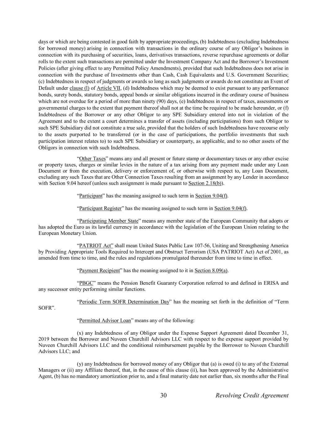 30 Revolving Credit Agreement days or which are being contested in good faith by appropriate proceedings, (b) Indebtedness (excluding Indebtedness for borrowed money) arising in connection with transactions in the ordinary course of any Obligor’s business in connection with its purchasing of securities, loans, derivatives transactions, reverse repurchase agreements or dollar rolls to the extent such transactions are permitted under the Investment Company Act and the Borrower’s Investment Policies (after giving effect to any Permitted Policy Amendments), provided that such Indebtedness does not arise in connection with the purchase of Investments other than Cash, Cash Equivalents and U.S. Government Securities; (c) Indebtedness in respect of judgments or awards so long as such judgments or awards do not constitute an Event of Default under clause (l) of Article VII, (d) Indebtedness which may be deemed to exist pursuant to any performance bonds, surety bonds, statutory bonds, appeal bonds or similar obligations incurred in the ordinary course of business which are not overdue for a period of more than ninety (90) days, (e) Indebtedness in respect of taxes, assessments or governmental charges to the extent that payment thereof shall not at the time be required to be made hereunder, or (f) Indebtedness of the Borrower or any other Obligor to any SPE Subsidiary entered into not in violation of the Agreement and to the extent a court determines a transfer of assets (including participations) from such Obligor to such SPE Subsidiary did not constitute a true sale, provided that the holders of such Indebtedness have recourse only to the assets purported to be transferred (or in the case of participations, the portfolio investments that such participation interest relates to) to such SPE Subsidiary or counterparty, as applicable, and to no other assets of the Obligors in connection with such Indebtedness. “Other Taxes” means any and all present or future stamp or documentary taxes or any other excise or property taxes, charges or similar levies in the nature of a tax arising from any payment made under any Loan Document or from the execution, delivery or enforcement of, or otherwise with respect to, any Loan Document, excluding any such Taxes that are Other Connection Taxes resulting from an assignment by any Lender in accordance with Section 9.04 hereof (unless such assignment is made pursuant to Section 2.18(b)). “Participant” has the meaning assigned to such term in Section 9.04(f). “Participant Register” has the meaning assigned to such term in Section 9.04(f). “Participating Member State” means any member state of the European Community that adopts or has adopted the Euro as its lawful currency in accordance with the legislation of the European Union relating to the European Monetary Union. “PATRIOT Act” shall mean United States Public Law 107-56, Uniting and Strengthening America by Providing Appropriate Tools Required to Intercept and Obstruct Terrorism (USA PATRIOT Act) Act of 2001, as amended from time to time, and the rules and regulations promulgated thereunder from time to time in effect. “Payment Recipient” has the meaning assigned to it in Section 8.09(a). “PBGC” means the Pension Benefit Guaranty Corporation referred to and defined in ERISA and any successor entity performing similar functions. “Periodic Term SOFR Determination Day” has the meaning set forth in the definition of “Term SOFR”. “Permitted Advisor Loan” means any of the following: (x) any Indebtedness of any Obligor under the Expense Support Agreement dated December 31, 2019 between the Borrower and Nuveen Churchill Advisors LLC with respect to the expense support provided by Nuveen Churchill Advisors LLC and the conditional reimbursement payable by the Borrower to Nuveen Churchill Advisors LLC; and (y) any Indebtedness for borrowed money of any Obligor that (a) is owed (i) to any of the External Managers or (ii) any Affiliate thereof, that, in the cause of this clause (ii), has been approved by the Administrative Agent, (b) has no mandatory amortization prior to, and a final maturity date not earlier than, six months after the Final