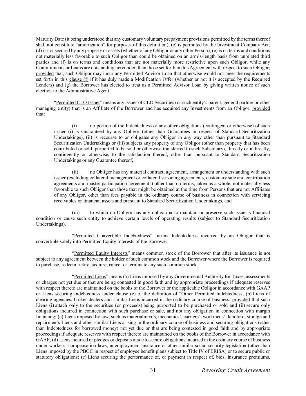 31 Revolving Credit Agreement Maturity Date (it being understood that any customary voluntary prepayment provisions permitted by the terms thereof shall not constitute “amortization” for purposes of this definition), (c) is permitted by the Investment Company Act, (d) is not secured by any property or assets (whether of any Obligor or any other Person), (e) is on terms and conditions not materially less favorable to such Obligor than could be obtained on an arm’s-length basis from unrelated third parties and (f) is on terms and conditions that are not materially more restrictive upon such Obligor, while any Commitments or Loans are outstanding hereunder, than those set forth in this Agreement with respect to such Obligor; provided that, such Obligor may incur any Permitted Advisor Loan that otherwise would not meet the requirements set forth in this clause (f) if it has duly made a Modification Offer (whether or not it is accepted by the Required Lenders) and (g) the Borrower has elected to treat as a Permitted Advisor Loan by giving written notice of such election to the Administrative Agent. “Permitted CLO Issuer” means any issuer of CLO Securities (or such entity’s parent, general partner or other managing entity) that is an Affiliate of the Borrower and has acquired any Investments from an Obligor; provided that: (i) no portion of the Indebtedness or any other obligations (contingent or otherwise) of such issuer (i) is Guaranteed by any Obligor (other than Guarantees in respect of Standard Securitization Undertakings), (ii) is recourse to or obligates any Obligor in any way other than pursuant to Standard Securitization Undertakings or (iii) subjects any property of any Obligor (other than property that has been contributed or sold, purported to be sold or otherwise transferred to such Subsidiary), directly or indirectly, contingently or otherwise, to the satisfaction thereof, other than pursuant to Standard Securitization Undertakings or any Guarantee thereof, (ii) no Obligor has any material contract, agreement, arrangement or understanding with such issuer (excluding collateral management or collateral servicing agreements, customary sale and contribution agreements and master participation agreements) other than on terms, taken as a whole, not materially less favorable to such Obligor than those that might be obtained at the time from Persons that are not Affiliates of any Obligor, other than fees payable in the ordinary course of business in connection with servicing receivables or financial assets and pursuant to Standard Securitization Undertakings, and (iii) to which no Obligor has any obligation to maintain or preserve such issuer’s financial condition or cause such entity to achieve certain levels of operating results (subject to Standard Securitization Undertakings). “Permitted Convertible Indebtedness” means Indebtedness incurred by an Obligor that is convertible solely into Permitted Equity Interests of the Borrower. “Permitted Equity Interests” means common stock of the Borrower that after its issuance is not subject to any agreement between the holder of such common stock and the Borrower where the Borrower is required to purchase, redeem, retire, acquire, cancel or terminate any such common stock. “Permitted Liens” means (a) Liens imposed by any Governmental Authority for Taxes, assessments or charges not yet due or that are being contested in good faith and by appropriate proceedings if adequate reserves with respect thereto are maintained on the books of the Borrower or the applicable Obligor in accordance with GAAP or Liens securing Indebtedness under clause (e) of the definition of “Other Permitted Indebtedness; (b) Liens of clearing agencies, broker-dealers and similar Liens incurred in the ordinary course of business; provided that such Liens (i) attach only to the securities (or proceeds) being purported to be purchased or sold and (ii) secure only obligations incurred in connection with such purchase or sale, and not any obligation in connection with margin financing; (c) Liens imposed by law, such as materialmen’s, mechanics’, carriers’, workmens’, landlord, storage and repairmen’s Liens and other similar Liens arising in the ordinary course of business and securing obligations (other than Indebtedness for borrowed money) not yet due or that are being contested in good faith and by appropriate proceedings if adequate reserves with respect thereto are maintained on the books of the Borrower in accordance with GAAP; (d) Liens incurred or pledges or deposits made to secure obligations incurred in the ordinary course of business under workers’ compensation laws, unemployment insurance or other similar social security legislation (other than Liens imposed by the PBGC in respect of employee benefit plans subject to Title IV of ERISA) or to secure public or statutory obligations; (e) Liens securing the performance of, or payment in respect of, bids, insurance premiums,