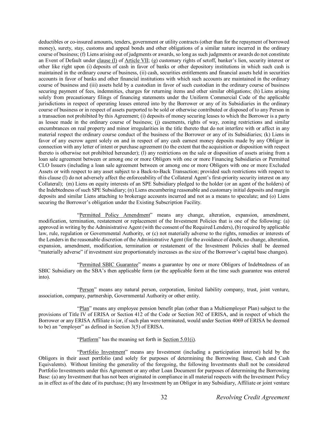 32 Revolving Credit Agreement deductibles or co-insured amounts, tenders, government or utility contracts (other than for the repayment of borrowed money), surety, stay, customs and appeal bonds and other obligations of a similar nature incurred in the ordinary course of business; (f) Liens arising out of judgments or awards, so long as such judgments or awards do not constitute an Event of Default under clause (l) of Article VII; (g) customary rights of setoff, banker’s lien, security interest or other like right upon (i) deposits of cash in favor of banks or other depository institutions in which such cash is maintained in the ordinary course of business, (ii) cash, securities entitlements and financial assets held in securities accounts in favor of banks and other financial institutions with which such accounts are maintained in the ordinary course of business and (iii) assets held by a custodian in favor of such custodian in the ordinary course of business securing payment of fees, indemnities, charges for returning items and other similar obligations; (h) Liens arising solely from precautionary filings of financing statements under the Uniform Commercial Code of the applicable jurisdictions in respect of operating leases entered into by the Borrower or any of its Subsidiaries in the ordinary course of business or in respect of assets purported to be sold or otherwise contributed or disposed of to any Person in a transaction not prohibited by this Agreement; (i) deposits of money securing leases to which the Borrower is a party as lessee made in the ordinary course of business; (j) easements, rights of way, zoning restrictions and similar encumbrances on real property and minor irregularities in the title thereto that do not interfere with or affect in any material respect the ordinary course conduct of the business of the Borrower or any of its Subsidiaries; (k) Liens in favor of any escrow agent solely on and in respect of any cash earnest money deposits made by any Obligor in connection with any letter of intent or purchase agreement (to the extent that the acquisition or disposition with respect thereto is otherwise not prohibited hereunder); (l) any restrictions on the sale or disposition of assets arising from a loan sale agreement between or among one or more Obligors with one or more Financing Subsidiaries or Permitted CLO Issuers (including a loan sale agreement between or among one or more Obligors with one or more Excluded Assets or with respect to any asset subject to a Back-to-Back Transaction; provided such restrictions with respect to this clause (l) do not adversely affect the enforceability of the Collateral Agent’s first-priority security interest on any Collateral); (m) Liens on equity interests of an SPE Subsidiary pledged to the holder (or an agent of the holders) of the Indebtedness of such SPE Subsidiary; (n) Liens encumbering reasonable and customary initial deposits and margin deposits and similar Liens attaching to brokerage accounts incurred and not as a means to speculate; and (o) Liens securing the Borrower’s obligation under the Existing Subscription Facility. “Permitted Policy Amendment” means any change, alteration, expansion, amendment, modification, termination, restatement or replacement of the Investment Policies that is one of the following: (a) approved in writing by the Administrative Agent (with the consent of the Required Lenders), (b) required by applicable law, rule, regulation or Governmental Authority, or (c) not materially adverse to the rights, remedies or interests of the Lenders in the reasonable discretion of the Administrative Agent (for the avoidance of doubt, no change, alteration, expansion, amendment, modification, termination or restatement of the Investment Policies shall be deemed “materially adverse” if investment size proportionately increases as the size of the Borrower’s capital base changes). “Permitted SBIC Guarantee” means a guarantee by one or more Obligors of Indebtedness of an SBIC Subsidiary on the SBA’s then applicable form (or the applicable form at the time such guarantee was entered into). “Person” means any natural person, corporation, limited liability company, trust, joint venture, association, company, partnership, Governmental Authority or other entity. “Plan” means any employee pension benefit plan (other than a Multiemployer Plan) subject to the provisions of Title IV of ERISA or Section 412 of the Code or Section 302 of ERISA, and in respect of which the Borrower or any ERISA Affiliate is (or, if such plan were terminated, would under Section 4069 of ERISA be deemed to be) an “employer” as defined in Section 3(5) of ERISA. “Platform” has the meaning set forth in Section 5.01(i). “Portfolio Investment” means any Investment (including a participation interest) held by the Obligors in their asset portfolio (and solely for purposes of determining the Borrowing Base, Cash and Cash Equivalents). Without limiting the generality of the foregoing, the following Investments shall not be considered Portfolio Investments under this Agreement or any other Loan Document for purposes of determining the Borrowing Base: (a) any Investment that has not been originated in compliance in all material respects with the Investment Policy as in effect as of the date of its purchase; (b) any Investment by an Obligor in any Subsidiary, Affiliate or joint venture