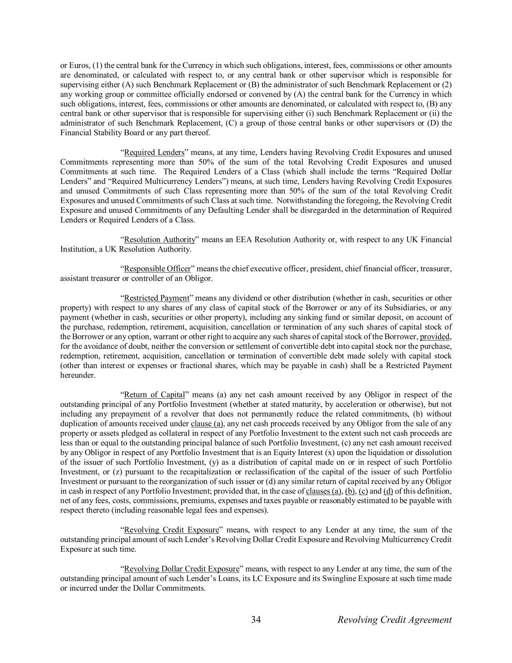 34 Revolving Credit Agreement or Euros, (1) the central bank for the Currency in which such obligations, interest, fees, commissions or other amounts are denominated, or calculated with respect to, or any central bank or other supervisor which is responsible for supervising either (A) such Benchmark Replacement or (B) the administrator of such Benchmark Replacement or (2) any working group or committee officially endorsed or convened by (A) the central bank for the Currency in which such obligations, interest, fees, commissions or other amounts are denominated, or calculated with respect to, (B) any central bank or other supervisor that is responsible for supervising either (i) such Benchmark Replacement or (ii) the administrator of such Benchmark Replacement, (C) a group of those central banks or other supervisors or (D) the Financial Stability Board or any part thereof. “Required Lenders” means, at any time, Lenders having Revolving Credit Exposures and unused Commitments representing more than 50% of the sum of the total Revolving Credit Exposures and unused Commitments at such time. The Required Lenders of a Class (which shall include the terms “Required Dollar Lenders” and “Required Multicurrency Lenders”) means, at such time, Lenders having Revolving Credit Exposures and unused Commitments of such Class representing more than 50% of the sum of the total Revolving Credit Exposures and unused Commitments of such Class at such time. Notwithstanding the foregoing, the Revolving Credit Exposure and unused Commitments of any Defaulting Lender shall be disregarded in the determination of Required Lenders or Required Lenders of a Class. “Resolution Authority” means an EEA Resolution Authority or, with respect to any UK Financial Institution, a UK Resolution Authority. “Responsible Officer” means the chief executive officer, president, chief financial officer, treasurer, assistant treasurer or controller of an Obligor. “Restricted Payment” means any dividend or other distribution (whether in cash, securities or other property) with respect to any shares of any class of capital stock of the Borrower or any of its Subsidiaries, or any payment (whether in cash, securities or other property), including any sinking fund or similar deposit, on account of the purchase, redemption, retirement, acquisition, cancellation or termination of any such shares of capital stock of the Borrower or any option, warrant or other right to acquire any such shares of capital stock of the Borrower, provided, for the avoidance of doubt, neither the conversion or settlement of convertible debt into capital stock nor the purchase, redemption, retirement, acquisition, cancellation or termination of convertible debt made solely with capital stock (other than interest or expenses or fractional shares, which may be payable in cash) shall be a Restricted Payment hereunder. “Return of Capital” means (a) any net cash amount received by any Obligor in respect of the outstanding principal of any Portfolio Investment (whether at stated maturity, by acceleration or otherwise), but not including any prepayment of a revolver that does not permanently reduce the related commitments, (b) without duplication of amounts received under clause (a), any net cash proceeds received by any Obligor from the sale of any property or assets pledged as collateral in respect of any Portfolio Investment to the extent such net cash proceeds are less than or equal to the outstanding principal balance of such Portfolio Investment, (c) any net cash amount received by any Obligor in respect of any Portfolio Investment that is an Equity Interest (x) upon the liquidation or dissolution of the issuer of such Portfolio Investment, (y) as a distribution of capital made on or in respect of such Portfolio Investment, or (z) pursuant to the recapitalization or reclassification of the capital of the issuer of such Portfolio Investment or pursuant to the reorganization of such issuer or (d) any similar return of capital received by any Obligor in cash in respect of any Portfolio Investment; provided that, in the case of clauses (a), (b), (c) and (d) of this definition, net of any fees, costs, commissions, premiums, expenses and taxes payable or reasonably estimated to be payable with respect thereto (including reasonable legal fees and expenses). “Revolving Credit Exposure” means, with respect to any Lender at any time, the sum of the outstanding principal amount of such Lender’s Revolving Dollar Credit Exposure and Revolving Multicurrency Credit Exposure at such time. “Revolving Dollar Credit Exposure” means, with respect to any Lender at any time, the sum of the outstanding principal amount of such Lender’s Loans, its LC Exposure and its Swingline Exposure at such time made or incurred under the Dollar Commitments.