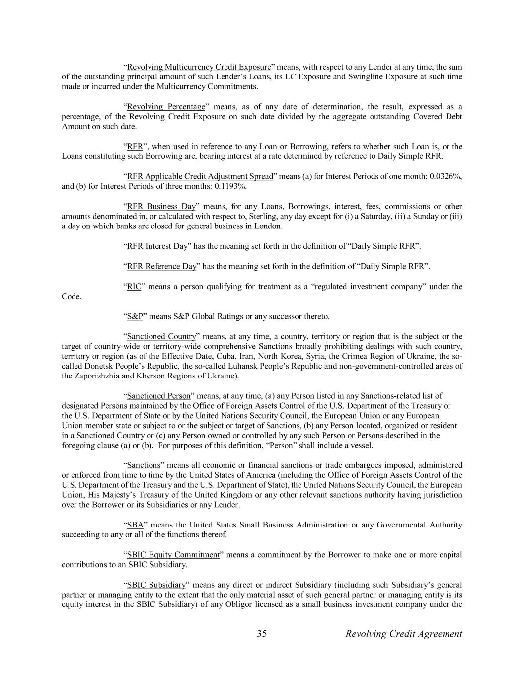 35 Revolving Credit Agreement “Revolving Multicurrency Credit Exposure” means, with respect to any Lender at any time, the sum of the outstanding principal amount of such Lender’s Loans, its LC Exposure and Swingline Exposure at such time made or incurred under the Multicurrency Commitments. “Revolving Percentage” means, as of any date of determination, the result, expressed as a percentage, of the Revolving Credit Exposure on such date divided by the aggregate outstanding Covered Debt Amount on such date. “RFR”, when used in reference to any Loan or Borrowing, refers to whether such Loan is, or the Loans constituting such Borrowing are, bearing interest at a rate determined by reference to Daily Simple RFR. “RFR Applicable Credit Adjustment Spread” means (a) for Interest Periods of one month: 0.0326%, and (b) for Interest Periods of three months: 0.1193%. “RFR Business Day” means, for any Loans, Borrowings, interest, fees, commissions or other amounts denominated in, or calculated with respect to, Sterling, any day except for (i) a Saturday, (ii) a Sunday or (iii) a day on which banks are closed for general business in London. “RFR Interest Day” has the meaning set forth in the definition of “Daily Simple RFR”. “RFR Reference Day” has the meaning set forth in the definition of “Daily Simple RFR”. “RIC” means a person qualifying for treatment as a “regulated investment company” under the Code. “S&P” means S&P Global Ratings or any successor thereto. “Sanctioned Country” means, at any time, a country, territory or region that is the subject or the target of country-wide or territory-wide comprehensive Sanctions broadly prohibiting dealings with such country, territory or region (as of the Effective Date, Cuba, Iran, North Korea, Syria, the Crimea Region of Ukraine, the so- called Donetsk People’s Republic, the so-called Luhansk People’s Republic and non-government-controlled areas of the Zaporizhzhia and Kherson Regions of Ukraine). “Sanctioned Person” means, at any time, (a) any Person listed in any Sanctions-related list of designated Persons maintained by the Office of Foreign Assets Control of the U.S. Department of the Treasury or the U.S. Department of State or by the United Nations Security Council, the European Union or any European Union member state or subject to or the subject or target of Sanctions, (b) any Person located, organized or resident in a Sanctioned Country or (c) any Person owned or controlled by any such Person or Persons described in the foregoing clause (a) or (b). For purposes of this definition, “Person” shall include a vessel. “Sanctions” means all economic or financial sanctions or trade embargoes imposed, administered or enforced from time to time by the United States of America (including the Office of Foreign Assets Control of the U.S. Department of the Treasury and the U.S. Department of State), the United Nations Security Council, the European Union, His Majesty’s Treasury of the United Kingdom or any other relevant sanctions authority having jurisdiction over the Borrower or its Subsidiaries or any Lender. “SBA” means the United States Small Business Administration or any Governmental Authority succeeding to any or all of the functions thereof. “SBIC Equity Commitment” means a commitment by the Borrower to make one or more capital contributions to an SBIC Subsidiary. “SBIC Subsidiary” means any direct or indirect Subsidiary (including such Subsidiary’s general partner or managing entity to the extent that the only material asset of such general partner or managing entity is its equity interest in the SBIC Subsidiary) of any Obligor licensed as a small business investment company under the