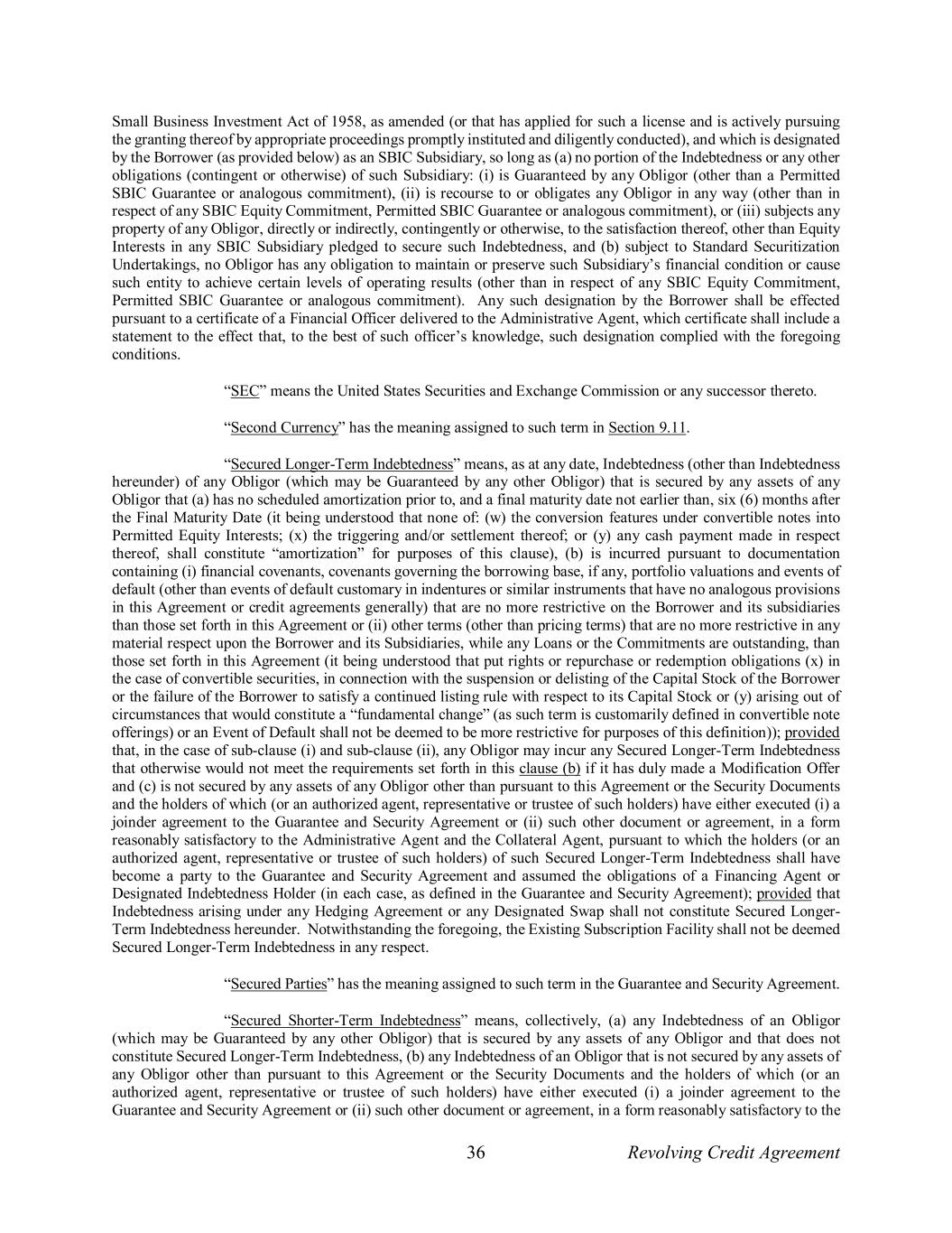 36 Revolving Credit Agreement Small Business Investment Act of 1958, as amended (or that has applied for such a license and is actively pursuing the granting thereof by appropriate proceedings promptly instituted and diligently conducted), and which is designated by the Borrower (as provided below) as an SBIC Subsidiary, so long as (a) no portion of the Indebtedness or any other obligations (contingent or otherwise) of such Subsidiary: (i) is Guaranteed by any Obligor (other than a Permitted SBIC Guarantee or analogous commitment), (ii) is recourse to or obligates any Obligor in any way (other than in respect of any SBIC Equity Commitment, Permitted SBIC Guarantee or analogous commitment), or (iii) subjects any property of any Obligor, directly or indirectly, contingently or otherwise, to the satisfaction thereof, other than Equity Interests in any SBIC Subsidiary pledged to secure such Indebtedness, and (b) subject to Standard Securitization Undertakings, no Obligor has any obligation to maintain or preserve such Subsidiary’s financial condition or cause such entity to achieve certain levels of operating results (other than in respect of any SBIC Equity Commitment, Permitted SBIC Guarantee or analogous commitment). Any such designation by the Borrower shall be effected pursuant to a certificate of a Financial Officer delivered to the Administrative Agent, which certificate shall include a statement to the effect that, to the best of such officer’s knowledge, such designation complied with the foregoing conditions. “SEC” means the United States Securities and Exchange Commission or any successor thereto. “Second Currency” has the meaning assigned to such term in Section 9.11. “Secured Longer-Term Indebtedness” means, as at any date, Indebtedness (other than Indebtedness hereunder) of any Obligor (which may be Guaranteed by any other Obligor) that is secured by any assets of any Obligor that (a) has no scheduled amortization prior to, and a final maturity date not earlier than, six (6) months after the Final Maturity Date (it being understood that none of: (w) the conversion features under convertible notes into Permitted Equity Interests; (x) the triggering and/or settlement thereof; or (y) any cash payment made in respect thereof, shall constitute “amortization” for purposes of this clause), (b) is incurred pursuant to documentation containing (i) financial covenants, covenants governing the borrowing base, if any, portfolio valuations and events of default (other than events of default customary in indentures or similar instruments that have no analogous provisions in this Agreement or credit agreements generally) that are no more restrictive on the Borrower and its subsidiaries than those set forth in this Agreement or (ii) other terms (other than pricing terms) that are no more restrictive in any material respect upon the Borrower and its Subsidiaries, while any Loans or the Commitments are outstanding, than those set forth in this Agreement (it being understood that put rights or repurchase or redemption obligations (x) in the case of convertible securities, in connection with the suspension or delisting of the Capital Stock of the Borrower or the failure of the Borrower to satisfy a continued listing rule with respect to its Capital Stock or (y) arising out of circumstances that would constitute a “fundamental change” (as such term is customarily defined in convertible note offerings) or an Event of Default shall not be deemed to be more restrictive for purposes of this definition)); provided that, in the case of sub-clause (i) and sub-clause (ii), any Obligor may incur any Secured Longer-Term Indebtedness that otherwise would not meet the requirements set forth in this clause (b) if it has duly made a Modification Offer and (c) is not secured by any assets of any Obligor other than pursuant to this Agreement or the Security Documents and the holders of which (or an authorized agent, representative or trustee of such holders) have either executed (i) a joinder agreement to the Guarantee and Security Agreement or (ii) such other document or agreement, in a form reasonably satisfactory to the Administrative Agent and the Collateral Agent, pursuant to which the holders (or an authorized agent, representative or trustee of such holders) of such Secured Longer-Term Indebtedness shall have become a party to the Guarantee and Security Agreement and assumed the obligations of a Financing Agent or Designated Indebtedness Holder (in each case, as defined in the Guarantee and Security Agreement); provided that Indebtedness arising under any Hedging Agreement or any Designated Swap shall not constitute Secured Longer- Term Indebtedness hereunder. Notwithstanding the foregoing, the Existing Subscription Facility shall not be deemed Secured Longer-Term Indebtedness in any respect. “Secured Parties” has the meaning assigned to such term in the Guarantee and Security Agreement. “Secured Shorter-Term Indebtedness” means, collectively, (a) any Indebtedness of an Obligor (which may be Guaranteed by any other Obligor) that is secured by any assets of any Obligor and that does not constitute Secured Longer-Term Indebtedness, (b) any Indebtedness of an Obligor that is not secured by any assets of any Obligor other than pursuant to this Agreement or the Security Documents and the holders of which (or an authorized agent, representative or trustee of such holders) have either executed (i) a joinder agreement to the Guarantee and Security Agreement or (ii) such other document or agreement, in a form reasonably satisfactory to the