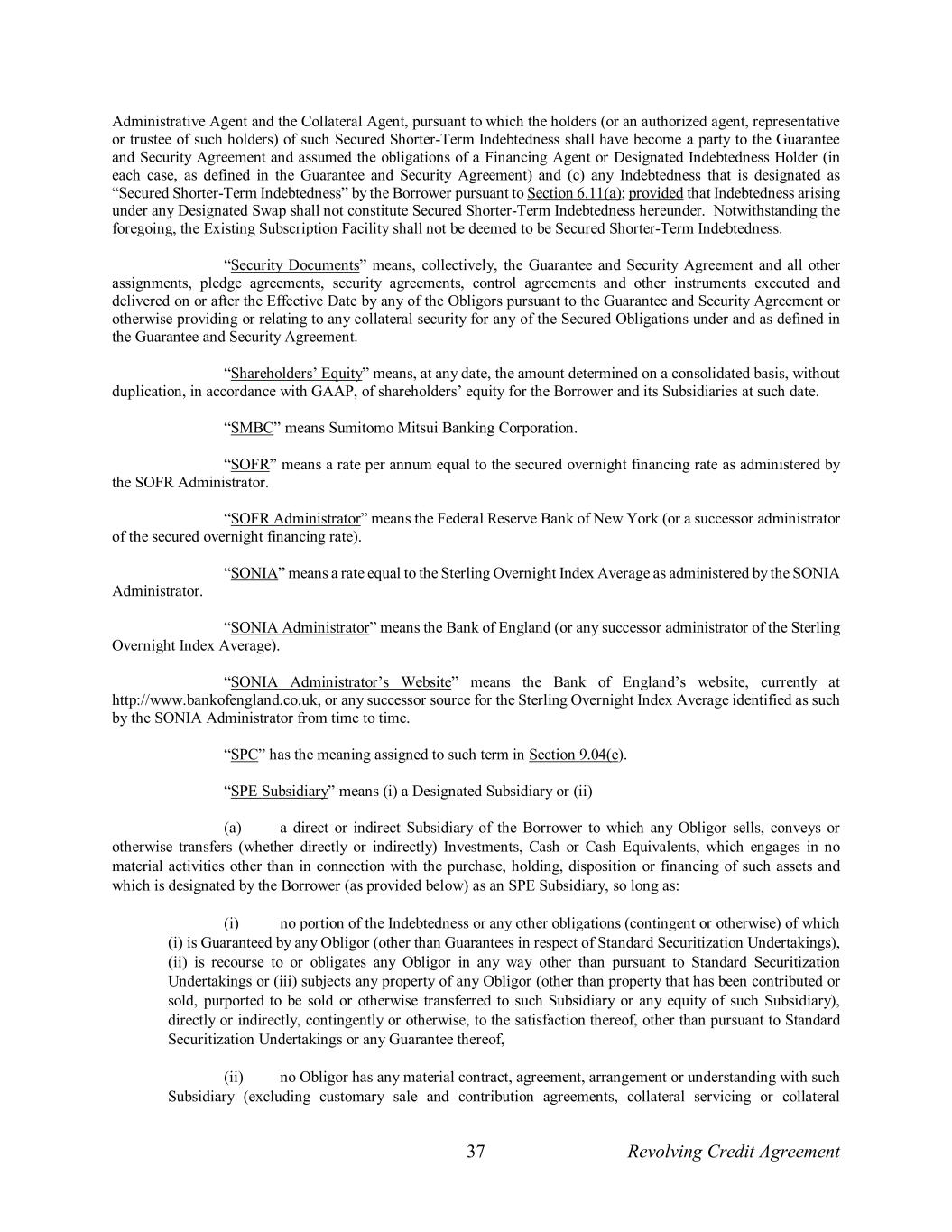 37 Revolving Credit Agreement Administrative Agent and the Collateral Agent, pursuant to which the holders (or an authorized agent, representative or trustee of such holders) of such Secured Shorter-Term Indebtedness shall have become a party to the Guarantee and Security Agreement and assumed the obligations of a Financing Agent or Designated Indebtedness Holder (in each case, as defined in the Guarantee and Security Agreement) and (c) any Indebtedness that is designated as “Secured Shorter-Term Indebtedness” by the Borrower pursuant to Section 6.11(a); provided that Indebtedness arising under any Designated Swap shall not constitute Secured Shorter-Term Indebtedness hereunder. Notwithstanding the foregoing, the Existing Subscription Facility shall not be deemed to be Secured Shorter-Term Indebtedness. “Security Documents” means, collectively, the Guarantee and Security Agreement and all other assignments, pledge agreements, security agreements, control agreements and other instruments executed and delivered on or after the Effective Date by any of the Obligors pursuant to the Guarantee and Security Agreement or otherwise providing or relating to any collateral security for any of the Secured Obligations under and as defined in the Guarantee and Security Agreement. “Shareholders’ Equity” means, at any date, the amount determined on a consolidated basis, without duplication, in accordance with GAAP, of shareholders’ equity for the Borrower and its Subsidiaries at such date. “SMBC” means Sumitomo Mitsui Banking Corporation. “SOFR” means a rate per annum equal to the secured overnight financing rate as administered by the SOFR Administrator. “SOFR Administrator” means the Federal Reserve Bank of New York (or a successor administrator of the secured overnight financing rate). “SONIA” means a rate equal to the Sterling Overnight Index Average as administered by the SONIA Administrator. “SONIA Administrator” means the Bank of England (or any successor administrator of the Sterling Overnight Index Average). “SONIA Administrator’s Website” means the Bank of England’s website, currently at http://www.bankofengland.co.uk, or any successor source for the Sterling Overnight Index Average identified as such by the SONIA Administrator from time to time. “SPC” has the meaning assigned to such term in Section 9.04(e). “SPE Subsidiary” means (i) a Designated Subsidiary or (ii) (a) a direct or indirect Subsidiary of the Borrower to which any Obligor sells, conveys or otherwise transfers (whether directly or indirectly) Investments, Cash or Cash Equivalents, which engages in no material activities other than in connection with the purchase, holding, disposition or financing of such assets and which is designated by the Borrower (as provided below) as an SPE Subsidiary, so long as: (i) no portion of the Indebtedness or any other obligations (contingent or otherwise) of which (i) is Guaranteed by any Obligor (other than Guarantees in respect of Standard Securitization Undertakings), (ii) is recourse to or obligates any Obligor in any way other than pursuant to Standard Securitization Undertakings or (iii) subjects any property of any Obligor (other than property that has been contributed or sold, purported to be sold or otherwise transferred to such Subsidiary or any equity of such Subsidiary), directly or indirectly, contingently or otherwise, to the satisfaction thereof, other than pursuant to Standard Securitization Undertakings or any Guarantee thereof, (ii) no Obligor has any material contract, agreement, arrangement or understanding with such Subsidiary (excluding customary sale and contribution agreements, collateral servicing or collateral