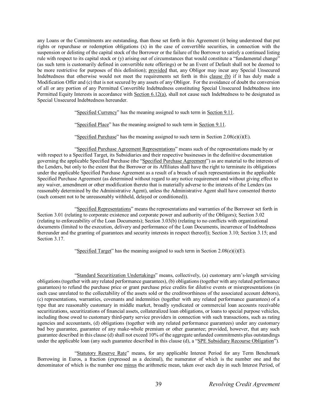 39 Revolving Credit Agreement any Loans or the Commitments are outstanding, than those set forth in this Agreement (it being understood that put rights or repurchase or redemption obligations (x) in the case of convertible securities, in connection with the suspension or delisting of the capital stock of the Borrower or the failure of the Borrower to satisfy a continued listing rule with respect to its capital stock or (y) arising out of circumstances that would constitute a “fundamental change” (as such term is customarily defined in convertible note offerings) or be an Event of Default shall not be deemed to be more restrictive for purposes of this definition); provided that, any Obligor may incur any Special Unsecured Indebtedness that otherwise would not meet the requirements set forth in this clause (b) if it has duly made a Modification Offer and (c) that is not secured by any assets of any Obligor. For the avoidance of doubt the conversion of all or any portion of any Permitted Convertible Indebtedness constituting Special Unsecured Indebtedness into Permitted Equity Interests in accordance with Section 6.12(a), shall not cause such Indebtedness to be designated as Special Unsecured Indebtedness hereunder. “Specified Currency” has the meaning assigned to such term in Section 9.11. “Specified Place” has the meaning assigned to such term in Section 9.11. “Specified Purchase” has the meaning assigned to such term in Section 2.08(e)(i)(E). “Specified Purchase Agreement Representations” means such of the representations made by or with respect to a Specified Target, its Subsidiaries and their respective businesses in the definitive documentation governing the applicable Specified Purchase (the “Specified Purchase Agreement”) as are material to the interests of the Lenders, but only to the extent that the Borrower or its Affiliates shall have the right to terminate its obligations under the applicable Specified Purchase Agreement as a result of a breach of such representations in the applicable Specified Purchase Agreement (as determined without regard to any notice requirement and without giving effect to any waiver, amendment or other modification thereto that is materially adverse to the interests of the Lenders (as reasonably determined by the Administrative Agent), unless the Administrative Agent shall have consented thereto (such consent not to be unreasonably withheld, delayed or conditioned)). “Specified Representations” means the representations and warranties of the Borrower set forth in Section 3.01 (relating to corporate existence and corporate power and authority of the Obligors); Section 3.02 (relating to enforceability of the Loan Documents); Section 3.03(b) (relating to no conflicts with organizational documents (limited to the execution, delivery and performance of the Loan Documents, incurrence of Indebtedness thereunder and the granting of guarantees and security interests in respect thereof)); Section 3.10; Section 3.15; and Section 3.17. “Specified Target” has the meaning assigned to such term in Section 2.08(e)(i)(E). “Standard Securitization Undertakings” means, collectively, (a) customary arm’s-length servicing obligations (together with any related performance guarantees), (b) obligations (together with any related performance guarantees) to refund the purchase price or grant purchase price credits for dilutive events or misrepresentations (in each case unrelated to the collectability of the assets sold or the creditworthiness of the associated account debtors), (c) representations, warranties, covenants and indemnities (together with any related performance guarantees) of a type that are reasonably customary in middle market, broadly syndicated or commercial loan accounts receivable securitizations, securitizations of financial assets, collateralized loan obligations, or loans to special purpose vehicles, including those owed to customary third-party service providers in connection with such transactions, such as rating agencies and accountants, (d) obligations (together with any related performance guarantees) under any customary bad boy guarantee, guarantee of any make-whole premium or other guarantee; provided, however, that any such guarantee described in this clause (d) shall not exceed 10% of the aggregate unfunded commitments plus outstandings under the applicable loan (any such guarantee described in this clause (d), a “SPE Subsidiary Recourse Obligation”). “Statutory Reserve Rate” means, for any applicable Interest Period for any Term Benchmark Borrowing in Euros, a fraction (expressed as a decimal), the numerator of which is the number one and the denominator of which is the number one minus the arithmetic mean, taken over each day in such Interest Period, of