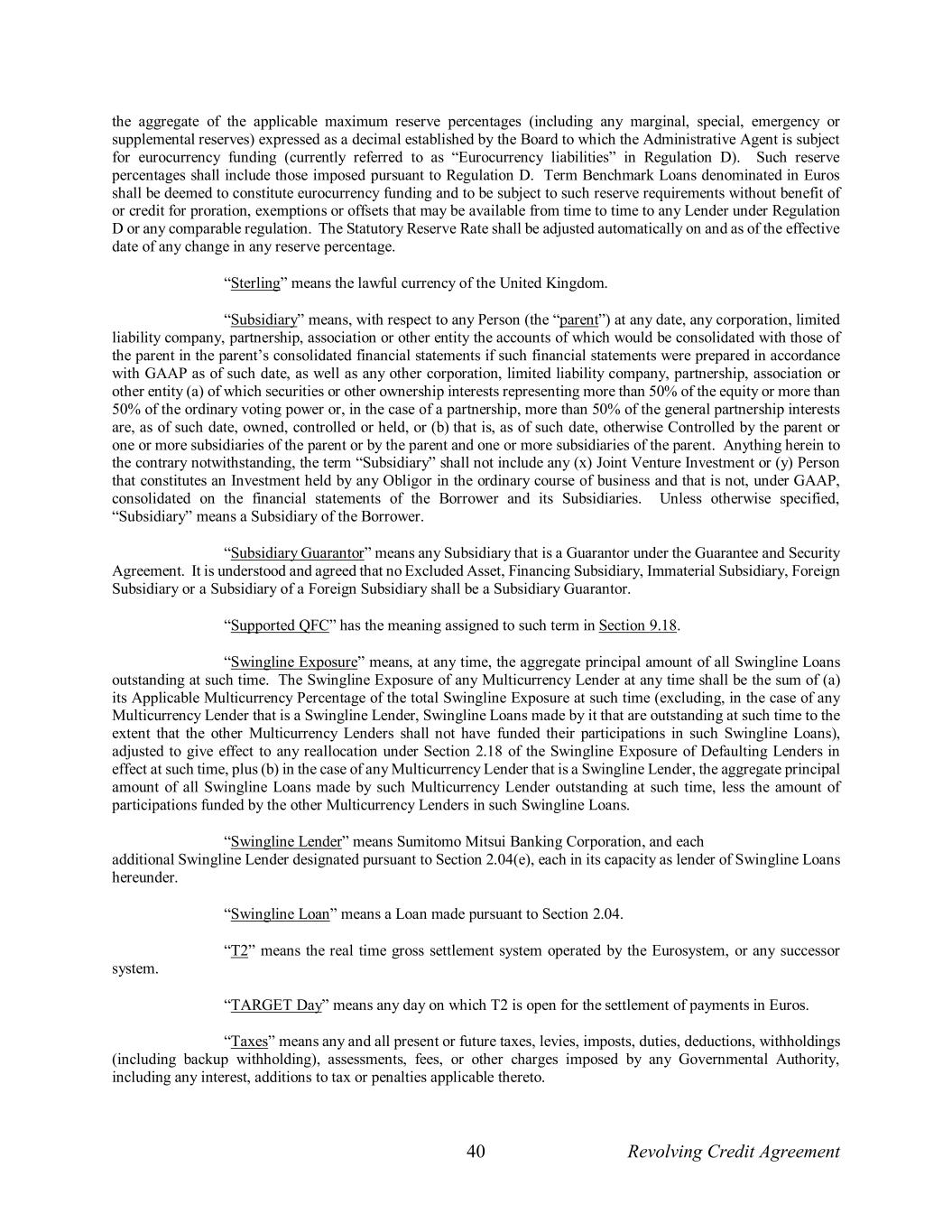 40 Revolving Credit Agreement the aggregate of the applicable maximum reserve percentages (including any marginal, special, emergency or supplemental reserves) expressed as a decimal established by the Board to which the Administrative Agent is subject for eurocurrency funding (currently referred to as “Eurocurrency liabilities” in Regulation D). Such reserve percentages shall include those imposed pursuant to Regulation D. Term Benchmark Loans denominated in Euros shall be deemed to constitute eurocurrency funding and to be subject to such reserve requirements without benefit of or credit for proration, exemptions or offsets that may be available from time to time to any Lender under Regulation D or any comparable regulation. The Statutory Reserve Rate shall be adjusted automatically on and as of the effective date of any change in any reserve percentage. “Sterling” means the lawful currency of the United Kingdom. “Subsidiary” means, with respect to any Person (the “parent”) at any date, any corporation, limited liability company, partnership, association or other entity the accounts of which would be consolidated with those of the parent in the parent’s consolidated financial statements if such financial statements were prepared in accordance with GAAP as of such date, as well as any other corporation, limited liability company, partnership, association or other entity (a) of which securities or other ownership interests representing more than 50% of the equity or more than 50% of the ordinary voting power or, in the case of a partnership, more than 50% of the general partnership interests are, as of such date, owned, controlled or held, or (b) that is, as of such date, otherwise Controlled by the parent or one or more subsidiaries of the parent or by the parent and one or more subsidiaries of the parent. Anything herein to the contrary notwithstanding, the term “Subsidiary” shall not include any (x) Joint Venture Investment or (y) Person that constitutes an Investment held by any Obligor in the ordinary course of business and that is not, under GAAP, consolidated on the financial statements of the Borrower and its Subsidiaries. Unless otherwise specified, “Subsidiary” means a Subsidiary of the Borrower. “Subsidiary Guarantor” means any Subsidiary that is a Guarantor under the Guarantee and Security Agreement. It is understood and agreed that no Excluded Asset, Financing Subsidiary, Immaterial Subsidiary, Foreign Subsidiary or a Subsidiary of a Foreign Subsidiary shall be a Subsidiary Guarantor. “Supported QFC” has the meaning assigned to such term in Section 9.18. “Swingline Exposure” means, at any time, the aggregate principal amount of all Swingline Loans outstanding at such time. The Swingline Exposure of any Multicurrency Lender at any time shall be the sum of (a) its Applicable Multicurrency Percentage of the total Swingline Exposure at such time (excluding, in the case of any Multicurrency Lender that is a Swingline Lender, Swingline Loans made by it that are outstanding at such time to the extent that the other Multicurrency Lenders shall not have funded their participations in such Swingline Loans), adjusted to give effect to any reallocation under Section 2.18 of the Swingline Exposure of Defaulting Lenders in effect at such time, plus (b) in the case of any Multicurrency Lender that is a Swingline Lender, the aggregate principal amount of all Swingline Loans made by such Multicurrency Lender outstanding at such time, less the amount of participations funded by the other Multicurrency Lenders in such Swingline Loans. “Swingline Lender” means Sumitomo Mitsui Banking Corporation, and each additional Swingline Lender designated pursuant to Section 2.04(e), each in its capacity as lender of Swingline Loans hereunder. “Swingline Loan” means a Loan made pursuant to Section 2.04. “T2” means the real time gross settlement system operated by the Eurosystem, or any successor system. “TARGET Day” means any day on which T2 is open for the settlement of payments in Euros. “Taxes” means any and all present or future taxes, levies, imposts, duties, deductions, withholdings (including backup withholding), assessments, fees, or other charges imposed by any Governmental Authority, including any interest, additions to tax or penalties applicable thereto.