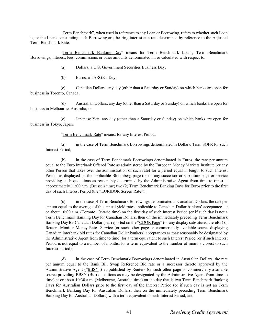 41 Revolving Credit Agreement “Term Benchmark”, when used in reference to any Loan or Borrowing, refers to whether such Loan is, or the Loans constituting such Borrowing are, bearing interest at a rate determined by reference to the Adjusted Term Benchmark Rate. “Term Benchmark Banking Day” means for Term Benchmark Loans, Term Benchmark Borrowings, interest, fees, commissions or other amounts denominated in, or calculated with respect to: (a) Dollars, a U.S. Government Securities Business Day; (b) Euros, a TARGET Day; (c) Canadian Dollars, any day (other than a Saturday or Sunday) on which banks are open for business in Toronto, Canada; (d) Australian Dollars, any day (other than a Saturday or Sunday) on which banks are open for business in Melbourne, Australia; or (e) Japanese Yen, any day (other than a Saturday or Sunday) on which banks are open for business in Tokyo, Japan. “Term Benchmark Rate” means, for any Interest Period: (a) in the case of Term Benchmark Borrowings denominated in Dollars, Term SOFR for such Interest Period; (b) in the case of Term Benchmark Borrowings denominated in Euros, the rate per annum equal to the Euro Interbank Offered Rate as administered by the European Money Markets Institute (or any other Person that takes over the administration of such rate) for a period equal in length to such Interest Period, as displayed on the applicable Bloomberg page (or on any successor or substitute page or service providing such quotations as reasonably determined by the Administrative Agent from time to time) at approximately 11:00 a.m. (Brussels time) two (2) Term Benchmark Banking Days for Euros prior to the first day of such Interest Period (the “EURIBOR Screen Rate”); (c) in the case of Term Benchmark Borrowings denominated in Canadian Dollars, the rate per annum equal to the average of the annual yield rates applicable to Canadian Dollar bankers’ acceptances at or about 10:00 a.m. (Toronto, Ontario time) on the first day of such Interest Period (or if such day is not a Term Benchmark Banking Day for Canadian Dollars, then on the immediately preceding Term Benchmark Banking Day for Canadian Dollars) as reported on the “CDOR Page” (or any display substituted therefor) of Reuters Monitor Money Rates Service (or such other page or commercially available source displaying Canadian interbank bid rates for Canadian Dollar bankers’ acceptances as may reasonably be designated by the Administrative Agent from time to time) for a term equivalent to such Interest Period (or if such Interest Period is not equal to a number of months, for a term equivalent to the number of months closest to such Interest Period); (d) in the case of Term Benchmark Borrowings denominated in Australian Dollars, the rate per annum equal to the Bank Bill Swap Reference Bid rate or a successor thereto approved by the Administrative Agent (“BBSY”) as published by Reuters (or such other page or commercially available source providing BBSY (Bid) quotations as may be designated by the Administrative Agent from time to time) at or about 10:30 a.m. (Melbourne, Australia time) on the day that is two Term Benchmark Banking Days for Australian Dollars prior to the first day of the Interest Period (or if such day is not an Term Benchmark Banking Day for Australian Dollars, then on the immediately preceding Term Benchmark Banking Day for Australian Dollars) with a term equivalent to such Interest Period; and