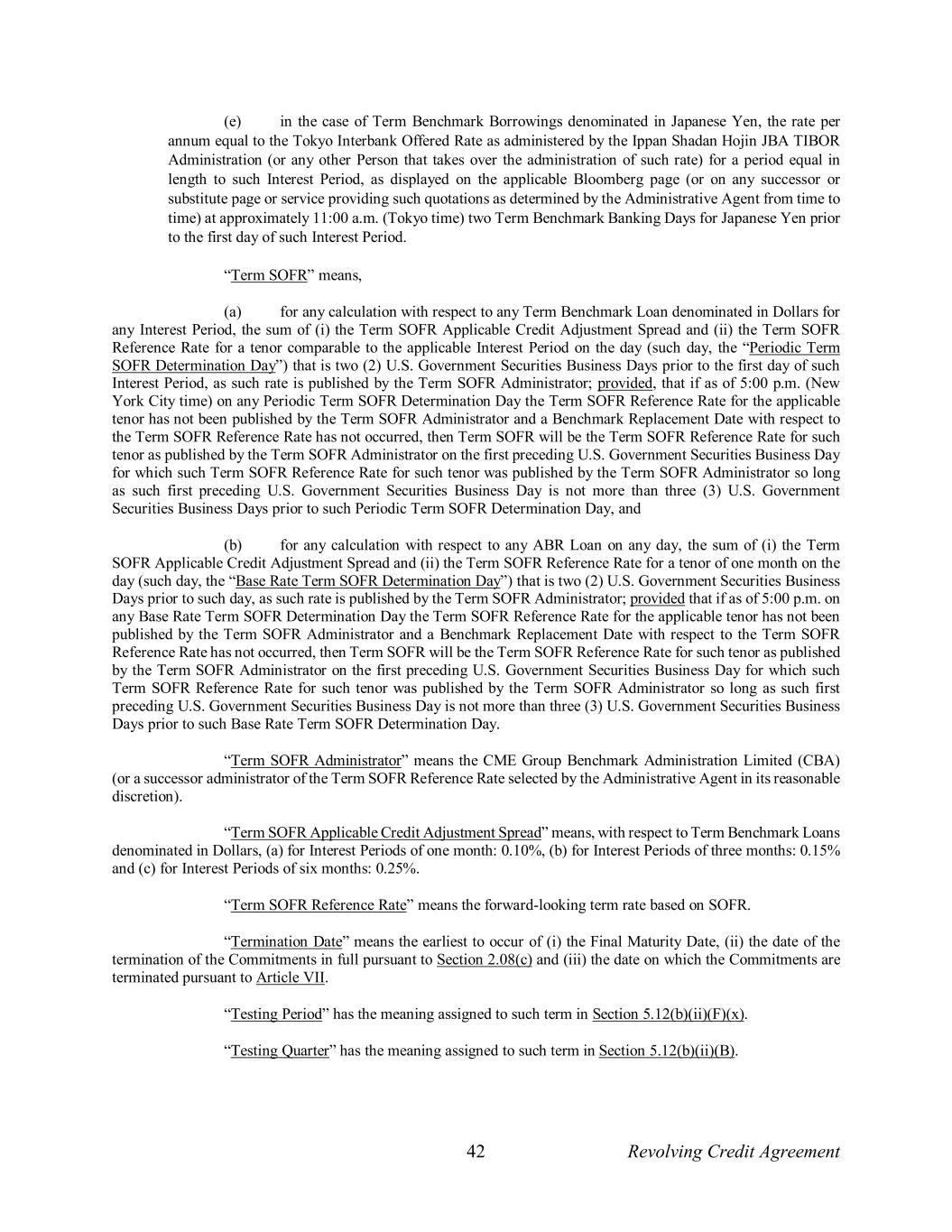 42 Revolving Credit Agreement (e) in the case of Term Benchmark Borrowings denominated in Japanese Yen, the rate per annum equal to the Tokyo Interbank Offered Rate as administered by the Ippan Shadan Hojin JBA TIBOR Administration (or any other Person that takes over the administration of such rate) for a period equal in length to such Interest Period, as displayed on the applicable Bloomberg page (or on any successor or substitute page or service providing such quotations as determined by the Administrative Agent from time to time) at approximately 11:00 a.m. (Tokyo time) two Term Benchmark Banking Days for Japanese Yen prior to the first day of such Interest Period. “Term SOFR” means, (a) for any calculation with respect to any Term Benchmark Loan denominated in Dollars for any Interest Period, the sum of (i) the Term SOFR Applicable Credit Adjustment Spread and (ii) the Term SOFR Reference Rate for a tenor comparable to the applicable Interest Period on the day (such day, the “Periodic Term SOFR Determination Day”) that is two (2) U.S. Government Securities Business Days prior to the first day of such Interest Period, as such rate is published by the Term SOFR Administrator; provided, that if as of 5:00 p.m. (New York City time) on any Periodic Term SOFR Determination Day the Term SOFR Reference Rate for the applicable tenor has not been published by the Term SOFR Administrator and a Benchmark Replacement Date with respect to the Term SOFR Reference Rate has not occurred, then Term SOFR will be the Term SOFR Reference Rate for such tenor as published by the Term SOFR Administrator on the first preceding U.S. Government Securities Business Day for which such Term SOFR Reference Rate for such tenor was published by the Term SOFR Administrator so long as such first preceding U.S. Government Securities Business Day is not more than three (3) U.S. Government Securities Business Days prior to such Periodic Term SOFR Determination Day, and (b) for any calculation with respect to any ABR Loan on any day, the sum of (i) the Term SOFR Applicable Credit Adjustment Spread and (ii) the Term SOFR Reference Rate for a tenor of one month on the day (such day, the “Base Rate Term SOFR Determination Day”) that is two (2) U.S. Government Securities Business Days prior to such day, as such rate is published by the Term SOFR Administrator; provided that if as of 5:00 p.m. on any Base Rate Term SOFR Determination Day the Term SOFR Reference Rate for the applicable tenor has not been published by the Term SOFR Administrator and a Benchmark Replacement Date with respect to the Term SOFR Reference Rate has not occurred, then Term SOFR will be the Term SOFR Reference Rate for such tenor as published by the Term SOFR Administrator on the first preceding U.S. Government Securities Business Day for which such Term SOFR Reference Rate for such tenor was published by the Term SOFR Administrator so long as such first preceding U.S. Government Securities Business Day is not more than three (3) U.S. Government Securities Business Days prior to such Base Rate Term SOFR Determination Day. “Term SOFR Administrator” means the CME Group Benchmark Administration Limited (CBA) (or a successor administrator of the Term SOFR Reference Rate selected by the Administrative Agent in its reasonable discretion). “Term SOFR Applicable Credit Adjustment Spread” means, with respect to Term Benchmark Loans denominated in Dollars, (a) for Interest Periods of one month: 0.10%, (b) for Interest Periods of three months: 0.15% and (c) for Interest Periods of six months: 0.25%. “Term SOFR Reference Rate” means the forward-looking term rate based on SOFR. “Termination Date” means the earliest to occur of (i) the Final Maturity Date, (ii) the date of the termination of the Commitments in full pursuant to Section 2.08(c) and (iii) the date on which the Commitments are terminated pursuant to Article VII. “Testing Period” has the meaning assigned to such term in Section 5.12(b)(ii)(F)(x). “Testing Quarter” has the meaning assigned to such term in Section 5.12(b)(ii)(B).