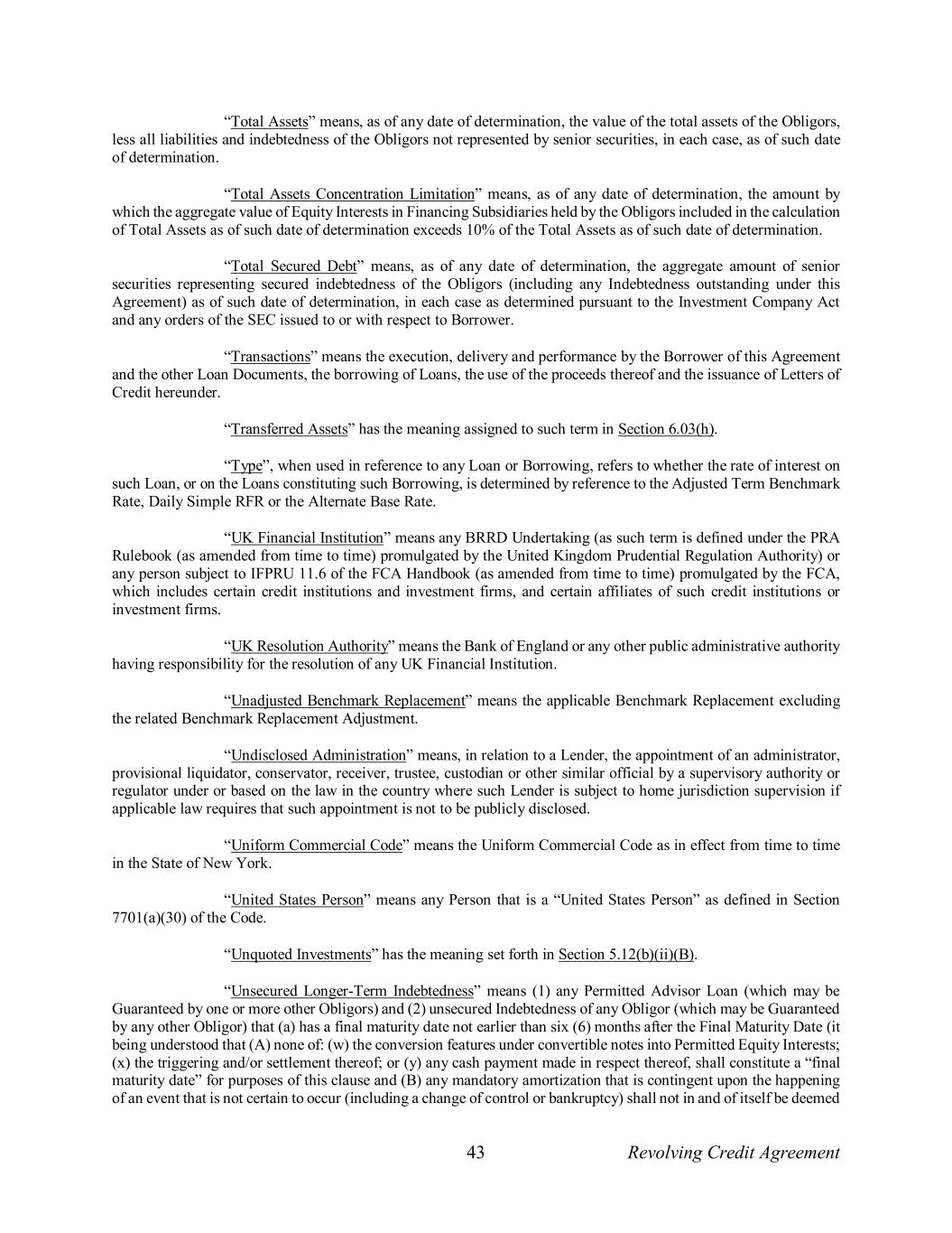 43 Revolving Credit Agreement “Total Assets” means, as of any date of determination, the value of the total assets of the Obligors, less all liabilities and indebtedness of the Obligors not represented by senior securities, in each case, as of such date of determination. “Total Assets Concentration Limitation” means, as of any date of determination, the amount by which the aggregate value of Equity Interests in Financing Subsidiaries held by the Obligors included in the calculation of Total Assets as of such date of determination exceeds 10% of the Total Assets as of such date of determination. “Total Secured Debt” means, as of any date of determination, the aggregate amount of senior securities representing secured indebtedness of the Obligors (including any Indebtedness outstanding under this Agreement) as of such date of determination, in each case as determined pursuant to the Investment Company Act and any orders of the SEC issued to or with respect to Borrower. “Transactions” means the execution, delivery and performance by the Borrower of this Agreement and the other Loan Documents, the borrowing of Loans, the use of the proceeds thereof and the issuance of Letters of Credit hereunder. “Transferred Assets” has the meaning assigned to such term in Section 6.03(h). “Type”, when used in reference to any Loan or Borrowing, refers to whether the rate of interest on such Loan, or on the Loans constituting such Borrowing, is determined by reference to the Adjusted Term Benchmark Rate, Daily Simple RFR or the Alternate Base Rate. “UK Financial Institution” means any BRRD Undertaking (as such term is defined under the PRA Rulebook (as amended from time to time) promulgated by the United Kingdom Prudential Regulation Authority) or any person subject to IFPRU 11.6 of the FCA Handbook (as amended from time to time) promulgated by the FCA, which includes certain credit institutions and investment firms, and certain affiliates of such credit institutions or investment firms. “UK Resolution Authority” means the Bank of England or any other public administrative authority having responsibility for the resolution of any UK Financial Institution. “Unadjusted Benchmark Replacement” means the applicable Benchmark Replacement excluding the related Benchmark Replacement Adjustment. “Undisclosed Administration” means, in relation to a Lender, the appointment of an administrator, provisional liquidator, conservator, receiver, trustee, custodian or other similar official by a supervisory authority or regulator under or based on the law in the country where such Lender is subject to home jurisdiction supervision if applicable law requires that such appointment is not to be publicly disclosed. “Uniform Commercial Code” means the Uniform Commercial Code as in effect from time to time in the State of New York. “United States Person” means any Person that is a “United States Person” as defined in Section 7701(a)(30) of the Code. “Unquoted Investments” has the meaning set forth in Section 5.12(b)(ii)(B). “Unsecured Longer-Term Indebtedness” means (1) any Permitted Advisor Loan (which may be Guaranteed by one or more other Obligors) and (2) unsecured Indebtedness of any Obligor (which may be Guaranteed by any other Obligor) that (a) has a final maturity date not earlier than six (6) months after the Final Maturity Date (it being understood that (A) none of: (w) the conversion features under convertible notes into Permitted Equity Interests; (x) the triggering and/or settlement thereof; or (y) any cash payment made in respect thereof, shall constitute a “final maturity date” for purposes of this clause and (B) any mandatory amortization that is contingent upon the happening of an event that is not certain to occur (including a change of control or bankruptcy) shall not in and of itself be deemed