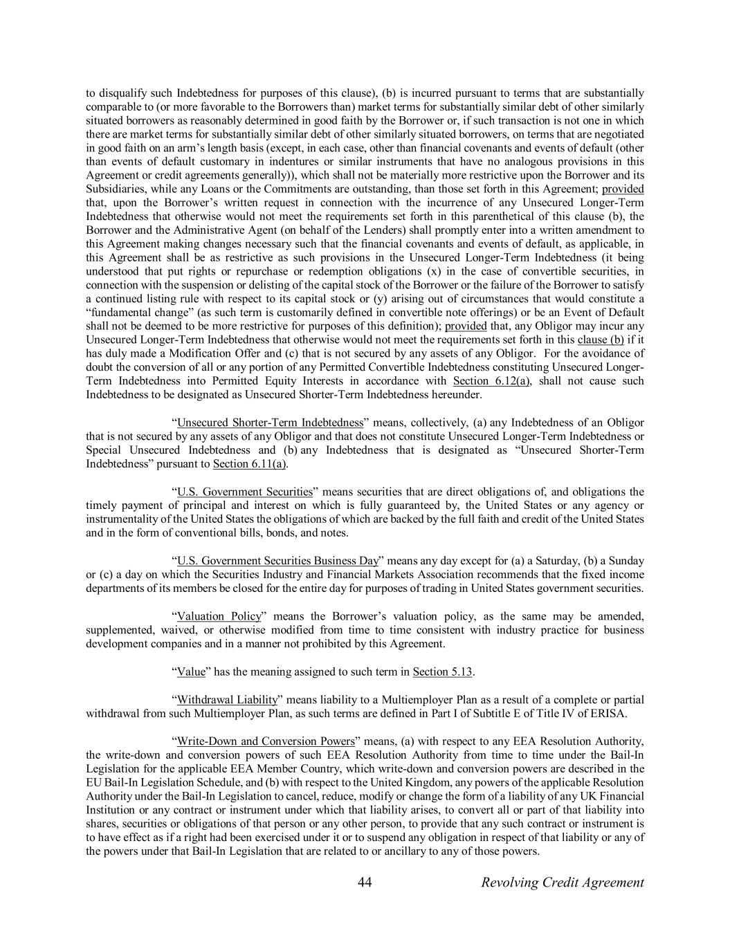 44 Revolving Credit Agreement to disqualify such Indebtedness for purposes of this clause), (b) is incurred pursuant to terms that are substantially comparable to (or more favorable to the Borrowers than) market terms for substantially similar debt of other similarly situated borrowers as reasonably determined in good faith by the Borrower or, if such transaction is not one in which there are market terms for substantially similar debt of other similarly situated borrowers, on terms that are negotiated in good faith on an arm’s length basis (except, in each case, other than financial covenants and events of default (other than events of default customary in indentures or similar instruments that have no analogous provisions in this Agreement or credit agreements generally)), which shall not be materially more restrictive upon the Borrower and its Subsidiaries, while any Loans or the Commitments are outstanding, than those set forth in this Agreement; provided that, upon the Borrower’s written request in connection with the incurrence of any Unsecured Longer-Term Indebtedness that otherwise would not meet the requirements set forth in this parenthetical of this clause (b), the Borrower and the Administrative Agent (on behalf of the Lenders) shall promptly enter into a written amendment to this Agreement making changes necessary such that the financial covenants and events of default, as applicable, in this Agreement shall be as restrictive as such provisions in the Unsecured Longer-Term Indebtedness (it being understood that put rights or repurchase or redemption obligations (x) in the case of convertible securities, in connection with the suspension or delisting of the capital stock of the Borrower or the failure of the Borrower to satisfy a continued listing rule with respect to its capital stock or (y) arising out of circumstances that would constitute a “fundamental change” (as such term is customarily defined in convertible note offerings) or be an Event of Default shall not be deemed to be more restrictive for purposes of this definition); provided that, any Obligor may incur any Unsecured Longer-Term Indebtedness that otherwise would not meet the requirements set forth in this clause (b) if it has duly made a Modification Offer and (c) that is not secured by any assets of any Obligor. For the avoidance of doubt the conversion of all or any portion of any Permitted Convertible Indebtedness constituting Unsecured Longer- Term Indebtedness into Permitted Equity Interests in accordance with Section 6.12(a), shall not cause such Indebtedness to be designated as Unsecured Shorter-Term Indebtedness hereunder. “Unsecured Shorter-Term Indebtedness” means, collectively, (a) any Indebtedness of an Obligor that is not secured by any assets of any Obligor and that does not constitute Unsecured Longer-Term Indebtedness or Special Unsecured Indebtedness and (b) any Indebtedness that is designated as “Unsecured Shorter-Term Indebtedness” pursuant to Section 6.11(a). “U.S. Government Securities” means securities that are direct obligations of, and obligations the timely payment of principal and interest on which is fully guaranteed by, the United States or any agency or instrumentality of the United States the obligations of which are backed by the full faith and credit of the United States and in the form of conventional bills, bonds, and notes. “U.S. Government Securities Business Day” means any day except for (a) a Saturday, (b) a Sunday or (c) a day on which the Securities Industry and Financial Markets Association recommends that the fixed income departments of its members be closed for the entire day for purposes of trading in United States government securities. “Valuation Policy” means the Borrower’s valuation policy, as the same may be amended, supplemented, waived, or otherwise modified from time to time consistent with industry practice for business development companies and in a manner not prohibited by this Agreement. “Value” has the meaning assigned to such term in Section 5.13. “Withdrawal Liability” means liability to a Multiemployer Plan as a result of a complete or partial withdrawal from such Multiemployer Plan, as such terms are defined in Part I of Subtitle E of Title IV of ERISA. “Write-Down and Conversion Powers” means, (a) with respect to any EEA Resolution Authority, the write-down and conversion powers of such EEA Resolution Authority from time to time under the Bail-In Legislation for the applicable EEA Member Country, which write-down and conversion powers are described in the EU Bail-In Legislation Schedule, and (b) with respect to the United Kingdom, any powers of the applicable Resolution Authority under the Bail-In Legislation to cancel, reduce, modify or change the form of a liability of any UK Financial Institution or any contract or instrument under which that liability arises, to convert all or part of that liability into shares, securities or obligations of that person or any other person, to provide that any such contract or instrument is to have effect as if a right had been exercised under it or to suspend any obligation in respect of that liability or any of the powers under that Bail-In Legislation that are related to or ancillary to any of those powers.