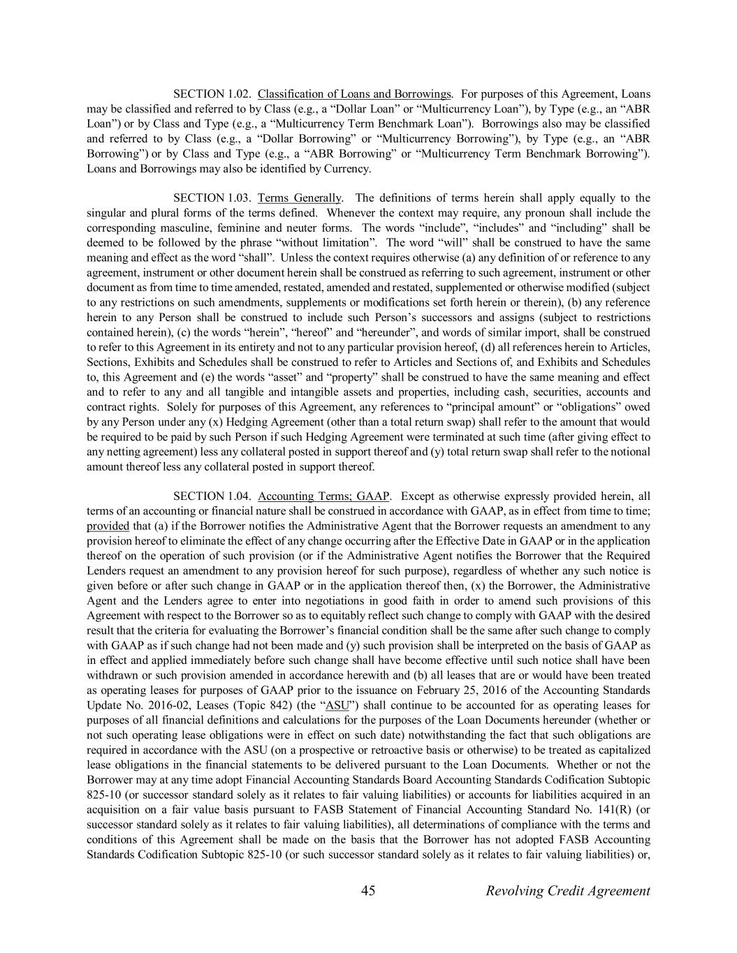 45 Revolving Credit Agreement SECTION 1.02. Classification of Loans and Borrowings. For purposes of this Agreement, Loans may be classified and referred to by Class (e.g., a “Dollar Loan” or “Multicurrency Loan”), by Type (e.g., an “ABR Loan”) or by Class and Type (e.g., a “Multicurrency Term Benchmark Loan”). Borrowings also may be classified and referred to by Class (e.g., a “Dollar Borrowing” or “Multicurrency Borrowing”), by Type (e.g., an “ABR Borrowing”) or by Class and Type (e.g., a “ABR Borrowing” or “Multicurrency Term Benchmark Borrowing”). Loans and Borrowings may also be identified by Currency. SECTION 1.03. Terms Generally. The definitions of terms herein shall apply equally to the singular and plural forms of the terms defined. Whenever the context may require, any pronoun shall include the corresponding masculine, feminine and neuter forms. The words “include”, “includes” and “including” shall be deemed to be followed by the phrase “without limitation”. The word “will” shall be construed to have the same meaning and effect as the word “shall”. Unless the context requires otherwise (a) any definition of or reference to any agreement, instrument or other document herein shall be construed as referring to such agreement, instrument or other document as from time to time amended, restated, amended and restated, supplemented or otherwise modified (subject to any restrictions on such amendments, supplements or modifications set forth herein or therein), (b) any reference herein to any Person shall be construed to include such Person’s successors and assigns (subject to restrictions contained herein), (c) the words “herein”, “hereof” and “hereunder”, and words of similar import, shall be construed to refer to this Agreement in its entirety and not to any particular provision hereof, (d) all references herein to Articles, Sections, Exhibits and Schedules shall be construed to refer to Articles and Sections of, and Exhibits and Schedules to, this Agreement and (e) the words “asset” and “property” shall be construed to have the same meaning and effect and to refer to any and all tangible and intangible assets and properties, including cash, securities, accounts and contract rights. Solely for purposes of this Agreement, any references to “principal amount” or “obligations” owed by any Person under any (x) Hedging Agreement (other than a total return swap) shall refer to the amount that would be required to be paid by such Person if such Hedging Agreement were terminated at such time (after giving effect to any netting agreement) less any collateral posted in support thereof and (y) total return swap shall refer to the notional amount thereof less any collateral posted in support thereof. SECTION 1.04. Accounting Terms; GAAP. Except as otherwise expressly provided herein, all terms of an accounting or financial nature shall be construed in accordance with GAAP, as in effect from time to time; provided that (a) if the Borrower notifies the Administrative Agent that the Borrower requests an amendment to any provision hereof to eliminate the effect of any change occurring after the Effective Date in GAAP or in the application thereof on the operation of such provision (or if the Administrative Agent notifies the Borrower that the Required Lenders request an amendment to any provision hereof for such purpose), regardless of whether any such notice is given before or after such change in GAAP or in the application thereof then, (x) the Borrower, the Administrative Agent and the Lenders agree to enter into negotiations in good faith in order to amend such provisions of this Agreement with respect to the Borrower so as to equitably reflect such change to comply with GAAP with the desired result that the criteria for evaluating the Borrower’s financial condition shall be the same after such change to comply with GAAP as if such change had not been made and (y) such provision shall be interpreted on the basis of GAAP as in effect and applied immediately before such change shall have become effective until such notice shall have been withdrawn or such provision amended in accordance herewith and (b) all leases that are or would have been treated as operating leases for purposes of GAAP prior to the issuance on February 25, 2016 of the Accounting Standards Update No. 2016-02, Leases (Topic 842) (the “ASU”) shall continue to be accounted for as operating leases for purposes of all financial definitions and calculations for the purposes of the Loan Documents hereunder (whether or not such operating lease obligations were in effect on such date) notwithstanding the fact that such obligations are required in accordance with the ASU (on a prospective or retroactive basis or otherwise) to be treated as capitalized lease obligations in the financial statements to be delivered pursuant to the Loan Documents. Whether or not the Borrower may at any time adopt Financial Accounting Standards Board Accounting Standards Codification Subtopic 825-10 (or successor standard solely as it relates to fair valuing liabilities) or accounts for liabilities acquired in an acquisition on a fair value basis pursuant to FASB Statement of Financial Accounting Standard No. 141(R) (or successor standard solely as it relates to fair valuing liabilities), all determinations of compliance with the terms and conditions of this Agreement shall be made on the basis that the Borrower has not adopted FASB Accounting Standards Codification Subtopic 825-10 (or such successor standard solely as it relates to fair valuing liabilities) or,