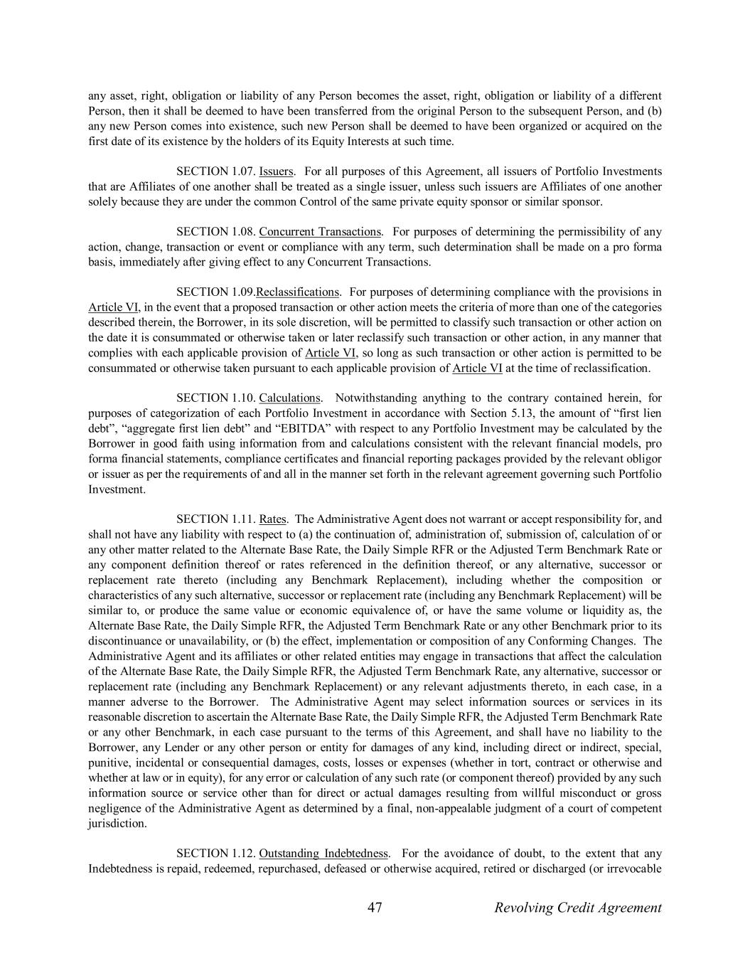 47 Revolving Credit Agreement any asset, right, obligation or liability of any Person becomes the asset, right, obligation or liability of a different Person, then it shall be deemed to have been transferred from the original Person to the subsequent Person, and (b) any new Person comes into existence, such new Person shall be deemed to have been organized or acquired on the first date of its existence by the holders of its Equity Interests at such time. SECTION 1.07. Issuers. For all purposes of this Agreement, all issuers of Portfolio Investments that are Affiliates of one another shall be treated as a single issuer, unless such issuers are Affiliates of one another solely because they are under the common Control of the same private equity sponsor or similar sponsor. SECTION 1.08. Concurrent Transactions. For purposes of determining the permissibility of any action, change, transaction or event or compliance with any term, such determination shall be made on a pro forma basis, immediately after giving effect to any Concurrent Transactions. SECTION 1.09.Reclassifications. For purposes of determining compliance with the provisions in Article VI, in the event that a proposed transaction or other action meets the criteria of more than one of the categories described therein, the Borrower, in its sole discretion, will be permitted to classify such transaction or other action on the date it is consummated or otherwise taken or later reclassify such transaction or other action, in any manner that complies with each applicable provision of Article VI, so long as such transaction or other action is permitted to be consummated or otherwise taken pursuant to each applicable provision of Article VI at the time of reclassification. SECTION 1.10. Calculations. Notwithstanding anything to the contrary contained herein, for purposes of categorization of each Portfolio Investment in accordance with Section 5.13, the amount of “first lien debt”, “aggregate first lien debt” and “EBITDA” with respect to any Portfolio Investment may be calculated by the Borrower in good faith using information from and calculations consistent with the relevant financial models, pro forma financial statements, compliance certificates and financial reporting packages provided by the relevant obligor or issuer as per the requirements of and all in the manner set forth in the relevant agreement governing such Portfolio Investment. SECTION 1.11. Rates. The Administrative Agent does not warrant or accept responsibility for, and shall not have any liability with respect to (a) the continuation of, administration of, submission of, calculation of or any other matter related to the Alternate Base Rate, the Daily Simple RFR or the Adjusted Term Benchmark Rate or any component definition thereof or rates referenced in the definition thereof, or any alternative, successor or replacement rate thereto (including any Benchmark Replacement), including whether the composition or characteristics of any such alternative, successor or replacement rate (including any Benchmark Replacement) will be similar to, or produce the same value or economic equivalence of, or have the same volume or liquidity as, the Alternate Base Rate, the Daily Simple RFR, the Adjusted Term Benchmark Rate or any other Benchmark prior to its discontinuance or unavailability, or (b) the effect, implementation or composition of any Conforming Changes. The Administrative Agent and its affiliates or other related entities may engage in transactions that affect the calculation of the Alternate Base Rate, the Daily Simple RFR, the Adjusted Term Benchmark Rate, any alternative, successor or replacement rate (including any Benchmark Replacement) or any relevant adjustments thereto, in each case, in a manner adverse to the Borrower. The Administrative Agent may select information sources or services in its reasonable discretion to ascertain the Alternate Base Rate, the Daily Simple RFR, the Adjusted Term Benchmark Rate or any other Benchmark, in each case pursuant to the terms of this Agreement, and shall have no liability to the Borrower, any Lender or any other person or entity for damages of any kind, including direct or indirect, special, punitive, incidental or consequential damages, costs, losses or expenses (whether in tort, contract or otherwise and whether at law or in equity), for any error or calculation of any such rate (or component thereof) provided by any such information source or service other than for direct or actual damages resulting from willful misconduct or gross negligence of the Administrative Agent as determined by a final, non-appealable judgment of a court of competent jurisdiction. SECTION 1.12. Outstanding Indebtedness. For the avoidance of doubt, to the extent that any Indebtedness is repaid, redeemed, repurchased, defeased or otherwise acquired, retired or discharged (or irrevocable