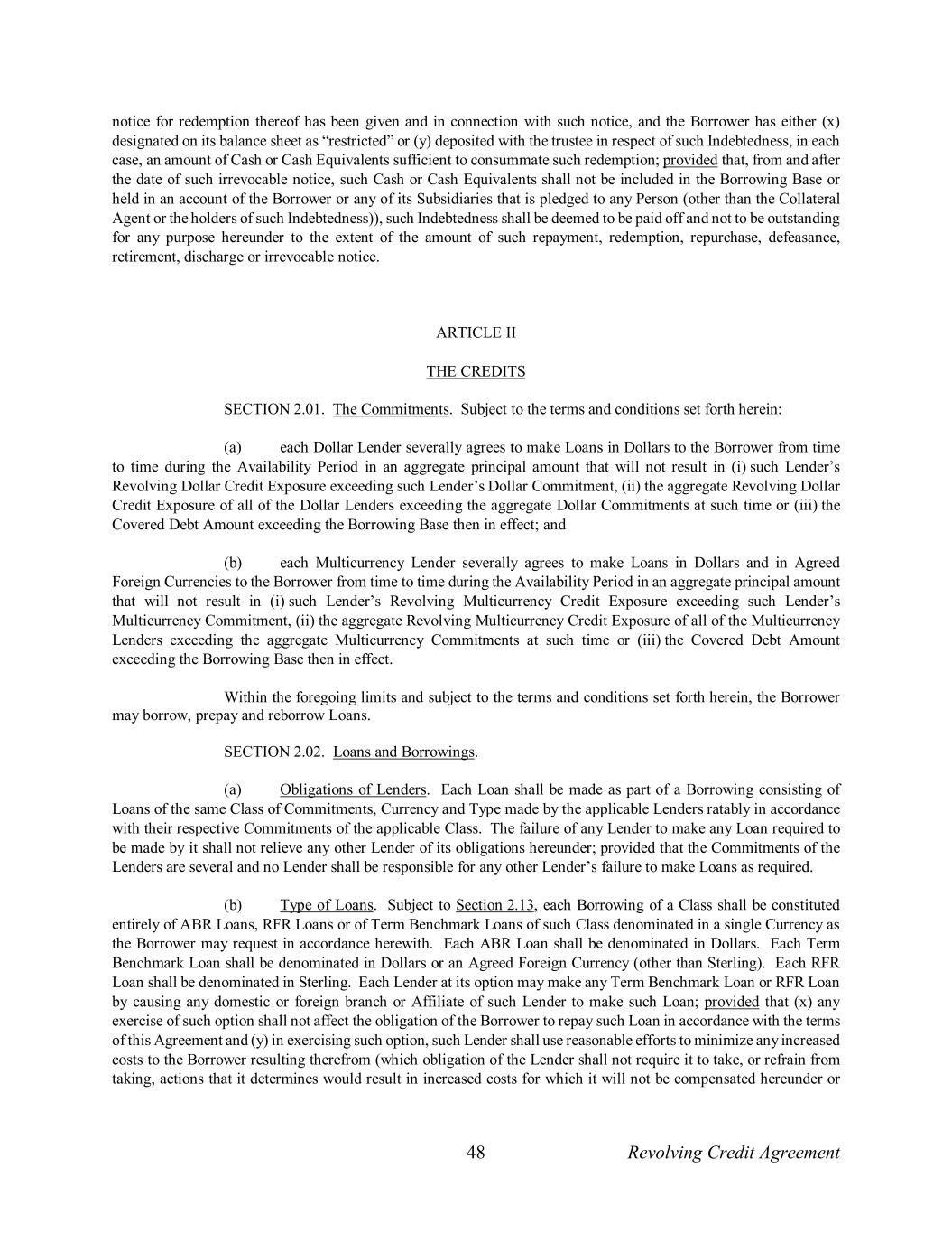 48 Revolving Credit Agreement notice for redemption thereof has been given and in connection with such notice, and the Borrower has either (x) designated on its balance sheet as “restricted” or (y) deposited with the trustee in respect of such Indebtedness, in each case, an amount of Cash or Cash Equivalents sufficient to consummate such redemption; provided that, from and after the date of such irrevocable notice, such Cash or Cash Equivalents shall not be included in the Borrowing Base or held in an account of the Borrower or any of its Subsidiaries that is pledged to any Person (other than the Collateral Agent or the holders of such Indebtedness)), such Indebtedness shall be deemed to be paid off and not to be outstanding for any purpose hereunder to the extent of the amount of such repayment, redemption, repurchase, defeasance, retirement, discharge or irrevocable notice. ARTICLE II THE CREDITS SECTION 2.01. The Commitments. Subject to the terms and conditions set forth herein: (a) each Dollar Lender severally agrees to make Loans in Dollars to the Borrower from time to time during the Availability Period in an aggregate principal amount that will not result in (i) such Lender’s Revolving Dollar Credit Exposure exceeding such Lender’s Dollar Commitment, (ii) the aggregate Revolving Dollar Credit Exposure of all of the Dollar Lenders exceeding the aggregate Dollar Commitments at such time or (iii) the Covered Debt Amount exceeding the Borrowing Base then in effect; and (b) each Multicurrency Lender severally agrees to make Loans in Dollars and in Agreed Foreign Currencies to the Borrower from time to time during the Availability Period in an aggregate principal amount that will not result in (i) such Lender’s Revolving Multicurrency Credit Exposure exceeding such Lender’s Multicurrency Commitment, (ii) the aggregate Revolving Multicurrency Credit Exposure of all of the Multicurrency Lenders exceeding the aggregate Multicurrency Commitments at such time or (iii) the Covered Debt Amount exceeding the Borrowing Base then in effect. Within the foregoing limits and subject to the terms and conditions set forth herein, the Borrower may borrow, prepay and reborrow Loans. SECTION 2.02. Loans and Borrowings. (a) Obligations of Lenders. Each Loan shall be made as part of a Borrowing consisting of Loans of the same Class of Commitments, Currency and Type made by the applicable Lenders ratably in accordance with their respective Commitments of the applicable Class. The failure of any Lender to make any Loan required to be made by it shall not relieve any other Lender of its obligations hereunder; provided that the Commitments of the Lenders are several and no Lender shall be responsible for any other Lender’s failure to make Loans as required. (b) Type of Loans. Subject to Section 2.13, each Borrowing of a Class shall be constituted entirely of ABR Loans, RFR Loans or of Term Benchmark Loans of such Class denominated in a single Currency as the Borrower may request in accordance herewith. Each ABR Loan shall be denominated in Dollars. Each Term Benchmark Loan shall be denominated in Dollars or an Agreed Foreign Currency (other than Sterling). Each RFR Loan shall be denominated in Sterling. Each Lender at its option may make any Term Benchmark Loan or RFR Loan by causing any domestic or foreign branch or Affiliate of such Lender to make such Loan; provided that (x) any exercise of such option shall not affect the obligation of the Borrower to repay such Loan in accordance with the terms of this Agreement and (y) in exercising such option, such Lender shall use reasonable efforts to minimize any increased costs to the Borrower resulting therefrom (which obligation of the Lender shall not require it to take, or refrain from taking, actions that it determines would result in increased costs for which it will not be compensated hereunder or