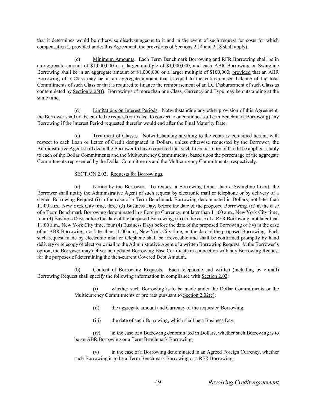 49 Revolving Credit Agreement that it determines would be otherwise disadvantageous to it and in the event of such request for costs for which compensation is provided under this Agreement, the provisions of Sections 2.14 and 2.18 shall apply). (c) Minimum Amounts. Each Term Benchmark Borrowing and RFR Borrowing shall be in an aggregate amount of $1,000,000 or a larger multiple of $1,000,000, and each ABR Borrowing or Swingline Borrowing shall be in an aggregate amount of $1,000,000 or a larger multiple of $100,000; provided that an ABR Borrowing of a Class may be in an aggregate amount that is equal to the entire unused balance of the total Commitments of such Class or that is required to finance the reimbursement of an LC Disbursement of such Class as contemplated by Section 2.05(f). Borrowings of more than one Class, Currency and Type may be outstanding at the same time. (d) Limitations on Interest Periods. Notwithstanding any other provision of this Agreement, the Borrower shall not be entitled to request (or to elect to convert to or continue as a Term Benchmark Borrowing) any Borrowing if the Interest Period requested therefor would end after the Final Maturity Date. (e) Treatment of Classes. Notwithstanding anything to the contrary contained herein, with respect to each Loan or Letter of Credit designated in Dollars, unless otherwise requested by the Borrower, the Administrative Agent shall deem the Borrower to have requested that such Loan or Letter of Credit be applied ratably to each of the Dollar Commitments and the Multicurrency Commitments, based upon the percentage of the aggregate Commitments represented by the Dollar Commitments and the Multicurrency Commitments, respectively. SECTION 2.03. Requests for Borrowings. (a) Notice by the Borrower. To request a Borrowing (other than a Swingline Loan), the Borrower shall notify the Administrative Agent of such request by electronic mail or telephone or by delivery of a signed Borrowing Request (i) in the case of a Term Benchmark Borrowing denominated in Dollars, not later than 11:00 a.m., New York City time, three (3) Business Days before the date of the proposed Borrowing, (ii) in the case of a Term Benchmark Borrowing denominated in a Foreign Currency, not later than 11:00 a.m., New York City time, four (4) Business Days before the date of the proposed Borrowing, (iii) in the case of a RFR Borrowing, not later than 11:00 a.m., New York City time, four (4) Business Days before the date of the proposed Borrowing or (iv) in the case of an ABR Borrowing, not later than 11:00 a.m., New York City time, on the date of the proposed Borrowing. Each such request made by electronic mail or telephone shall be irrevocable and shall be confirmed promptly by hand delivery or telecopy or electronic mail to the Administrative Agent of a written Borrowing Request. At the Borrower’s option, the Borrower may deliver an updated Borrowing Base Certificate in connection with any Borrowing Request for the purposes of determining the then-current Covered Debt Amount. (b) Content of Borrowing Requests. Each telephonic and written (including by e-mail) Borrowing Request shall specify the following information in compliance with Section 2.02: (i) whether such Borrowing is to be made under the Dollar Commitments or the Multicurrency Commitments or pro rata pursuant to Section 2.02(e); (ii) the aggregate amount and Currency of the requested Borrowing; (iii) the date of such Borrowing, which shall be a Business Day; (iv) in the case of a Borrowing denominated in Dollars, whether such Borrowing is to be an ABR Borrowing or a Term Benchmark Borrowing; (v) in the case of a Borrowing denominated in an Agreed Foreign Currency, whether such Borrowing is to be a Term Benchmark Borrowing or a RFR Borrowing;