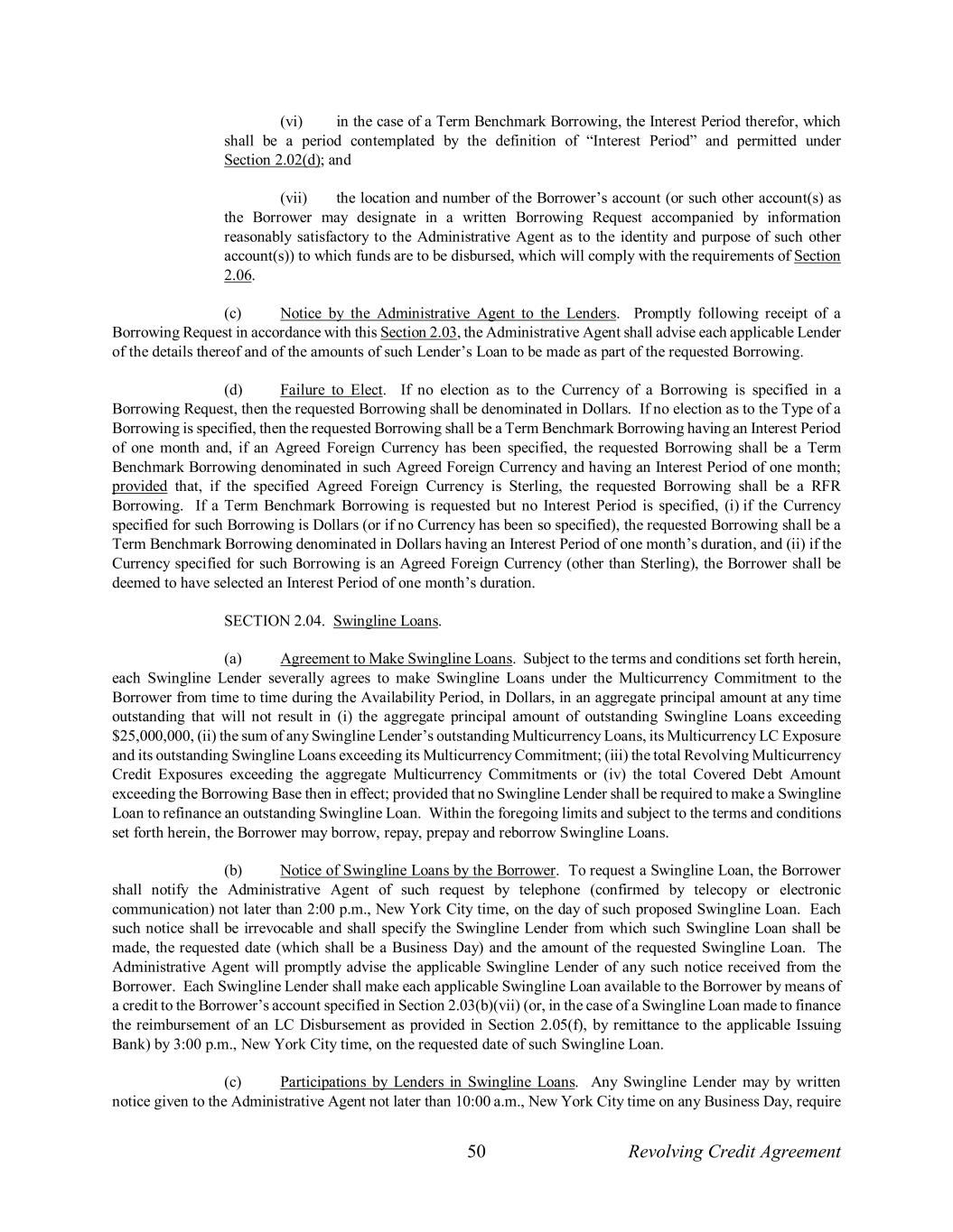 50 Revolving Credit Agreement (vi) in the case of a Term Benchmark Borrowing, the Interest Period therefor, which shall be a period contemplated by the definition of “Interest Period” and permitted under Section 2.02(d); and (vii) the location and number of the Borrower’s account (or such other account(s) as the Borrower may designate in a written Borrowing Request accompanied by information reasonably satisfactory to the Administrative Agent as to the identity and purpose of such other account(s)) to which funds are to be disbursed, which will comply with the requirements of Section 2.06. (c) Notice by the Administrative Agent to the Lenders. Promptly following receipt of a Borrowing Request in accordance with this Section 2.03, the Administrative Agent shall advise each applicable Lender of the details thereof and of the amounts of such Lender’s Loan to be made as part of the requested Borrowing. (d) Failure to Elect. If no election as to the Currency of a Borrowing is specified in a Borrowing Request, then the requested Borrowing shall be denominated in Dollars. If no election as to the Type of a Borrowing is specified, then the requested Borrowing shall be a Term Benchmark Borrowing having an Interest Period of one month and, if an Agreed Foreign Currency has been specified, the requested Borrowing shall be a Term Benchmark Borrowing denominated in such Agreed Foreign Currency and having an Interest Period of one month; provided that, if the specified Agreed Foreign Currency is Sterling, the requested Borrowing shall be a RFR Borrowing. If a Term Benchmark Borrowing is requested but no Interest Period is specified, (i) if the Currency specified for such Borrowing is Dollars (or if no Currency has been so specified), the requested Borrowing shall be a Term Benchmark Borrowing denominated in Dollars having an Interest Period of one month’s duration, and (ii) if the Currency specified for such Borrowing is an Agreed Foreign Currency (other than Sterling), the Borrower shall be deemed to have selected an Interest Period of one month’s duration. SECTION 2.04. Swingline Loans. (a) Agreement to Make Swingline Loans. Subject to the terms and conditions set forth herein, each Swingline Lender severally agrees to make Swingline Loans under the Multicurrency Commitment to the Borrower from time to time during the Availability Period, in Dollars, in an aggregate principal amount at any time outstanding that will not result in (i) the aggregate principal amount of outstanding Swingline Loans exceeding $25,000,000, (ii) the sum of any Swingline Lender’s outstanding Multicurrency Loans, its Multicurrency LC Exposure and its outstanding Swingline Loans exceeding its Multicurrency Commitment; (iii) the total Revolving Multicurrency Credit Exposures exceeding the aggregate Multicurrency Commitments or (iv) the total Covered Debt Amount exceeding the Borrowing Base then in effect; provided that no Swingline Lender shall be required to make a Swingline Loan to refinance an outstanding Swingline Loan. Within the foregoing limits and subject to the terms and conditions set forth herein, the Borrower may borrow, repay, prepay and reborrow Swingline Loans. (b) Notice of Swingline Loans by the Borrower. To request a Swingline Loan, the Borrower shall notify the Administrative Agent of such request by telephone (confirmed by telecopy or electronic communication) not later than 2:00 p.m., New York City time, on the day of such proposed Swingline Loan. Each such notice shall be irrevocable and shall specify the Swingline Lender from which such Swingline Loan shall be made, the requested date (which shall be a Business Day) and the amount of the requested Swingline Loan. The Administrative Agent will promptly advise the applicable Swingline Lender of any such notice received from the Borrower. Each Swingline Lender shall make each applicable Swingline Loan available to the Borrower by means of a credit to the Borrower’s account specified in Section 2.03(b)(vii) (or, in the case of a Swingline Loan made to finance the reimbursement of an LC Disbursement as provided in Section 2.05(f), by remittance to the applicable Issuing Bank) by 3:00 p.m., New York City time, on the requested date of such Swingline Loan. (c) Participations by Lenders in Swingline Loans. Any Swingline Lender may by written notice given to the Administrative Agent not later than 10:00 a.m., New York City time on any Business Day, require