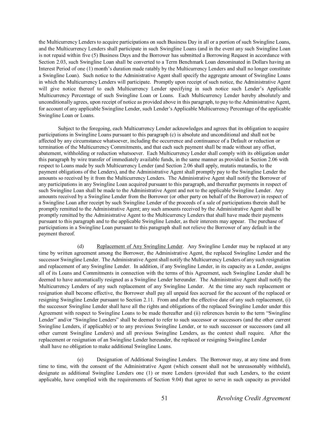 51 Revolving Credit Agreement the Multicurrency Lenders to acquire participations on such Business Day in all or a portion of such Swingline Loans, and the Multicurrency Lenders shall participate in such Swingline Loans (and in the event any such Swingline Loan is not repaid within five (5) Business Days and the Borrower has submitted a Borrowing Request in accordance with Section 2.03, such Swingline Loan shall be converted to a Term Benchmark Loan denominated in Dollars having an Interest Period of one (1) month’s duration made ratably by the Multicurrency Lenders and shall no longer constitute a Swingline Loan). Such notice to the Administrative Agent shall specify the aggregate amount of Swingline Loans in which the Multicurrency Lenders will participate. Promptly upon receipt of such notice, the Administrative Agent will give notice thereof to each Multicurrency Lender specifying in such notice such Lender’s Applicable Multicurrency Percentage of such Swingline Loan or Loans. Each Multicurrency Lender hereby absolutely and unconditionally agrees, upon receipt of notice as provided above in this paragraph, to pay to the Administrative Agent, for account of any applicable Swingline Lender, such Lender’s Applicable Multicurrency Percentage of the applicable Swingline Loan or Loans. Subject to the foregoing, each Multicurrency Lender acknowledges and agrees that its obligation to acquire participations in Swingline Loans pursuant to this paragraph (c) is absolute and unconditional and shall not be affected by any circumstance whatsoever, including the occurrence and continuance of a Default or reduction or termination of the Multicurrency Commitments, and that each such payment shall be made without any offset, abatement, withholding or reduction whatsoever. Each Multicurrency Lender shall comply with its obligation under this paragraph by wire transfer of immediately available funds, in the same manner as provided in Section 2.06 with respect to Loans made by such Multicurrency Lender (and Section 2.06 shall apply, mutatis mutandis, to the payment obligations of the Lenders), and the Administrative Agent shall promptly pay to the Swingline Lender the amounts so received by it from the Multicurrency Lenders. The Administrative Agent shall notify the Borrower of any participations in any Swingline Loan acquired pursuant to this paragraph, and thereafter payments in respect of such Swingline Loan shall be made to the Administrative Agent and not to the applicable Swingline Lender. Any amounts received by a Swingline Lender from the Borrower (or other party on behalf of the Borrower) in respect of a Swingline Loan after receipt by such Swingline Lender of the proceeds of a sale of participations therein shall be promptly remitted to the Administrative Agent; any such amounts received by the Administrative Agent shall be promptly remitted by the Administrative Agent to the Multicurrency Lenders that shall have made their payments pursuant to this paragraph and to the applicable Swingline Lender, as their interests may appear. The purchase of participations in a Swingline Loan pursuant to this paragraph shall not relieve the Borrower of any default in the payment thereof. (d) Replacement of Any Swingline Lender. Any Swingline Lender may be replaced at any time by written agreement among the Borrower, the Administrative Agent, the replaced Swingline Lender and the successor Swingline Lender. The Administrative Agent shall notify the Multicurrency Lenders of any such resignation and replacement of any Swingline Lender. In addition, if any Swingline Lender, in its capacity as a Lender, assigns all of its Loans and Commitments in connection with the terms of this Agreement, such Swingline Lender shall be deemed to have automatically resigned as a Swingline Lender hereunder. The Administrative Agent shall notify the Multicurrency Lenders of any such replacement of any Swingline Lender. At the time any such replacement or resignation shall become effective, the Borrower shall pay all unpaid fees accrued for the account of the replaced or resigning Swingline Lender pursuant to Section 2.11. From and after the effective date of any such replacement, (i) the successor Swingline Lender shall have all the rights and obligations of the replaced Swingline Lender under this Agreement with respect to Swingline Loans to be made thereafter and (ii) references herein to the term “Swingline Lender” and/or “Swingline Lenders” shall be deemed to refer to such successor or successors (and the other current Swingline Lenders, if applicable) or to any previous Swingline Lender, or to such successor or successors (and all other current Swingline Lenders) and all previous Swingline Lenders, as the context shall require. After the replacement or resignation of an Swingline Lender hereunder, the replaced or resigning Swingline Lender shall have no obligation to make additional Swingline Loans. (e) Designation of Additional Swingline Lenders. The Borrower may, at any time and from time to time, with the consent of the Administrative Agent (which consent shall not be unreasonably withheld), designate as additional Swingline Lenders one (1) or more Lenders (provided that such Lenders, to the extent applicable, have complied with the requirements of Section 9.04) that agree to serve in such capacity as provided