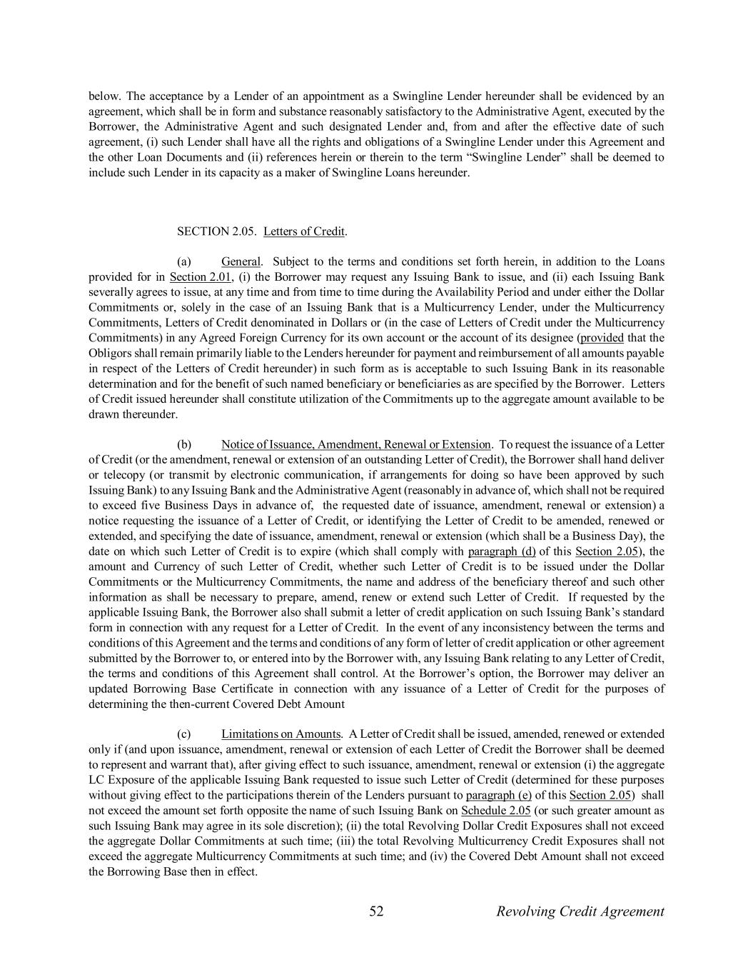 52 Revolving Credit Agreement below. The acceptance by a Lender of an appointment as a Swingline Lender hereunder shall be evidenced by an agreement, which shall be in form and substance reasonably satisfactory to the Administrative Agent, executed by the Borrower, the Administrative Agent and such designated Lender and, from and after the effective date of such agreement, (i) such Lender shall have all the rights and obligations of a Swingline Lender under this Agreement and the other Loan Documents and (ii) references herein or therein to the term “Swingline Lender” shall be deemed to include such Lender in its capacity as a maker of Swingline Loans hereunder. SECTION 2.05. Letters of Credit. (a) General. Subject to the terms and conditions set forth herein, in addition to the Loans provided for in Section 2.01, (i) the Borrower may request any Issuing Bank to issue, and (ii) each Issuing Bank severally agrees to issue, at any time and from time to time during the Availability Period and under either the Dollar Commitments or, solely in the case of an Issuing Bank that is a Multicurrency Lender, under the Multicurrency Commitments, Letters of Credit denominated in Dollars or (in the case of Letters of Credit under the Multicurrency Commitments) in any Agreed Foreign Currency for its own account or the account of its designee (provided that the Obligors shall remain primarily liable to the Lenders hereunder for payment and reimbursement of all amounts payable in respect of the Letters of Credit hereunder) in such form as is acceptable to such Issuing Bank in its reasonable determination and for the benefit of such named beneficiary or beneficiaries as are specified by the Borrower. Letters of Credit issued hereunder shall constitute utilization of the Commitments up to the aggregate amount available to be drawn thereunder. (b) Notice of Issuance, Amendment, Renewal or Extension. To request the issuance of a Letter of Credit (or the amendment, renewal or extension of an outstanding Letter of Credit), the Borrower shall hand deliver or telecopy (or transmit by electronic communication, if arrangements for doing so have been approved by such Issuing Bank) to any Issuing Bank and the Administrative Agent (reasonably in advance of, which shall not be required to exceed five Business Days in advance of, the requested date of issuance, amendment, renewal or extension) a notice requesting the issuance of a Letter of Credit, or identifying the Letter of Credit to be amended, renewed or extended, and specifying the date of issuance, amendment, renewal or extension (which shall be a Business Day), the date on which such Letter of Credit is to expire (which shall comply with paragraph (d) of this Section 2.05), the amount and Currency of such Letter of Credit, whether such Letter of Credit is to be issued under the Dollar Commitments or the Multicurrency Commitments, the name and address of the beneficiary thereof and such other information as shall be necessary to prepare, amend, renew or extend such Letter of Credit. If requested by the applicable Issuing Bank, the Borrower also shall submit a letter of credit application on such Issuing Bank’s standard form in connection with any request for a Letter of Credit. In the event of any inconsistency between the terms and conditions of this Agreement and the terms and conditions of any form of letter of credit application or other agreement submitted by the Borrower to, or entered into by the Borrower with, any Issuing Bank relating to any Letter of Credit, the terms and conditions of this Agreement shall control. At the Borrower’s option, the Borrower may deliver an updated Borrowing Base Certificate in connection with any issuance of a Letter of Credit for the purposes of determining the then-current Covered Debt Amount (c) Limitations on Amounts. A Letter of Credit shall be issued, amended, renewed or extended only if (and upon issuance, amendment, renewal or extension of each Letter of Credit the Borrower shall be deemed to represent and warrant that), after giving effect to such issuance, amendment, renewal or extension (i) the aggregate LC Exposure of the applicable Issuing Bank requested to issue such Letter of Credit (determined for these purposes without giving effect to the participations therein of the Lenders pursuant to paragraph (e) of this Section 2.05) shall not exceed the amount set forth opposite the name of such Issuing Bank on Schedule 2.05 (or such greater amount as such Issuing Bank may agree in its sole discretion); (ii) the total Revolving Dollar Credit Exposures shall not exceed the aggregate Dollar Commitments at such time; (iii) the total Revolving Multicurrency Credit Exposures shall not exceed the aggregate Multicurrency Commitments at such time; and (iv) the Covered Debt Amount shall not exceed the Borrowing Base then in effect.