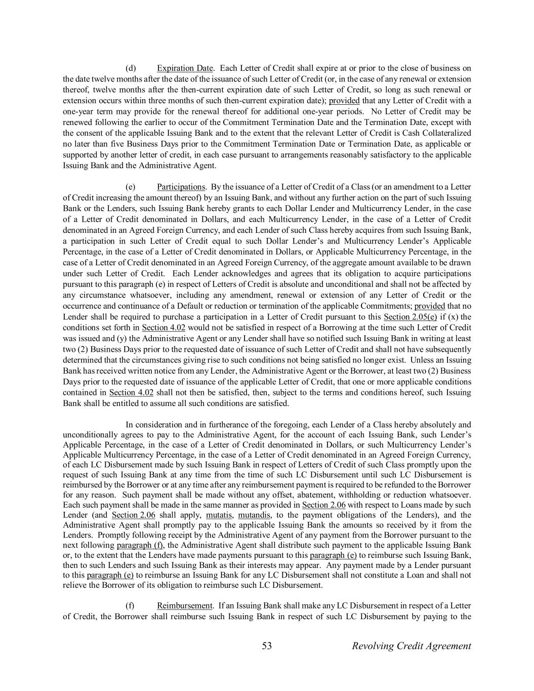 53 Revolving Credit Agreement (d) Expiration Date. Each Letter of Credit shall expire at or prior to the close of business on the date twelve months after the date of the issuance of such Letter of Credit (or, in the case of any renewal or extension thereof, twelve months after the then-current expiration date of such Letter of Credit, so long as such renewal or extension occurs within three months of such then-current expiration date); provided that any Letter of Credit with a one-year term may provide for the renewal thereof for additional one-year periods. No Letter of Credit may be renewed following the earlier to occur of the Commitment Termination Date and the Termination Date, except with the consent of the applicable Issuing Bank and to the extent that the relevant Letter of Credit is Cash Collateralized no later than five Business Days prior to the Commitment Termination Date or Termination Date, as applicable or supported by another letter of credit, in each case pursuant to arrangements reasonably satisfactory to the applicable Issuing Bank and the Administrative Agent. (e) Participations. By the issuance of a Letter of Credit of a Class (or an amendment to a Letter of Credit increasing the amount thereof) by an Issuing Bank, and without any further action on the part of such Issuing Bank or the Lenders, such Issuing Bank hereby grants to each Dollar Lender and Multicurrency Lender, in the case of a Letter of Credit denominated in Dollars, and each Multicurrency Lender, in the case of a Letter of Credit denominated in an Agreed Foreign Currency, and each Lender of such Class hereby acquires from such Issuing Bank, a participation in such Letter of Credit equal to such Dollar Lender’s and Multicurrency Lender’s Applicable Percentage, in the case of a Letter of Credit denominated in Dollars, or Applicable Multicurrency Percentage, in the case of a Letter of Credit denominated in an Agreed Foreign Currency, of the aggregate amount available to be drawn under such Letter of Credit. Each Lender acknowledges and agrees that its obligation to acquire participations pursuant to this paragraph (e) in respect of Letters of Credit is absolute and unconditional and shall not be affected by any circumstance whatsoever, including any amendment, renewal or extension of any Letter of Credit or the occurrence and continuance of a Default or reduction or termination of the applicable Commitments; provided that no Lender shall be required to purchase a participation in a Letter of Credit pursuant to this Section 2.05(e) if (x) the conditions set forth in Section 4.02 would not be satisfied in respect of a Borrowing at the time such Letter of Credit was issued and (y) the Administrative Agent or any Lender shall have so notified such Issuing Bank in writing at least two (2) Business Days prior to the requested date of issuance of such Letter of Credit and shall not have subsequently determined that the circumstances giving rise to such conditions not being satisfied no longer exist. Unless an Issuing Bank has received written notice from any Lender, the Administrative Agent or the Borrower, at least two (2) Business Days prior to the requested date of issuance of the applicable Letter of Credit, that one or more applicable conditions contained in Section 4.02 shall not then be satisfied, then, subject to the terms and conditions hereof, such Issuing Bank shall be entitled to assume all such conditions are satisfied. In consideration and in furtherance of the foregoing, each Lender of a Class hereby absolutely and unconditionally agrees to pay to the Administrative Agent, for the account of each Issuing Bank, such Lender’s Applicable Percentage, in the case of a Letter of Credit denominated in Dollars, or such Multicurrency Lender’s Applicable Multicurrency Percentage, in the case of a Letter of Credit denominated in an Agreed Foreign Currency, of each LC Disbursement made by such Issuing Bank in respect of Letters of Credit of such Class promptly upon the request of such Issuing Bank at any time from the time of such LC Disbursement until such LC Disbursement is reimbursed by the Borrower or at any time after any reimbursement payment is required to be refunded to the Borrower for any reason. Such payment shall be made without any offset, abatement, withholding or reduction whatsoever. Each such payment shall be made in the same manner as provided in Section 2.06 with respect to Loans made by such Lender (and Section 2.06 shall apply, mutatis, mutandis, to the payment obligations of the Lenders), and the Administrative Agent shall promptly pay to the applicable Issuing Bank the amounts so received by it from the Lenders. Promptly following receipt by the Administrative Agent of any payment from the Borrower pursuant to the next following paragraph (f), the Administrative Agent shall distribute such payment to the applicable Issuing Bank or, to the extent that the Lenders have made payments pursuant to this paragraph (e) to reimburse such Issuing Bank, then to such Lenders and such Issuing Bank as their interests may appear. Any payment made by a Lender pursuant to this paragraph (e) to reimburse an Issuing Bank for any LC Disbursement shall not constitute a Loan and shall not relieve the Borrower of its obligation to reimburse such LC Disbursement. (f) Reimbursement. If an Issuing Bank shall make any LC Disbursement in respect of a Letter of Credit, the Borrower shall reimburse such Issuing Bank in respect of such LC Disbursement by paying to the