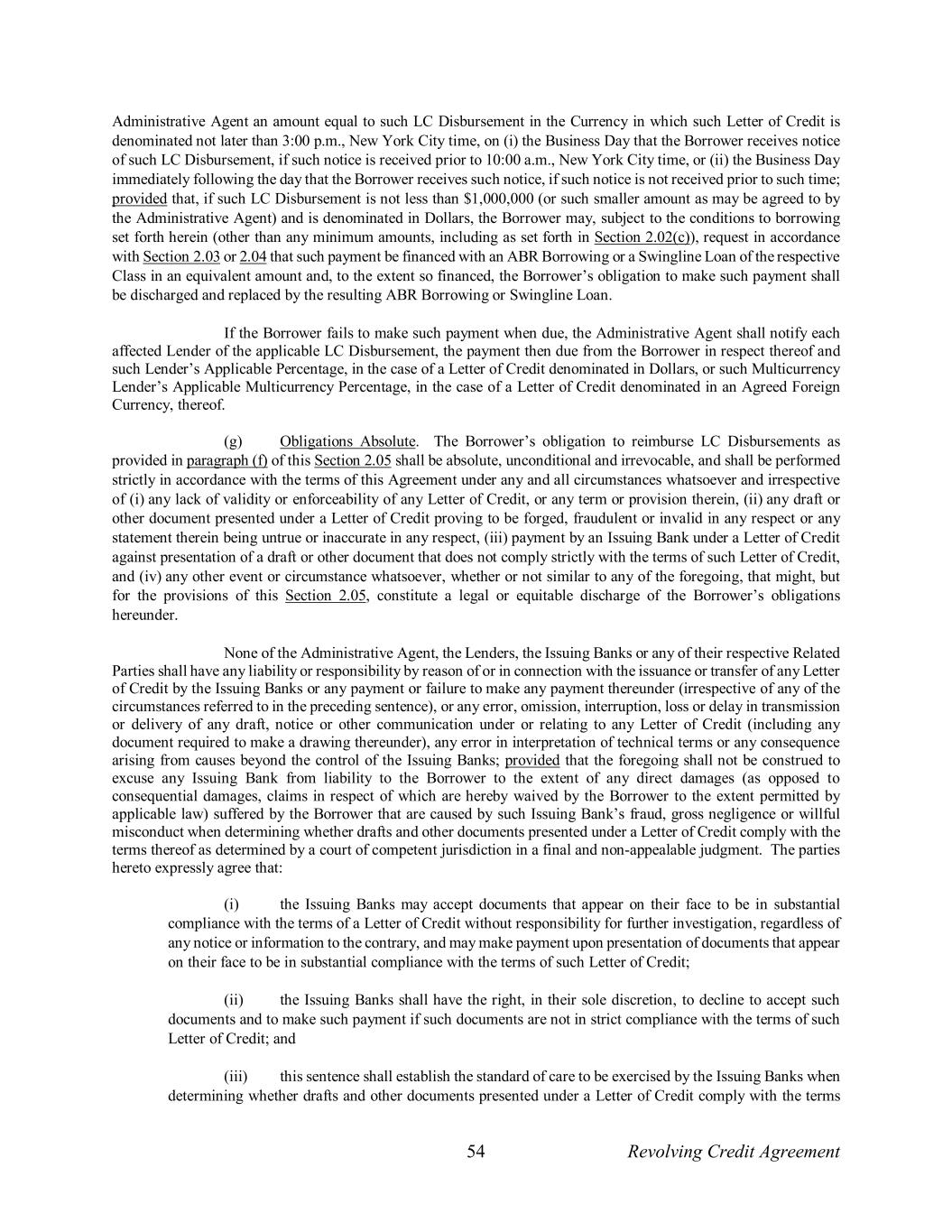 54 Revolving Credit Agreement Administrative Agent an amount equal to such LC Disbursement in the Currency in which such Letter of Credit is denominated not later than 3:00 p.m., New York City time, on (i) the Business Day that the Borrower receives notice of such LC Disbursement, if such notice is received prior to 10:00 a.m., New York City time, or (ii) the Business Day immediately following the day that the Borrower receives such notice, if such notice is not received prior to such time; provided that, if such LC Disbursement is not less than $1,000,000 (or such smaller amount as may be agreed to by the Administrative Agent) and is denominated in Dollars, the Borrower may, subject to the conditions to borrowing set forth herein (other than any minimum amounts, including as set forth in Section 2.02(c)), request in accordance with Section 2.03 or 2.04 that such payment be financed with an ABR Borrowing or a Swingline Loan of the respective Class in an equivalent amount and, to the extent so financed, the Borrower’s obligation to make such payment shall be discharged and replaced by the resulting ABR Borrowing or Swingline Loan. If the Borrower fails to make such payment when due, the Administrative Agent shall notify each affected Lender of the applicable LC Disbursement, the payment then due from the Borrower in respect thereof and such Lender’s Applicable Percentage, in the case of a Letter of Credit denominated in Dollars, or such Multicurrency Lender’s Applicable Multicurrency Percentage, in the case of a Letter of Credit denominated in an Agreed Foreign Currency, thereof. (g) Obligations Absolute. The Borrower’s obligation to reimburse LC Disbursements as provided in paragraph (f) of this Section 2.05 shall be absolute, unconditional and irrevocable, and shall be performed strictly in accordance with the terms of this Agreement under any and all circumstances whatsoever and irrespective of (i) any lack of validity or enforceability of any Letter of Credit, or any term or provision therein, (ii) any draft or other document presented under a Letter of Credit proving to be forged, fraudulent or invalid in any respect or any statement therein being untrue or inaccurate in any respect, (iii) payment by an Issuing Bank under a Letter of Credit against presentation of a draft or other document that does not comply strictly with the terms of such Letter of Credit, and (iv) any other event or circumstance whatsoever, whether or not similar to any of the foregoing, that might, but for the provisions of this Section 2.05, constitute a legal or equitable discharge of the Borrower’s obligations hereunder. None of the Administrative Agent, the Lenders, the Issuing Banks or any of their respective Related Parties shall have any liability or responsibility by reason of or in connection with the issuance or transfer of any Letter of Credit by the Issuing Banks or any payment or failure to make any payment thereunder (irrespective of any of the circumstances referred to in the preceding sentence), or any error, omission, interruption, loss or delay in transmission or delivery of any draft, notice or other communication under or relating to any Letter of Credit (including any document required to make a drawing thereunder), any error in interpretation of technical terms or any consequence arising from causes beyond the control of the Issuing Banks; provided that the foregoing shall not be construed to excuse any Issuing Bank from liability to the Borrower to the extent of any direct damages (as opposed to consequential damages, claims in respect of which are hereby waived by the Borrower to the extent permitted by applicable law) suffered by the Borrower that are caused by such Issuing Bank’s fraud, gross negligence or willful misconduct when determining whether drafts and other documents presented under a Letter of Credit comply with the terms thereof as determined by a court of competent jurisdiction in a final and non-appealable judgment. The parties hereto expressly agree that: (i) the Issuing Banks may accept documents that appear on their face to be in substantial compliance with the terms of a Letter of Credit without responsibility for further investigation, regardless of any notice or information to the contrary, and may make payment upon presentation of documents that appear on their face to be in substantial compliance with the terms of such Letter of Credit; (ii) the Issuing Banks shall have the right, in their sole discretion, to decline to accept such documents and to make such payment if such documents are not in strict compliance with the terms of such Letter of Credit; and (iii) this sentence shall establish the standard of care to be exercised by the Issuing Banks when determining whether drafts and other documents presented under a Letter of Credit comply with the terms