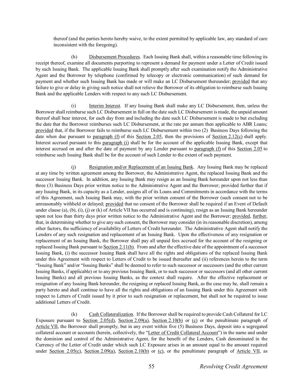 55 Revolving Credit Agreement thereof (and the parties hereto hereby waive, to the extent permitted by applicable law, any standard of care inconsistent with the foregoing). (h) Disbursement Procedures. Each Issuing Bank shall, within a reasonable time following its receipt thereof, examine all documents purporting to represent a demand for payment under a Letter of Credit issued by such Issuing Bank. The applicable Issuing Bank shall promptly after such examination notify the Administrative Agent and the Borrower by telephone (confirmed by telecopy or electronic communication) of such demand for payment and whether such Issuing Bank has made or will make an LC Disbursement thereunder; provided that any failure to give or delay in giving such notice shall not relieve the Borrower of its obligation to reimburse such Issuing Bank and the applicable Lenders with respect to any such LC Disbursement. (i) Interim Interest. If any Issuing Bank shall make any LC Disbursement, then, unless the Borrower shall reimburse such LC Disbursement in full on the date such LC Disbursement is made, the unpaid amount thereof shall bear interest, for each day from and including the date such LC Disbursement is made to but excluding the date that the Borrower reimburses such LC Disbursement, at the rate per annum then applicable to ABR Loans; provided that, if the Borrower fails to reimburse such LC Disbursement within two (2) Business Days following the date when due pursuant to paragraph (f) of this Section 2.05, then the provisions of Section 2.12(c) shall apply. Interest accrued pursuant to this paragraph (i) shall be for the account of the applicable Issuing Bank, except that interest accrued on and after the date of payment by any Lender pursuant to paragraph (f) of this Section 2.05 to reimburse such Issuing Bank shall be for the account of such Lender to the extent of such payment. (j) Resignation and/or Replacement of an Issuing Bank. Any Issuing Bank may be replaced at any time by written agreement among the Borrower, the Administrative Agent, the replaced Issuing Bank and the successor Issuing Bank. In addition, any Issuing Bank may resign as an Issuing Bank hereunder upon not less than three (3) Business Days prior written notice to the Administrative Agent and the Borrower; provided further that if any Issuing Bank, in its capacity as a Lender, assigns all of its Loans and Commitments in accordance with the terms of this Agreement, such Issuing Bank may, with the prior written consent of the Borrower (such consent not to be unreasonably withheld or delayed; provided that no consent of the Borrower shall be required if an Event of Default under clause (a), (b), (i), (j) or (k) of Article VII has occurred and is continuing), resign as an Issuing Bank hereunder upon not less than thirty days prior written notice to the Administrative Agent and the Borrower; provided, further, that, in determining whether to give any such consent, the Borrower may consider (in its reasonable discretion), among other factors, the sufficiency of availability of Letters of Credit hereunder. The Administrative Agent shall notify the Lenders of any such resignation and replacement of an Issuing Bank. Upon the effectiveness of any resignation or replacement of an Issuing Bank, the Borrower shall pay all unpaid fees accrued for the account of the resigning or replaced Issuing Bank pursuant to Section 2.11(b). From and after the effective date of the appointment of a successor Issuing Bank, (i) the successor Issuing Bank shall have all the rights and obligations of the replaced Issuing Bank under this Agreement with respect to Letters of Credit to be issued thereafter and (ii) references herein to the term “Issuing Bank” and/or “Issuing Banks” shall be deemed to refer to such successor or successors (and the other current Issuing Banks, if applicable) or to any previous Issuing Bank, or to such successor or successors (and all other current Issuing Banks) and all previous Issuing Banks, as the context shall require. After the effective replacement or resignation of any Issuing Bank hereunder, the resigning or replaced Issuing Bank, as the case may be, shall remain a party hereto and shall continue to have all the rights and obligations of an Issuing Bank under this Agreement with respect to Letters of Credit issued by it prior to such resignation or replacement, but shall not be required to issue additional Letters of Credit. (k) Cash Collateralization. If the Borrower shall be required to provide Cash Collateral for LC Exposure pursuant to Section 2.05(d), Section 2.09(a), Section 2.10(b) or (c) or the penultimate paragraph of Article VII, the Borrower shall promptly, but in any event within five (5) Business Days, deposit into a segregated collateral account or accounts (herein, collectively, the “Letter of Credit Collateral Account”) in the name and under the dominion and control of the Administrative Agent, for the benefit of the Lenders, Cash denominated in the Currency of the Letter of Credit under which such LC Exposure arises in an amount equal to the amount required under Section 2.05(c), Section 2.09(a), Section 2.10(b) or (c), or the penultimate paragraph of Article VII, as