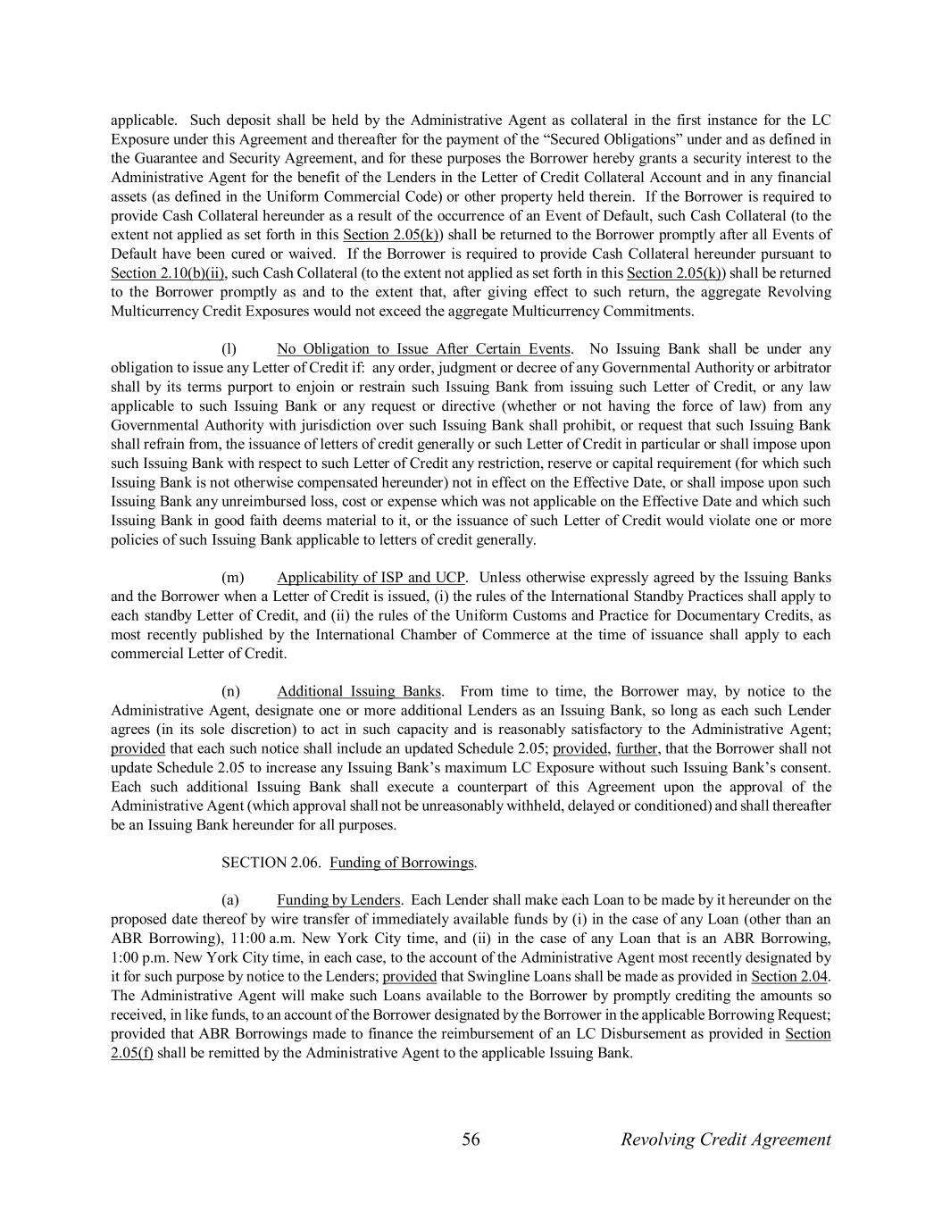 56 Revolving Credit Agreement applicable. Such deposit shall be held by the Administrative Agent as collateral in the first instance for the LC Exposure under this Agreement and thereafter for the payment of the “Secured Obligations” under and as defined in the Guarantee and Security Agreement, and for these purposes the Borrower hereby grants a security interest to the Administrative Agent for the benefit of the Lenders in the Letter of Credit Collateral Account and in any financial assets (as defined in the Uniform Commercial Code) or other property held therein. If the Borrower is required to provide Cash Collateral hereunder as a result of the occurrence of an Event of Default, such Cash Collateral (to the extent not applied as set forth in this Section 2.05(k)) shall be returned to the Borrower promptly after all Events of Default have been cured or waived. If the Borrower is required to provide Cash Collateral hereunder pursuant to Section 2.10(b)(ii), such Cash Collateral (to the extent not applied as set forth in this Section 2.05(k)) shall be returned to the Borrower promptly as and to the extent that, after giving effect to such return, the aggregate Revolving Multicurrency Credit Exposures would not exceed the aggregate Multicurrency Commitments. (l) No Obligation to Issue After Certain Events. No Issuing Bank shall be under any obligation to issue any Letter of Credit if: any order, judgment or decree of any Governmental Authority or arbitrator shall by its terms purport to enjoin or restrain such Issuing Bank from issuing such Letter of Credit, or any law applicable to such Issuing Bank or any request or directive (whether or not having the force of law) from any Governmental Authority with jurisdiction over such Issuing Bank shall prohibit, or request that such Issuing Bank shall refrain from, the issuance of letters of credit generally or such Letter of Credit in particular or shall impose upon such Issuing Bank with respect to such Letter of Credit any restriction, reserve or capital requirement (for which such Issuing Bank is not otherwise compensated hereunder) not in effect on the Effective Date, or shall impose upon such Issuing Bank any unreimbursed loss, cost or expense which was not applicable on the Effective Date and which such Issuing Bank in good faith deems material to it, or the issuance of such Letter of Credit would violate one or more policies of such Issuing Bank applicable to letters of credit generally. (m) Applicability of ISP and UCP. Unless otherwise expressly agreed by the Issuing Banks and the Borrower when a Letter of Credit is issued, (i) the rules of the International Standby Practices shall apply to each standby Letter of Credit, and (ii) the rules of the Uniform Customs and Practice for Documentary Credits, as most recently published by the International Chamber of Commerce at the time of issuance shall apply to each commercial Letter of Credit. (n) Additional Issuing Banks. From time to time, the Borrower may, by notice to the Administrative Agent, designate one or more additional Lenders as an Issuing Bank, so long as each such Lender agrees (in its sole discretion) to act in such capacity and is reasonably satisfactory to the Administrative Agent; provided that each such notice shall include an updated Schedule 2.05; provided, further, that the Borrower shall not update Schedule 2.05 to increase any Issuing Bank’s maximum LC Exposure without such Issuing Bank’s consent. Each such additional Issuing Bank shall execute a counterpart of this Agreement upon the approval of the Administrative Agent (which approval shall not be unreasonably withheld, delayed or conditioned) and shall thereafter be an Issuing Bank hereunder for all purposes. SECTION 2.06. Funding of Borrowings. (a) Funding by Lenders. Each Lender shall make each Loan to be made by it hereunder on the proposed date thereof by wire transfer of immediately available funds by (i) in the case of any Loan (other than an ABR Borrowing), 11:00 a.m. New York City time, and (ii) in the case of any Loan that is an ABR Borrowing, 1:00 p.m. New York City time, in each case, to the account of the Administrative Agent most recently designated by it for such purpose by notice to the Lenders; provided that Swingline Loans shall be made as provided in Section 2.04. The Administrative Agent will make such Loans available to the Borrower by promptly crediting the amounts so received, in like funds, to an account of the Borrower designated by the Borrower in the applicable Borrowing Request; provided that ABR Borrowings made to finance the reimbursement of an LC Disbursement as provided in Section 2.05(f) shall be remitted by the Administrative Agent to the applicable Issuing Bank.