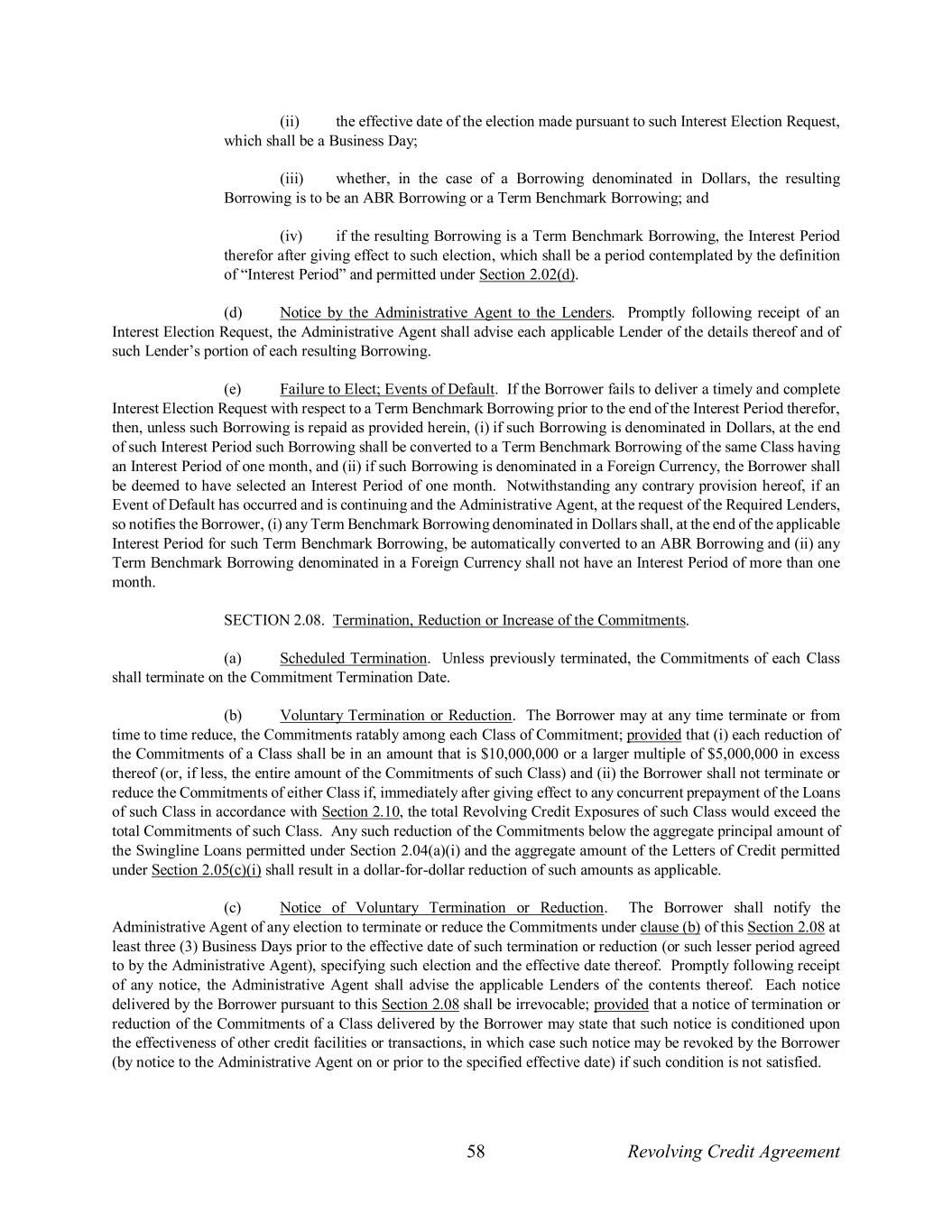 58 Revolving Credit Agreement (ii) the effective date of the election made pursuant to such Interest Election Request, which shall be a Business Day; (iii) whether, in the case of a Borrowing denominated in Dollars, the resulting Borrowing is to be an ABR Borrowing or a Term Benchmark Borrowing; and (iv) if the resulting Borrowing is a Term Benchmark Borrowing, the Interest Period therefor after giving effect to such election, which shall be a period contemplated by the definition of “Interest Period” and permitted under Section 2.02(d). (d) Notice by the Administrative Agent to the Lenders. Promptly following receipt of an Interest Election Request, the Administrative Agent shall advise each applicable Lender of the details thereof and of such Lender’s portion of each resulting Borrowing. (e) Failure to Elect; Events of Default. If the Borrower fails to deliver a timely and complete Interest Election Request with respect to a Term Benchmark Borrowing prior to the end of the Interest Period therefor, then, unless such Borrowing is repaid as provided herein, (i) if such Borrowing is denominated in Dollars, at the end of such Interest Period such Borrowing shall be converted to a Term Benchmark Borrowing of the same Class having an Interest Period of one month, and (ii) if such Borrowing is denominated in a Foreign Currency, the Borrower shall be deemed to have selected an Interest Period of one month. Notwithstanding any contrary provision hereof, if an Event of Default has occurred and is continuing and the Administrative Agent, at the request of the Required Lenders, so notifies the Borrower, (i) any Term Benchmark Borrowing denominated in Dollars shall, at the end of the applicable Interest Period for such Term Benchmark Borrowing, be automatically converted to an ABR Borrowing and (ii) any Term Benchmark Borrowing denominated in a Foreign Currency shall not have an Interest Period of more than one month. SECTION 2.08. Termination, Reduction or Increase of the Commitments. (a) Scheduled Termination. Unless previously terminated, the Commitments of each Class shall terminate on the Commitment Termination Date. (b) Voluntary Termination or Reduction. The Borrower may at any time terminate or from time to time reduce, the Commitments ratably among each Class of Commitment; provided that (i) each reduction of the Commitments of a Class shall be in an amount that is $10,000,000 or a larger multiple of $5,000,000 in excess thereof (or, if less, the entire amount of the Commitments of such Class) and (ii) the Borrower shall not terminate or reduce the Commitments of either Class if, immediately after giving effect to any concurrent prepayment of the Loans of such Class in accordance with Section 2.10, the total Revolving Credit Exposures of such Class would exceed the total Commitments of such Class. Any such reduction of the Commitments below the aggregate principal amount of the Swingline Loans permitted under Section 2.04(a)(i) and the aggregate amount of the Letters of Credit permitted under Section 2.05(c)(i) shall result in a dollar-for-dollar reduction of such amounts as applicable. (c) Notice of Voluntary Termination or Reduction. The Borrower shall notify the Administrative Agent of any election to terminate or reduce the Commitments under clause (b) of this Section 2.08 at least three (3) Business Days prior to the effective date of such termination or reduction (or such lesser period agreed to by the Administrative Agent), specifying such election and the effective date thereof. Promptly following receipt of any notice, the Administrative Agent shall advise the applicable Lenders of the contents thereof. Each notice delivered by the Borrower pursuant to this Section 2.08 shall be irrevocable; provided that a notice of termination or reduction of the Commitments of a Class delivered by the Borrower may state that such notice is conditioned upon the effectiveness of other credit facilities or transactions, in which case such notice may be revoked by the Borrower (by notice to the Administrative Agent on or prior to the specified effective date) if such condition is not satisfied.