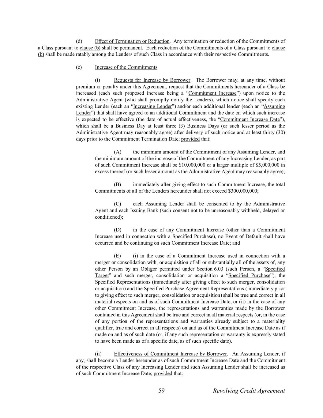 59 Revolving Credit Agreement (d) Effect of Termination or Reduction. Any termination or reduction of the Commitments of a Class pursuant to clause (b) shall be permanent. Each reduction of the Commitments of a Class pursuant to clause (b) shall be made ratably among the Lenders of such Class in accordance with their respective Commitments. (e) Increase of the Commitments. (i) Requests for Increase by Borrower. The Borrower may, at any time, without premium or penalty under this Agreement, request that the Commitments hereunder of a Class be increased (each such proposed increase being a “Commitment Increase”) upon notice to the Administrative Agent (who shall promptly notify the Lenders), which notice shall specify each existing Lender (each an “Increasing Lender”) and/or each additional lender (each an “Assuming Lender”) that shall have agreed to an additional Commitment and the date on which such increase is expected to be effective (the date of actual effectiveness, the “Commitment Increase Date”), which shall be a Business Day at least three (3) Business Days (or such lesser period as the Administrative Agent may reasonably agree) after delivery of such notice and at least thirty (30) days prior to the Commitment Termination Date; provided that: (A) the minimum amount of the Commitment of any Assuming Lender, and the minimum amount of the increase of the Commitment of any Increasing Lender, as part of such Commitment Increase shall be $10,000,000 or a larger multiple of $5,000,000 in excess thereof (or such lesser amount as the Administrative Agent may reasonably agree); (B) immediately after giving effect to such Commitment Increase, the total Commitments of all of the Lenders hereunder shall not exceed $300,000,000; (C) each Assuming Lender shall be consented to by the Administrative Agent and each Issuing Bank (such consent not to be unreasonably withheld, delayed or conditioned); (D) in the case of any Commitment Increase (other than a Commitment Increase used in connection with a Specified Purchase), no Event of Default shall have occurred and be continuing on such Commitment Increase Date; and (E) (i) in the case of a Commitment Increase used in connection with a merger or consolidation with, or acquisition of all or substantially all of the assets of, any other Person by an Obligor permitted under Section 6.03 (such Person, a “Specified Target” and such merger, consolidation or acquisition a “Specified Purchase”), the Specified Representations (immediately after giving effect to such merger, consolidation or acquisition) and the Specified Purchase Agreement Representations (immediately prior to giving effect to such merger, consolidation or acquisition) shall be true and correct in all material respects on and as of such Commitment Increase Date, or (ii) in the case of any other Commitment Increase, the representations and warranties made by the Borrower contained in this Agreement shall be true and correct in all material respects (or, in the case of any portion of the representations and warranties already subject to a materiality qualifier, true and correct in all respects) on and as of the Commitment Increase Date as if made on and as of such date (or, if any such representation or warranty is expressly stated to have been made as of a specific date, as of such specific date). (ii) Effectiveness of Commitment Increase by Borrower. An Assuming Lender, if any, shall become a Lender hereunder as of such Commitment Increase Date and the Commitment of the respective Class of any Increasing Lender and such Assuming Lender shall be increased as of such Commitment Increase Date; provided that: