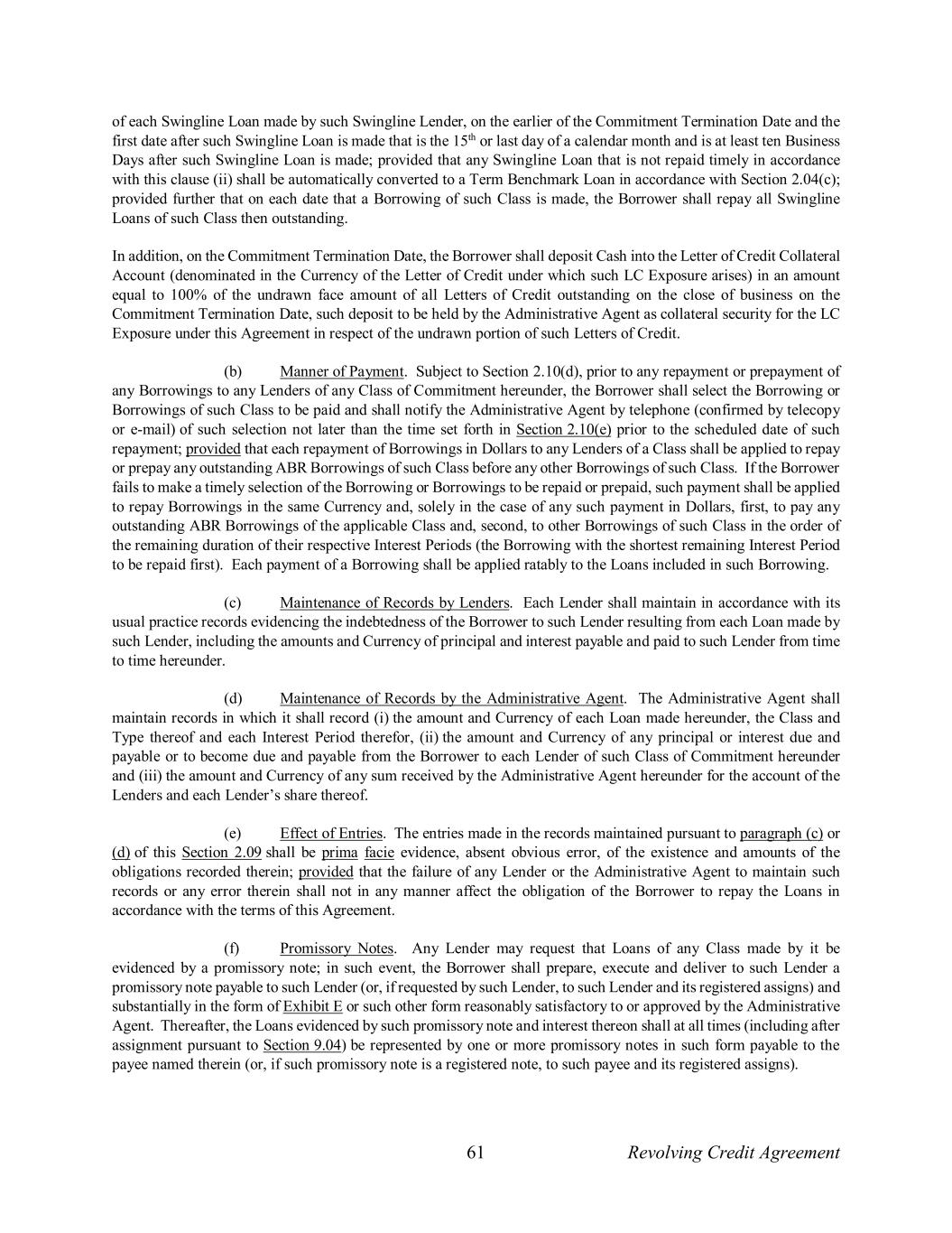 61 Revolving Credit Agreement of each Swingline Loan made by such Swingline Lender, on the earlier of the Commitment Termination Date and the first date after such Swingline Loan is made that is the 15th or last day of a calendar month and is at least ten Business Days after such Swingline Loan is made; provided that any Swingline Loan that is not repaid timely in accordance with this clause (ii) shall be automatically converted to a Term Benchmark Loan in accordance with Section 2.04(c); provided further that on each date that a Borrowing of such Class is made, the Borrower shall repay all Swingline Loans of such Class then outstanding. In addition, on the Commitment Termination Date, the Borrower shall deposit Cash into the Letter of Credit Collateral Account (denominated in the Currency of the Letter of Credit under which such LC Exposure arises) in an amount equal to 100% of the undrawn face amount of all Letters of Credit outstanding on the close of business on the Commitment Termination Date, such deposit to be held by the Administrative Agent as collateral security for the LC Exposure under this Agreement in respect of the undrawn portion of such Letters of Credit. (b) Manner of Payment. Subject to Section 2.10(d), prior to any repayment or prepayment of any Borrowings to any Lenders of any Class of Commitment hereunder, the Borrower shall select the Borrowing or Borrowings of such Class to be paid and shall notify the Administrative Agent by telephone (confirmed by telecopy or e-mail) of such selection not later than the time set forth in Section 2.10(e) prior to the scheduled date of such repayment; provided that each repayment of Borrowings in Dollars to any Lenders of a Class shall be applied to repay or prepay any outstanding ABR Borrowings of such Class before any other Borrowings of such Class. If the Borrower fails to make a timely selection of the Borrowing or Borrowings to be repaid or prepaid, such payment shall be applied to repay Borrowings in the same Currency and, solely in the case of any such payment in Dollars, first, to pay any outstanding ABR Borrowings of the applicable Class and, second, to other Borrowings of such Class in the order of the remaining duration of their respective Interest Periods (the Borrowing with the shortest remaining Interest Period to be repaid first). Each payment of a Borrowing shall be applied ratably to the Loans included in such Borrowing. (c) Maintenance of Records by Lenders. Each Lender shall maintain in accordance with its usual practice records evidencing the indebtedness of the Borrower to such Lender resulting from each Loan made by such Lender, including the amounts and Currency of principal and interest payable and paid to such Lender from time to time hereunder. (d) Maintenance of Records by the Administrative Agent. The Administrative Agent shall maintain records in which it shall record (i) the amount and Currency of each Loan made hereunder, the Class and Type thereof and each Interest Period therefor, (ii) the amount and Currency of any principal or interest due and payable or to become due and payable from the Borrower to each Lender of such Class of Commitment hereunder and (iii) the amount and Currency of any sum received by the Administrative Agent hereunder for the account of the Lenders and each Lender’s share thereof. (e) Effect of Entries. The entries made in the records maintained pursuant to paragraph (c) or (d) of this Section 2.09 shall be prima facie evidence, absent obvious error, of the existence and amounts of the obligations recorded therein; provided that the failure of any Lender or the Administrative Agent to maintain such records or any error therein shall not in any manner affect the obligation of the Borrower to repay the Loans in accordance with the terms of this Agreement. (f) Promissory Notes. Any Lender may request that Loans of any Class made by it be evidenced by a promissory note; in such event, the Borrower shall prepare, execute and deliver to such Lender a promissory note payable to such Lender (or, if requested by such Lender, to such Lender and its registered assigns) and substantially in the form of Exhibit E or such other form reasonably satisfactory to or approved by the Administrative Agent. Thereafter, the Loans evidenced by such promissory note and interest thereon shall at all times (including after assignment pursuant to Section 9.04) be represented by one or more promissory notes in such form payable to the payee named therein (or, if such promissory note is a registered note, to such payee and its registered assigns).