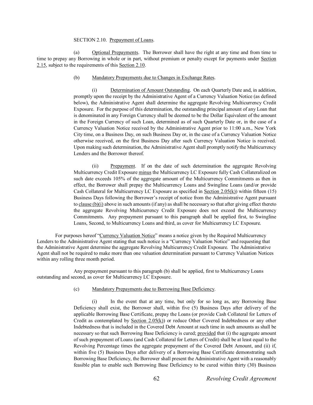 62 Revolving Credit Agreement SECTION 2.10. Prepayment of Loans. (a) Optional Prepayments. The Borrower shall have the right at any time and from time to time to prepay any Borrowing in whole or in part, without premium or penalty except for payments under Section 2.15, subject to the requirements of this Section 2.10. (b) Mandatory Prepayments due to Changes in Exchange Rates. (i) Determination of Amount Outstanding. On each Quarterly Date and, in addition, promptly upon the receipt by the Administrative Agent of a Currency Valuation Notice (as defined below), the Administrative Agent shall determine the aggregate Revolving Multicurrency Credit Exposure. For the purpose of this determination, the outstanding principal amount of any Loan that is denominated in any Foreign Currency shall be deemed to be the Dollar Equivalent of the amount in the Foreign Currency of such Loan, determined as of such Quarterly Date or, in the case of a Currency Valuation Notice received by the Administrative Agent prior to 11:00 a.m., New York City time, on a Business Day, on such Business Day or, in the case of a Currency Valuation Notice otherwise received, on the first Business Day after such Currency Valuation Notice is received. Upon making such determination, the Administrative Agent shall promptly notify the Multicurrency Lenders and the Borrower thereof. (ii) Prepayment. If on the date of such determination the aggregate Revolving Multicurrency Credit Exposure minus the Multicurrency LC Exposure fully Cash Collateralized on such date exceeds 105% of the aggregate amount of the Multicurrency Commitments as then in effect, the Borrower shall prepay the Multicurrency Loans and Swingline Loans (and/or provide Cash Collateral for Multicurrency LC Exposure as specified in Section 2.05(k)) within fifteen (15) Business Days following the Borrower’s receipt of notice from the Administrative Agent pursuant to clause (b)(i) above in such amounts (if any) as shall be necessary so that after giving effect thereto the aggregate Revolving Multicurrency Credit Exposure does not exceed the Multicurrency Commitments. Any prepayment pursuant to this paragraph shall be applied first, to Swingline Loans, Second, to Multicurrency Loans and third, as cover for Multicurrency LC Exposure. For purposes hereof “Currency Valuation Notice” means a notice given by the Required Multicurrency Lenders to the Administrative Agent stating that such notice is a “Currency Valuation Notice” and requesting that the Administrative Agent determine the aggregate Revolving Multicurrency Credit Exposure. The Administrative Agent shall not be required to make more than one valuation determination pursuant to Currency Valuation Notices within any rolling three month period. Any prepayment pursuant to this paragraph (b) shall be applied, first to Multicurrency Loans outstanding and second, as cover for Multicurrency LC Exposure. (c) Mandatory Prepayments due to Borrowing Base Deficiency. (i) In the event that at any time, but only for so long as, any Borrowing Base Deficiency shall exist, the Borrower shall, within five (5) Business Days after delivery of the applicable Borrowing Base Certificate, prepay the Loans (or provide Cash Collateral for Letters of Credit as contemplated by Section 2.05(k)) or reduce Other Covered Indebtedness or any other Indebtedness that is included in the Covered Debt Amount at such time in such amounts as shall be necessary so that such Borrowing Base Deficiency is cured; provided that (i) the aggregate amount of such prepayment of Loans (and Cash Collateral for Letters of Credit) shall be at least equal to the Revolving Percentage times the aggregate prepayment of the Covered Debt Amount, and (ii) if, within five (5) Business Days after delivery of a Borrowing Base Certificate demonstrating such Borrowing Base Deficiency, the Borrower shall present the Administrative Agent with a reasonably feasible plan to enable such Borrowing Base Deficiency to be cured within thirty (30) Business