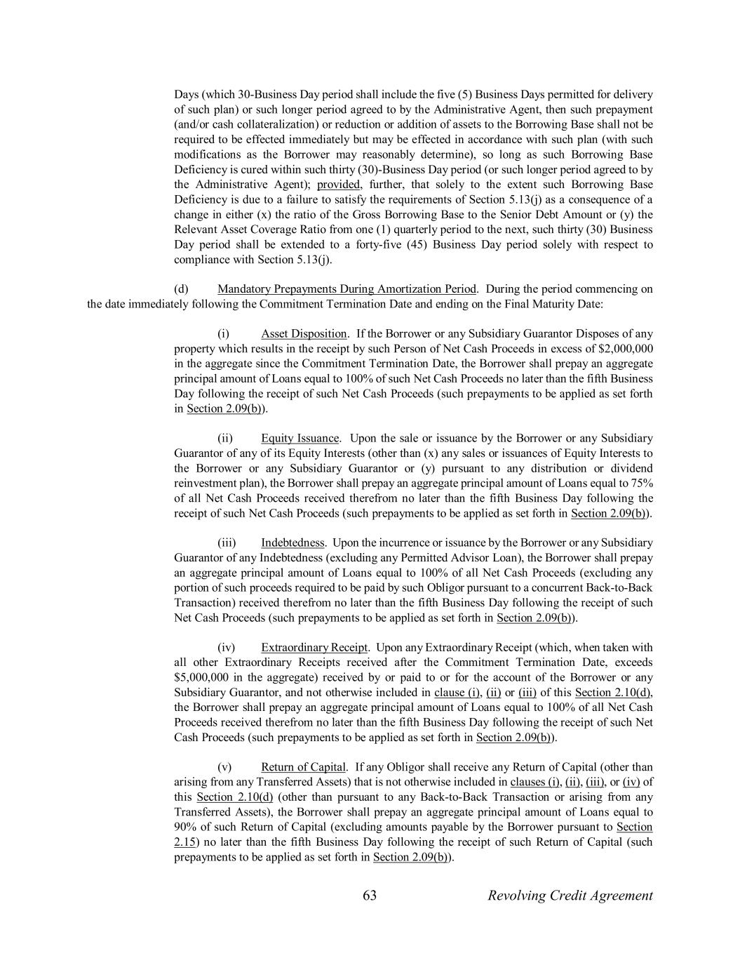 63 Revolving Credit Agreement Days (which 30-Business Day period shall include the five (5) Business Days permitted for delivery of such plan) or such longer period agreed to by the Administrative Agent, then such prepayment (and/or cash collateralization) or reduction or addition of assets to the Borrowing Base shall not be required to be effected immediately but may be effected in accordance with such plan (with such modifications as the Borrower may reasonably determine), so long as such Borrowing Base Deficiency is cured within such thirty (30)-Business Day period (or such longer period agreed to by the Administrative Agent); provided, further, that solely to the extent such Borrowing Base Deficiency is due to a failure to satisfy the requirements of Section 5.13(j) as a consequence of a change in either (x) the ratio of the Gross Borrowing Base to the Senior Debt Amount or (y) the Relevant Asset Coverage Ratio from one (1) quarterly period to the next, such thirty (30) Business Day period shall be extended to a forty-five (45) Business Day period solely with respect to compliance with Section 5.13(j). (d) Mandatory Prepayments During Amortization Period. During the period commencing on the date immediately following the Commitment Termination Date and ending on the Final Maturity Date: (i) Asset Disposition. If the Borrower or any Subsidiary Guarantor Disposes of any property which results in the receipt by such Person of Net Cash Proceeds in excess of $2,000,000 in the aggregate since the Commitment Termination Date, the Borrower shall prepay an aggregate principal amount of Loans equal to 100% of such Net Cash Proceeds no later than the fifth Business Day following the receipt of such Net Cash Proceeds (such prepayments to be applied as set forth in Section 2.09(b)). (ii) Equity Issuance. Upon the sale or issuance by the Borrower or any Subsidiary Guarantor of any of its Equity Interests (other than (x) any sales or issuances of Equity Interests to the Borrower or any Subsidiary Guarantor or (y) pursuant to any distribution or dividend reinvestment plan), the Borrower shall prepay an aggregate principal amount of Loans equal to 75% of all Net Cash Proceeds received therefrom no later than the fifth Business Day following the receipt of such Net Cash Proceeds (such prepayments to be applied as set forth in Section 2.09(b)). (iii) Indebtedness. Upon the incurrence or issuance by the Borrower or any Subsidiary Guarantor of any Indebtedness (excluding any Permitted Advisor Loan), the Borrower shall prepay an aggregate principal amount of Loans equal to 100% of all Net Cash Proceeds (excluding any portion of such proceeds required to be paid by such Obligor pursuant to a concurrent Back-to-Back Transaction) received therefrom no later than the fifth Business Day following the receipt of such Net Cash Proceeds (such prepayments to be applied as set forth in Section 2.09(b)). (iv) Extraordinary Receipt. Upon any Extraordinary Receipt (which, when taken with all other Extraordinary Receipts received after the Commitment Termination Date, exceeds $5,000,000 in the aggregate) received by or paid to or for the account of the Borrower or any Subsidiary Guarantor, and not otherwise included in clause (i), (ii) or (iii) of this Section 2.10(d), the Borrower shall prepay an aggregate principal amount of Loans equal to 100% of all Net Cash Proceeds received therefrom no later than the fifth Business Day following the receipt of such Net Cash Proceeds (such prepayments to be applied as set forth in Section 2.09(b)). (v) Return of Capital. If any Obligor shall receive any Return of Capital (other than arising from any Transferred Assets) that is not otherwise included in clauses (i), (ii), (iii), or (iv) of this Section 2.10(d) (other than pursuant to any Back-to-Back Transaction or arising from any Transferred Assets), the Borrower shall prepay an aggregate principal amount of Loans equal to 90% of such Return of Capital (excluding amounts payable by the Borrower pursuant to Section 2.15) no later than the fifth Business Day following the receipt of such Return of Capital (such prepayments to be applied as set forth in Section 2.09(b)).