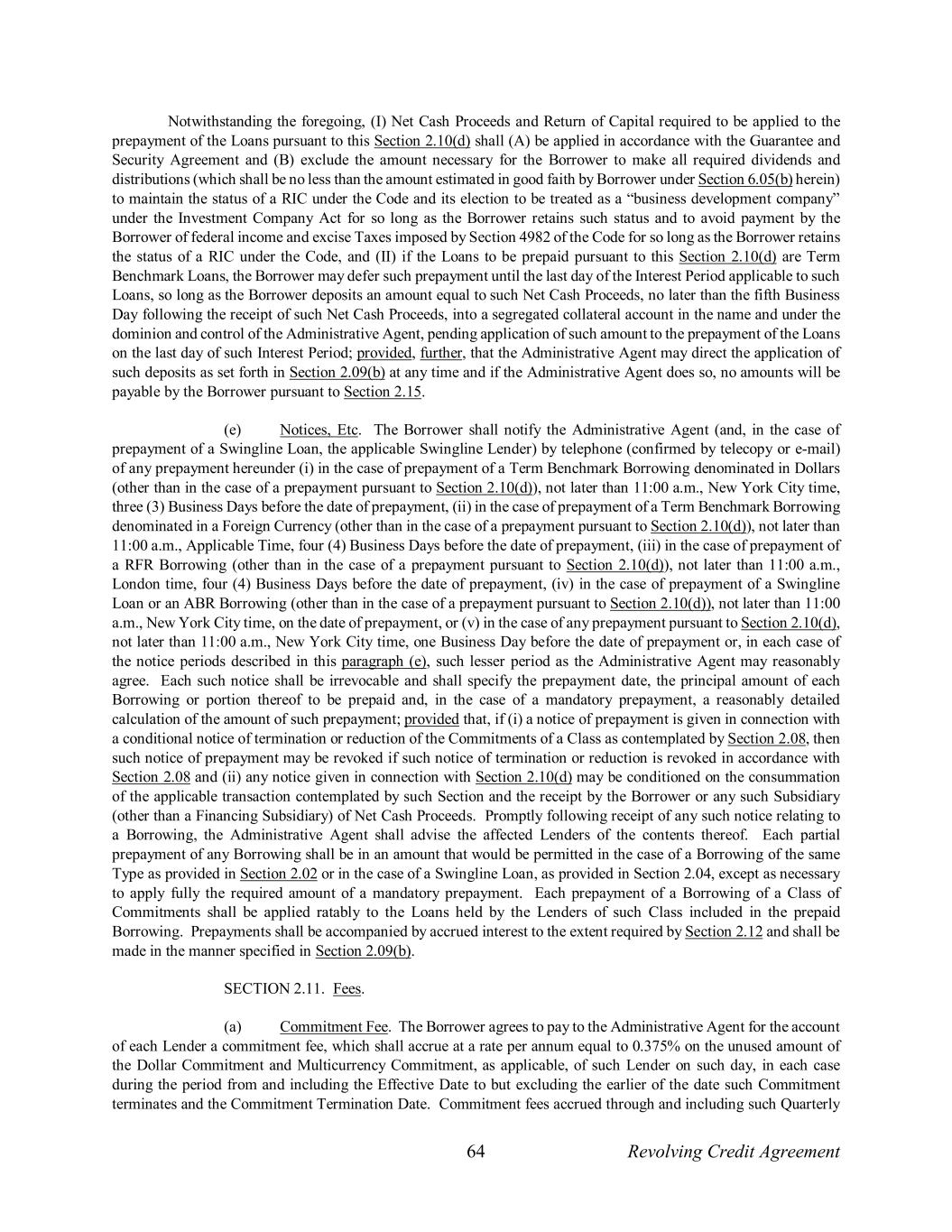 64 Revolving Credit Agreement Notwithstanding the foregoing, (I) Net Cash Proceeds and Return of Capital required to be applied to the prepayment of the Loans pursuant to this Section 2.10(d) shall (A) be applied in accordance with the Guarantee and Security Agreement and (B) exclude the amount necessary for the Borrower to make all required dividends and distributions (which shall be no less than the amount estimated in good faith by Borrower under Section 6.05(b) herein) to maintain the status of a RIC under the Code and its election to be treated as a “business development company” under the Investment Company Act for so long as the Borrower retains such status and to avoid payment by the Borrower of federal income and excise Taxes imposed by Section 4982 of the Code for so long as the Borrower retains the status of a RIC under the Code, and (II) if the Loans to be prepaid pursuant to this Section 2.10(d) are Term Benchmark Loans, the Borrower may defer such prepayment until the last day of the Interest Period applicable to such Loans, so long as the Borrower deposits an amount equal to such Net Cash Proceeds, no later than the fifth Business Day following the receipt of such Net Cash Proceeds, into a segregated collateral account in the name and under the dominion and control of the Administrative Agent, pending application of such amount to the prepayment of the Loans on the last day of such Interest Period; provided, further, that the Administrative Agent may direct the application of such deposits as set forth in Section 2.09(b) at any time and if the Administrative Agent does so, no amounts will be payable by the Borrower pursuant to Section 2.15. (e) Notices, Etc. The Borrower shall notify the Administrative Agent (and, in the case of prepayment of a Swingline Loan, the applicable Swingline Lender) by telephone (confirmed by telecopy or e-mail) of any prepayment hereunder (i) in the case of prepayment of a Term Benchmark Borrowing denominated in Dollars (other than in the case of a prepayment pursuant to Section 2.10(d)), not later than 11:00 a.m., New York City time, three (3) Business Days before the date of prepayment, (ii) in the case of prepayment of a Term Benchmark Borrowing denominated in a Foreign Currency (other than in the case of a prepayment pursuant to Section 2.10(d)), not later than 11:00 a.m., Applicable Time, four (4) Business Days before the date of prepayment, (iii) in the case of prepayment of a RFR Borrowing (other than in the case of a prepayment pursuant to Section 2.10(d)), not later than 11:00 a.m., London time, four (4) Business Days before the date of prepayment, (iv) in the case of prepayment of a Swingline Loan or an ABR Borrowing (other than in the case of a prepayment pursuant to Section 2.10(d)), not later than 11:00 a.m., New York City time, on the date of prepayment, or (v) in the case of any prepayment pursuant to Section 2.10(d), not later than 11:00 a.m., New York City time, one Business Day before the date of prepayment or, in each case of the notice periods described in this paragraph (e), such lesser period as the Administrative Agent may reasonably agree. Each such notice shall be irrevocable and shall specify the prepayment date, the principal amount of each Borrowing or portion thereof to be prepaid and, in the case of a mandatory prepayment, a reasonably detailed calculation of the amount of such prepayment; provided that, if (i) a notice of prepayment is given in connection with a conditional notice of termination or reduction of the Commitments of a Class as contemplated by Section 2.08, then such notice of prepayment may be revoked if such notice of termination or reduction is revoked in accordance with Section 2.08 and (ii) any notice given in connection with Section 2.10(d) may be conditioned on the consummation of the applicable transaction contemplated by such Section and the receipt by the Borrower or any such Subsidiary (other than a Financing Subsidiary) of Net Cash Proceeds. Promptly following receipt of any such notice relating to a Borrowing, the Administrative Agent shall advise the affected Lenders of the contents thereof. Each partial prepayment of any Borrowing shall be in an amount that would be permitted in the case of a Borrowing of the same Type as provided in Section 2.02 or in the case of a Swingline Loan, as provided in Section 2.04, except as necessary to apply fully the required amount of a mandatory prepayment. Each prepayment of a Borrowing of a Class of Commitments shall be applied ratably to the Loans held by the Lenders of such Class included in the prepaid Borrowing. Prepayments shall be accompanied by accrued interest to the extent required by Section 2.12 and shall be made in the manner specified in Section 2.09(b). SECTION 2.11. Fees. (a) Commitment Fee. The Borrower agrees to pay to the Administrative Agent for the account of each Lender a commitment fee, which shall accrue at a rate per annum equal to 0.375% on the unused amount of the Dollar Commitment and Multicurrency Commitment, as applicable, of such Lender on such day, in each case during the period from and including the Effective Date to but excluding the earlier of the date such Commitment terminates and the Commitment Termination Date. Commitment fees accrued through and including such Quarterly