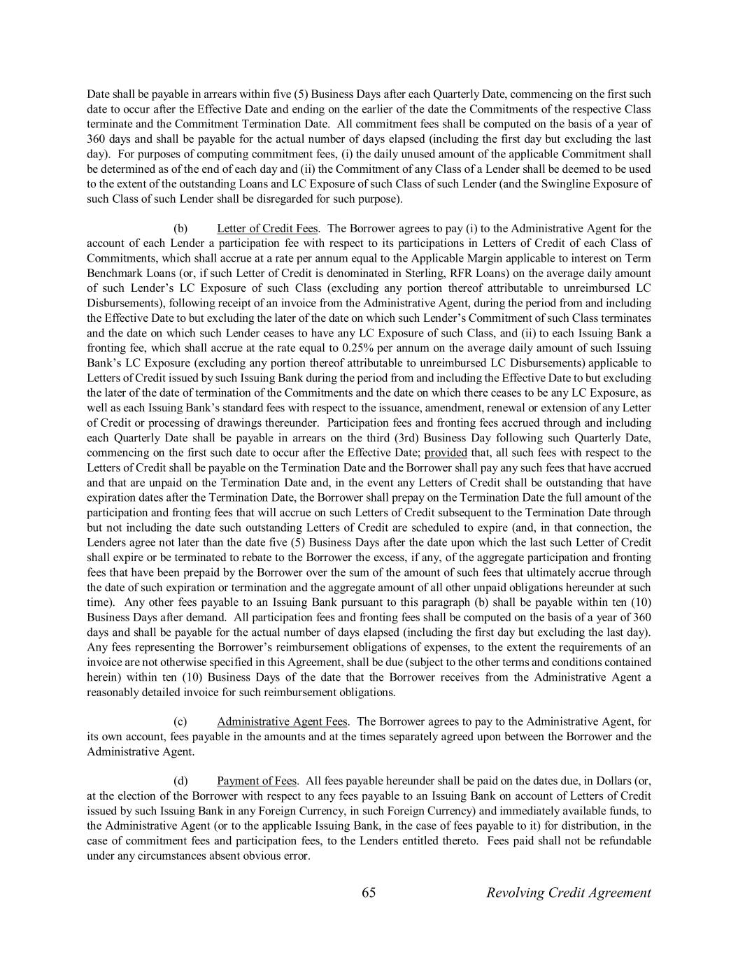 65 Revolving Credit Agreement Date shall be payable in arrears within five (5) Business Days after each Quarterly Date, commencing on the first such date to occur after the Effective Date and ending on the earlier of the date the Commitments of the respective Class terminate and the Commitment Termination Date. All commitment fees shall be computed on the basis of a year of 360 days and shall be payable for the actual number of days elapsed (including the first day but excluding the last day). For purposes of computing commitment fees, (i) the daily unused amount of the applicable Commitment shall be determined as of the end of each day and (ii) the Commitment of any Class of a Lender shall be deemed to be used to the extent of the outstanding Loans and LC Exposure of such Class of such Lender (and the Swingline Exposure of such Class of such Lender shall be disregarded for such purpose). (b) Letter of Credit Fees. The Borrower agrees to pay (i) to the Administrative Agent for the account of each Lender a participation fee with respect to its participations in Letters of Credit of each Class of Commitments, which shall accrue at a rate per annum equal to the Applicable Margin applicable to interest on Term Benchmark Loans (or, if such Letter of Credit is denominated in Sterling, RFR Loans) on the average daily amount of such Lender’s LC Exposure of such Class (excluding any portion thereof attributable to unreimbursed LC Disbursements), following receipt of an invoice from the Administrative Agent, during the period from and including the Effective Date to but excluding the later of the date on which such Lender’s Commitment of such Class terminates and the date on which such Lender ceases to have any LC Exposure of such Class, and (ii) to each Issuing Bank a fronting fee, which shall accrue at the rate equal to 0.25% per annum on the average daily amount of such Issuing Bank’s LC Exposure (excluding any portion thereof attributable to unreimbursed LC Disbursements) applicable to Letters of Credit issued by such Issuing Bank during the period from and including the Effective Date to but excluding the later of the date of termination of the Commitments and the date on which there ceases to be any LC Exposure, as well as each Issuing Bank’s standard fees with respect to the issuance, amendment, renewal or extension of any Letter of Credit or processing of drawings thereunder. Participation fees and fronting fees accrued through and including each Quarterly Date shall be payable in arrears on the third (3rd) Business Day following such Quarterly Date, commencing on the first such date to occur after the Effective Date; provided that, all such fees with respect to the Letters of Credit shall be payable on the Termination Date and the Borrower shall pay any such fees that have accrued and that are unpaid on the Termination Date and, in the event any Letters of Credit shall be outstanding that have expiration dates after the Termination Date, the Borrower shall prepay on the Termination Date the full amount of the participation and fronting fees that will accrue on such Letters of Credit subsequent to the Termination Date through but not including the date such outstanding Letters of Credit are scheduled to expire (and, in that connection, the Lenders agree not later than the date five (5) Business Days after the date upon which the last such Letter of Credit shall expire or be terminated to rebate to the Borrower the excess, if any, of the aggregate participation and fronting fees that have been prepaid by the Borrower over the sum of the amount of such fees that ultimately accrue through the date of such expiration or termination and the aggregate amount of all other unpaid obligations hereunder at such time). Any other fees payable to an Issuing Bank pursuant to this paragraph (b) shall be payable within ten (10) Business Days after demand. All participation fees and fronting fees shall be computed on the basis of a year of 360 days and shall be payable for the actual number of days elapsed (including the first day but excluding the last day). Any fees representing the Borrower’s reimbursement obligations of expenses, to the extent the requirements of an invoice are not otherwise specified in this Agreement, shall be due (subject to the other terms and conditions contained herein) within ten (10) Business Days of the date that the Borrower receives from the Administrative Agent a reasonably detailed invoice for such reimbursement obligations. (c) Administrative Agent Fees. The Borrower agrees to pay to the Administrative Agent, for its own account, fees payable in the amounts and at the times separately agreed upon between the Borrower and the Administrative Agent. (d) Payment of Fees. All fees payable hereunder shall be paid on the dates due, in Dollars (or, at the election of the Borrower with respect to any fees payable to an Issuing Bank on account of Letters of Credit issued by such Issuing Bank in any Foreign Currency, in such Foreign Currency) and immediately available funds, to the Administrative Agent (or to the applicable Issuing Bank, in the case of fees payable to it) for distribution, in the case of commitment fees and participation fees, to the Lenders entitled thereto. Fees paid shall not be refundable under any circumstances absent obvious error.