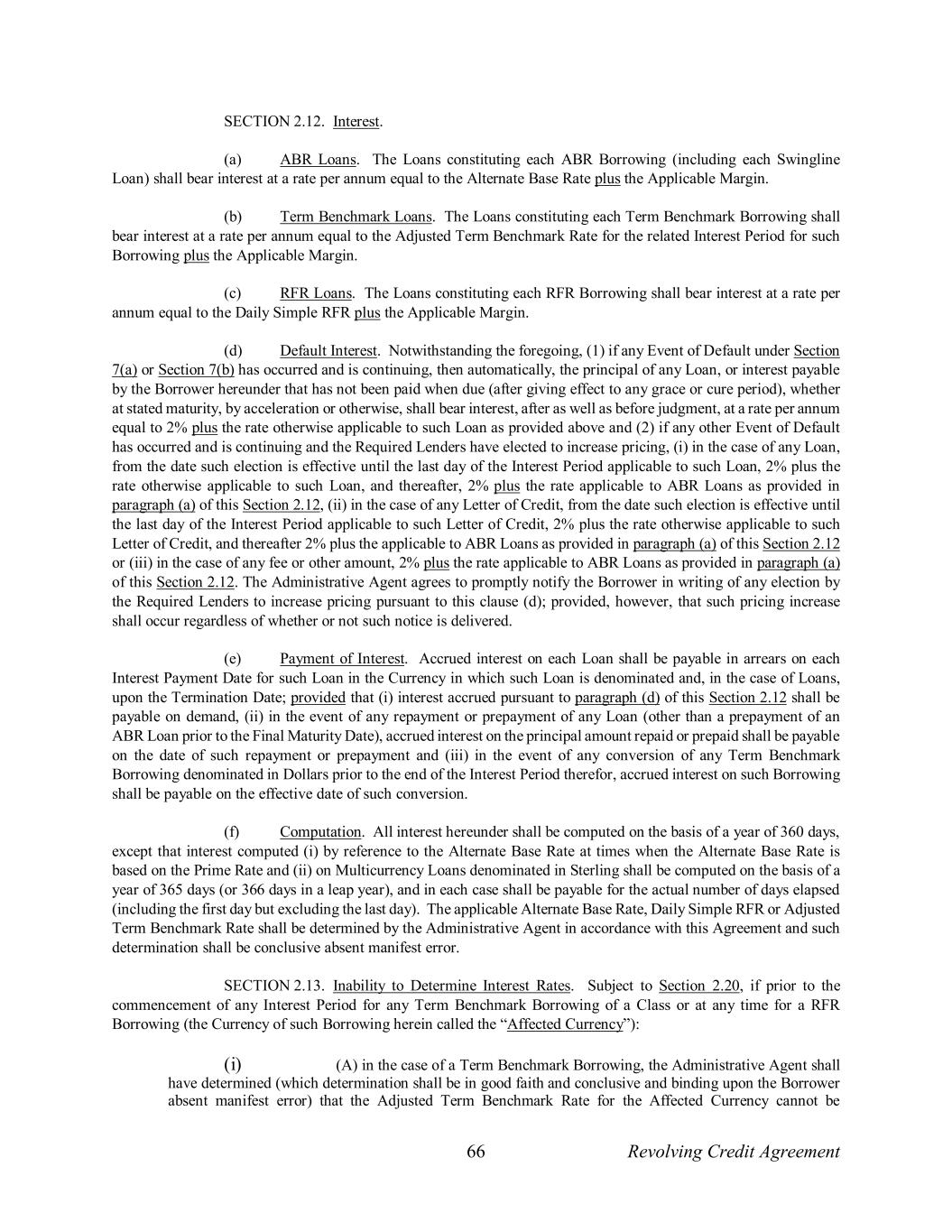 66 Revolving Credit Agreement SECTION 2.12. Interest. (a) ABR Loans. The Loans constituting each ABR Borrowing (including each Swingline Loan) shall bear interest at a rate per annum equal to the Alternate Base Rate plus the Applicable Margin. (b) Term Benchmark Loans. The Loans constituting each Term Benchmark Borrowing shall bear interest at a rate per annum equal to the Adjusted Term Benchmark Rate for the related Interest Period for such Borrowing plus the Applicable Margin. (c) RFR Loans. The Loans constituting each RFR Borrowing shall bear interest at a rate per annum equal to the Daily Simple RFR plus the Applicable Margin. (d) Default Interest. Notwithstanding the foregoing, (1) if any Event of Default under Section 7(a) or Section 7(b) has occurred and is continuing, then automatically, the principal of any Loan, or interest payable by the Borrower hereunder that has not been paid when due (after giving effect to any grace or cure period), whether at stated maturity, by acceleration or otherwise, shall bear interest, after as well as before judgment, at a rate per annum equal to 2% plus the rate otherwise applicable to such Loan as provided above and (2) if any other Event of Default has occurred and is continuing and the Required Lenders have elected to increase pricing, (i) in the case of any Loan, from the date such election is effective until the last day of the Interest Period applicable to such Loan, 2% plus the rate otherwise applicable to such Loan, and thereafter, 2% plus the rate applicable to ABR Loans as provided in paragraph (a) of this Section 2.12, (ii) in the case of any Letter of Credit, from the date such election is effective until the last day of the Interest Period applicable to such Letter of Credit, 2% plus the rate otherwise applicable to such Letter of Credit, and thereafter 2% plus the applicable to ABR Loans as provided in paragraph (a) of this Section 2.12 or (iii) in the case of any fee or other amount, 2% plus the rate applicable to ABR Loans as provided in paragraph (a) of this Section 2.12. The Administrative Agent agrees to promptly notify the Borrower in writing of any election by the Required Lenders to increase pricing pursuant to this clause (d); provided, however, that such pricing increase shall occur regardless of whether or not such notice is delivered. (e) Payment of Interest. Accrued interest on each Loan shall be payable in arrears on each Interest Payment Date for such Loan in the Currency in which such Loan is denominated and, in the case of Loans, upon the Termination Date; provided that (i) interest accrued pursuant to paragraph (d) of this Section 2.12 shall be payable on demand, (ii) in the event of any repayment or prepayment of any Loan (other than a prepayment of an ABR Loan prior to the Final Maturity Date), accrued interest on the principal amount repaid or prepaid shall be payable on the date of such repayment or prepayment and (iii) in the event of any conversion of any Term Benchmark Borrowing denominated in Dollars prior to the end of the Interest Period therefor, accrued interest on such Borrowing shall be payable on the effective date of such conversion. (f) Computation. All interest hereunder shall be computed on the basis of a year of 360 days, except that interest computed (i) by reference to the Alternate Base Rate at times when the Alternate Base Rate is based on the Prime Rate and (ii) on Multicurrency Loans denominated in Sterling shall be computed on the basis of a year of 365 days (or 366 days in a leap year), and in each case shall be payable for the actual number of days elapsed (including the first day but excluding the last day). The applicable Alternate Base Rate, Daily Simple RFR or Adjusted Term Benchmark Rate shall be determined by the Administrative Agent in accordance with this Agreement and such determination shall be conclusive absent manifest error. SECTION 2.13. Inability to Determine Interest Rates. Subject to Section 2.20, if prior to the commencement of any Interest Period for any Term Benchmark Borrowing of a Class or at any time for a RFR Borrowing (the Currency of such Borrowing herein called the “Affected Currency”): (i) (A) in the case of a Term Benchmark Borrowing, the Administrative Agent shall have determined (which determination shall be in good faith and conclusive and binding upon the Borrower absent manifest error) that the Adjusted Term Benchmark Rate for the Affected Currency cannot be