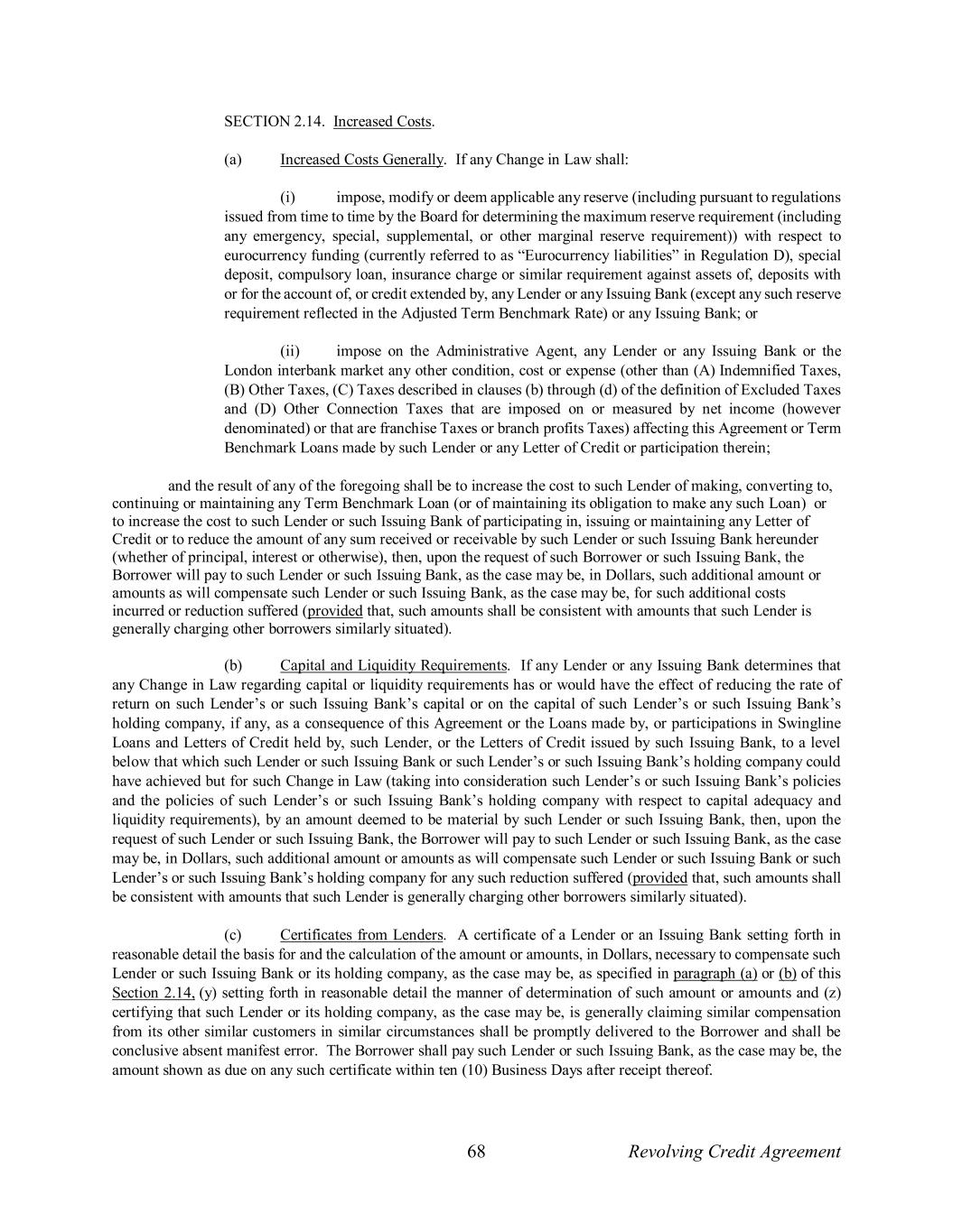 68 Revolving Credit Agreement SECTION 2.14. Increased Costs. (a) Increased Costs Generally. If any Change in Law shall: (i) impose, modify or deem applicable any reserve (including pursuant to regulations issued from time to time by the Board for determining the maximum reserve requirement (including any emergency, special, supplemental, or other marginal reserve requirement)) with respect to eurocurrency funding (currently referred to as “Eurocurrency liabilities” in Regulation D), special deposit, compulsory loan, insurance charge or similar requirement against assets of, deposits with or for the account of, or credit extended by, any Lender or any Issuing Bank (except any such reserve requirement reflected in the Adjusted Term Benchmark Rate) or any Issuing Bank; or (ii) impose on the Administrative Agent, any Lender or any Issuing Bank or the London interbank market any other condition, cost or expense (other than (A) Indemnified Taxes, (B) Other Taxes, (C) Taxes described in clauses (b) through (d) of the definition of Excluded Taxes and (D) Other Connection Taxes that are imposed on or measured by net income (however denominated) or that are franchise Taxes or branch profits Taxes) affecting this Agreement or Term Benchmark Loans made by such Lender or any Letter of Credit or participation therein; and the result of any of the foregoing shall be to increase the cost to such Lender of making, converting to, continuing or maintaining any Term Benchmark Loan (or of maintaining its obligation to make any such Loan) or to increase the cost to such Lender or such Issuing Bank of participating in, issuing or maintaining any Letter of Credit or to reduce the amount of any sum received or receivable by such Lender or such Issuing Bank hereunder (whether of principal, interest or otherwise), then, upon the request of such Borrower or such Issuing Bank, the Borrower will pay to such Lender or such Issuing Bank, as the case may be, in Dollars, such additional amount or amounts as will compensate such Lender or such Issuing Bank, as the case may be, for such additional costs incurred or reduction suffered (provided that, such amounts shall be consistent with amounts that such Lender is generally charging other borrowers similarly situated). (b) Capital and Liquidity Requirements. If any Lender or any Issuing Bank determines that any Change in Law regarding capital or liquidity requirements has or would have the effect of reducing the rate of return on such Lender’s or such Issuing Bank’s capital or on the capital of such Lender’s or such Issuing Bank’s holding company, if any, as a consequence of this Agreement or the Loans made by, or participations in Swingline Loans and Letters of Credit held by, such Lender, or the Letters of Credit issued by such Issuing Bank, to a level below that which such Lender or such Issuing Bank or such Lender’s or such Issuing Bank’s holding company could have achieved but for such Change in Law (taking into consideration such Lender’s or such Issuing Bank’s policies and the policies of such Lender’s or such Issuing Bank’s holding company with respect to capital adequacy and liquidity requirements), by an amount deemed to be material by such Lender or such Issuing Bank, then, upon the request of such Lender or such Issuing Bank, the Borrower will pay to such Lender or such Issuing Bank, as the case may be, in Dollars, such additional amount or amounts as will compensate such Lender or such Issuing Bank or such Lender’s or such Issuing Bank’s holding company for any such reduction suffered (provided that, such amounts shall be consistent with amounts that such Lender is generally charging other borrowers similarly situated). (c) Certificates from Lenders. A certificate of a Lender or an Issuing Bank setting forth in reasonable detail the basis for and the calculation of the amount or amounts, in Dollars, necessary to compensate such Lender or such Issuing Bank or its holding company, as the case may be, as specified in paragraph (a) or (b) of this Section 2.14, (y) setting forth in reasonable detail the manner of determination of such amount or amounts and (z) certifying that such Lender or its holding company, as the case may be, is generally claiming similar compensation from its other similar customers in similar circumstances shall be promptly delivered to the Borrower and shall be conclusive absent manifest error. The Borrower shall pay such Lender or such Issuing Bank, as the case may be, the amount shown as due on any such certificate within ten (10) Business Days after receipt thereof.