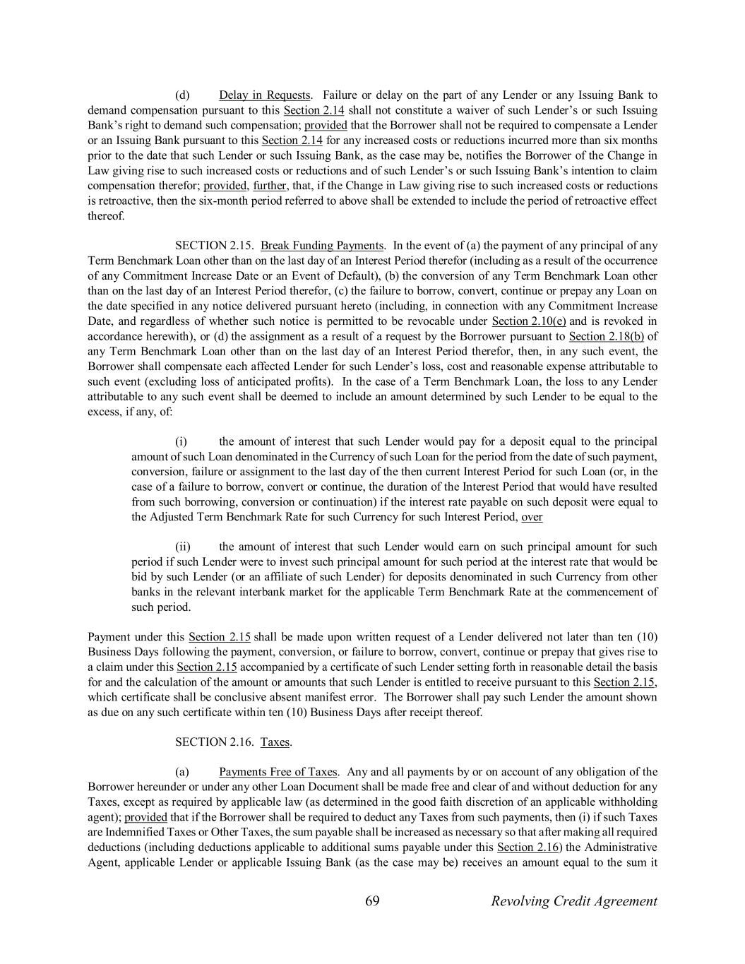 69 Revolving Credit Agreement (d) Delay in Requests. Failure or delay on the part of any Lender or any Issuing Bank to demand compensation pursuant to this Section 2.14 shall not constitute a waiver of such Lender’s or such Issuing Bank’s right to demand such compensation; provided that the Borrower shall not be required to compensate a Lender or an Issuing Bank pursuant to this Section 2.14 for any increased costs or reductions incurred more than six months prior to the date that such Lender or such Issuing Bank, as the case may be, notifies the Borrower of the Change in Law giving rise to such increased costs or reductions and of such Lender’s or such Issuing Bank’s intention to claim compensation therefor; provided, further, that, if the Change in Law giving rise to such increased costs or reductions is retroactive, then the six-month period referred to above shall be extended to include the period of retroactive effect thereof. SECTION 2.15. Break Funding Payments. In the event of (a) the payment of any principal of any Term Benchmark Loan other than on the last day of an Interest Period therefor (including as a result of the occurrence of any Commitment Increase Date or an Event of Default), (b) the conversion of any Term Benchmark Loan other than on the last day of an Interest Period therefor, (c) the failure to borrow, convert, continue or prepay any Loan on the date specified in any notice delivered pursuant hereto (including, in connection with any Commitment Increase Date, and regardless of whether such notice is permitted to be revocable under Section 2.10(e) and is revoked in accordance herewith), or (d) the assignment as a result of a request by the Borrower pursuant to Section 2.18(b) of any Term Benchmark Loan other than on the last day of an Interest Period therefor, then, in any such event, the Borrower shall compensate each affected Lender for such Lender’s loss, cost and reasonable expense attributable to such event (excluding loss of anticipated profits). In the case of a Term Benchmark Loan, the loss to any Lender attributable to any such event shall be deemed to include an amount determined by such Lender to be equal to the excess, if any, of: (i) the amount of interest that such Lender would pay for a deposit equal to the principal amount of such Loan denominated in the Currency of such Loan for the period from the date of such payment, conversion, failure or assignment to the last day of the then current Interest Period for such Loan (or, in the case of a failure to borrow, convert or continue, the duration of the Interest Period that would have resulted from such borrowing, conversion or continuation) if the interest rate payable on such deposit were equal to the Adjusted Term Benchmark Rate for such Currency for such Interest Period, over (ii) the amount of interest that such Lender would earn on such principal amount for such period if such Lender were to invest such principal amount for such period at the interest rate that would be bid by such Lender (or an affiliate of such Lender) for deposits denominated in such Currency from other banks in the relevant interbank market for the applicable Term Benchmark Rate at the commencement of such period. Payment under this Section 2.15 shall be made upon written request of a Lender delivered not later than ten (10) Business Days following the payment, conversion, or failure to borrow, convert, continue or prepay that gives rise to a claim under this Section 2.15 accompanied by a certificate of such Lender setting forth in reasonable detail the basis for and the calculation of the amount or amounts that such Lender is entitled to receive pursuant to this Section 2.15, which certificate shall be conclusive absent manifest error. The Borrower shall pay such Lender the amount shown as due on any such certificate within ten (10) Business Days after receipt thereof. SECTION 2.16. Taxes. (a) Payments Free of Taxes. Any and all payments by or on account of any obligation of the Borrower hereunder or under any other Loan Document shall be made free and clear of and without deduction for any Taxes, except as required by applicable law (as determined in the good faith discretion of an applicable withholding agent); provided that if the Borrower shall be required to deduct any Taxes from such payments, then (i) if such Taxes are Indemnified Taxes or Other Taxes, the sum payable shall be increased as necessary so that after making all required deductions (including deductions applicable to additional sums payable under this Section 2.16) the Administrative Agent, applicable Lender or applicable Issuing Bank (as the case may be) receives an amount equal to the sum it