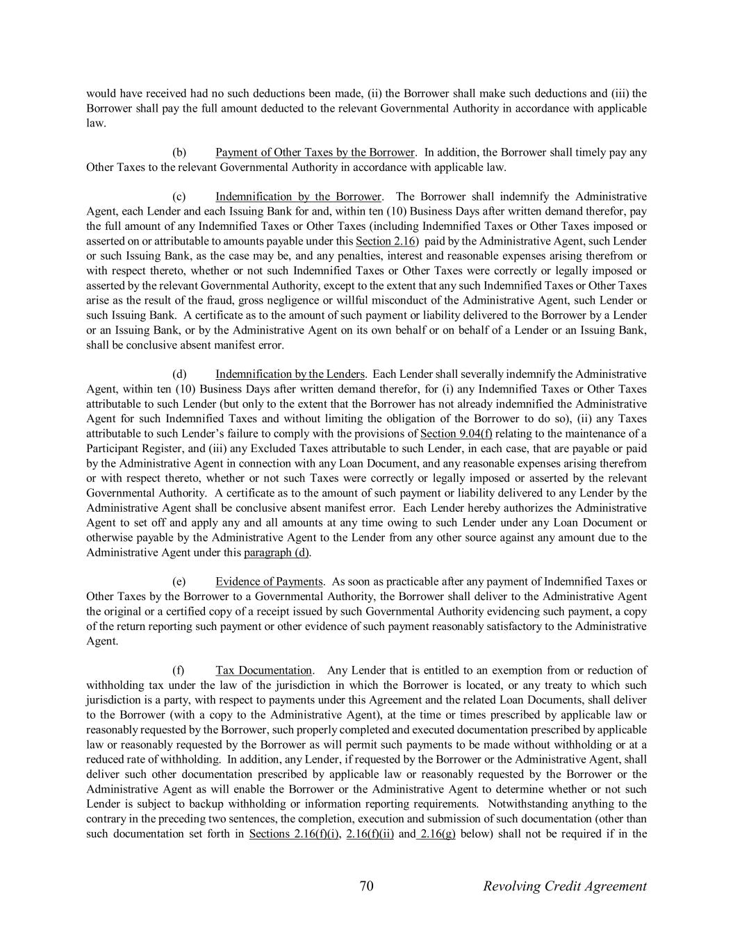 70 Revolving Credit Agreement would have received had no such deductions been made, (ii) the Borrower shall make such deductions and (iii) the Borrower shall pay the full amount deducted to the relevant Governmental Authority in accordance with applicable law. (b) Payment of Other Taxes by the Borrower. In addition, the Borrower shall timely pay any Other Taxes to the relevant Governmental Authority in accordance with applicable law. (c) Indemnification by the Borrower. The Borrower shall indemnify the Administrative Agent, each Lender and each Issuing Bank for and, within ten (10) Business Days after written demand therefor, pay the full amount of any Indemnified Taxes or Other Taxes (including Indemnified Taxes or Other Taxes imposed or asserted on or attributable to amounts payable under this Section 2.16) paid by the Administrative Agent, such Lender or such Issuing Bank, as the case may be, and any penalties, interest and reasonable expenses arising therefrom or with respect thereto, whether or not such Indemnified Taxes or Other Taxes were correctly or legally imposed or asserted by the relevant Governmental Authority, except to the extent that any such Indemnified Taxes or Other Taxes arise as the result of the fraud, gross negligence or willful misconduct of the Administrative Agent, such Lender or such Issuing Bank. A certificate as to the amount of such payment or liability delivered to the Borrower by a Lender or an Issuing Bank, or by the Administrative Agent on its own behalf or on behalf of a Lender or an Issuing Bank, shall be conclusive absent manifest error. (d) Indemnification by the Lenders. Each Lender shall severally indemnify the Administrative Agent, within ten (10) Business Days after written demand therefor, for (i) any Indemnified Taxes or Other Taxes attributable to such Lender (but only to the extent that the Borrower has not already indemnified the Administrative Agent for such Indemnified Taxes and without limiting the obligation of the Borrower to do so), (ii) any Taxes attributable to such Lender’s failure to comply with the provisions of Section 9.04(f) relating to the maintenance of a Participant Register, and (iii) any Excluded Taxes attributable to such Lender, in each case, that are payable or paid by the Administrative Agent in connection with any Loan Document, and any reasonable expenses arising therefrom or with respect thereto, whether or not such Taxes were correctly or legally imposed or asserted by the relevant Governmental Authority. A certificate as to the amount of such payment or liability delivered to any Lender by the Administrative Agent shall be conclusive absent manifest error. Each Lender hereby authorizes the Administrative Agent to set off and apply any and all amounts at any time owing to such Lender under any Loan Document or otherwise payable by the Administrative Agent to the Lender from any other source against any amount due to the Administrative Agent under this paragraph (d). (e) Evidence of Payments. As soon as practicable after any payment of Indemnified Taxes or Other Taxes by the Borrower to a Governmental Authority, the Borrower shall deliver to the Administrative Agent the original or a certified copy of a receipt issued by such Governmental Authority evidencing such payment, a copy of the return reporting such payment or other evidence of such payment reasonably satisfactory to the Administrative Agent. (f) Tax Documentation. Any Lender that is entitled to an exemption from or reduction of withholding tax under the law of the jurisdiction in which the Borrower is located, or any treaty to which such jurisdiction is a party, with respect to payments under this Agreement and the related Loan Documents, shall deliver to the Borrower (with a copy to the Administrative Agent), at the time or times prescribed by applicable law or reasonably requested by the Borrower, such properly completed and executed documentation prescribed by applicable law or reasonably requested by the Borrower as will permit such payments to be made without withholding or at a reduced rate of withholding. In addition, any Lender, if requested by the Borrower or the Administrative Agent, shall deliver such other documentation prescribed by applicable law or reasonably requested by the Borrower or the Administrative Agent as will enable the Borrower or the Administrative Agent to determine whether or not such Lender is subject to backup withholding or information reporting requirements. Notwithstanding anything to the contrary in the preceding two sentences, the completion, execution and submission of such documentation (other than such documentation set forth in Sections 2.16(f)(i), 2.16(f)(ii) and 2.16(g) below) shall not be required if in the