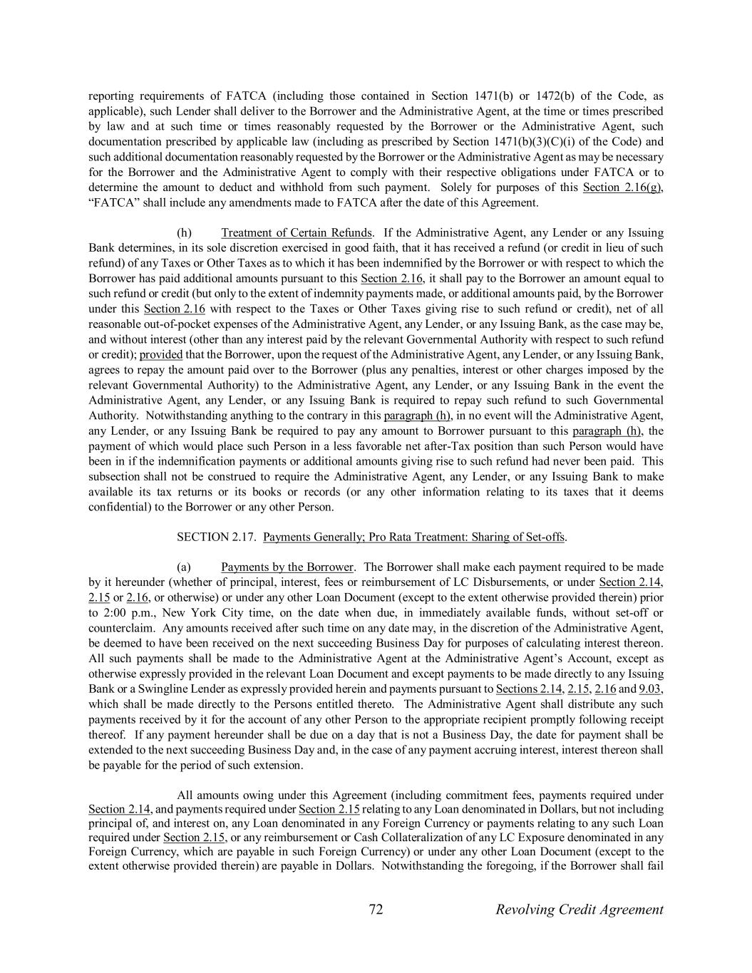 72 Revolving Credit Agreement reporting requirements of FATCA (including those contained in Section 1471(b) or 1472(b) of the Code, as applicable), such Lender shall deliver to the Borrower and the Administrative Agent, at the time or times prescribed by law and at such time or times reasonably requested by the Borrower or the Administrative Agent, such documentation prescribed by applicable law (including as prescribed by Section 1471(b)(3)(C)(i) of the Code) and such additional documentation reasonably requested by the Borrower or the Administrative Agent as may be necessary for the Borrower and the Administrative Agent to comply with their respective obligations under FATCA or to determine the amount to deduct and withhold from such payment. Solely for purposes of this Section 2.16(g), “FATCA” shall include any amendments made to FATCA after the date of this Agreement. (h) Treatment of Certain Refunds. If the Administrative Agent, any Lender or any Issuing Bank determines, in its sole discretion exercised in good faith, that it has received a refund (or credit in lieu of such refund) of any Taxes or Other Taxes as to which it has been indemnified by the Borrower or with respect to which the Borrower has paid additional amounts pursuant to this Section 2.16, it shall pay to the Borrower an amount equal to such refund or credit (but only to the extent of indemnity payments made, or additional amounts paid, by the Borrower under this Section 2.16 with respect to the Taxes or Other Taxes giving rise to such refund or credit), net of all reasonable out-of-pocket expenses of the Administrative Agent, any Lender, or any Issuing Bank, as the case may be, and without interest (other than any interest paid by the relevant Governmental Authority with respect to such refund or credit); provided that the Borrower, upon the request of the Administrative Agent, any Lender, or any Issuing Bank, agrees to repay the amount paid over to the Borrower (plus any penalties, interest or other charges imposed by the relevant Governmental Authority) to the Administrative Agent, any Lender, or any Issuing Bank in the event the Administrative Agent, any Lender, or any Issuing Bank is required to repay such refund to such Governmental Authority. Notwithstanding anything to the contrary in this paragraph (h), in no event will the Administrative Agent, any Lender, or any Issuing Bank be required to pay any amount to Borrower pursuant to this paragraph (h), the payment of which would place such Person in a less favorable net after-Tax position than such Person would have been in if the indemnification payments or additional amounts giving rise to such refund had never been paid. This subsection shall not be construed to require the Administrative Agent, any Lender, or any Issuing Bank to make available its tax returns or its books or records (or any other information relating to its taxes that it deems confidential) to the Borrower or any other Person. SECTION 2.17. Payments Generally; Pro Rata Treatment: Sharing of Set-offs. (a) Payments by the Borrower. The Borrower shall make each payment required to be made by it hereunder (whether of principal, interest, fees or reimbursement of LC Disbursements, or under Section 2.14, 2.15 or 2.16, or otherwise) or under any other Loan Document (except to the extent otherwise provided therein) prior to 2:00 p.m., New York City time, on the date when due, in immediately available funds, without set-off or counterclaim. Any amounts received after such time on any date may, in the discretion of the Administrative Agent, be deemed to have been received on the next succeeding Business Day for purposes of calculating interest thereon. All such payments shall be made to the Administrative Agent at the Administrative Agent’s Account, except as otherwise expressly provided in the relevant Loan Document and except payments to be made directly to any Issuing Bank or a Swingline Lender as expressly provided herein and payments pursuant to Sections 2.14, 2.15, 2.16 and 9.03, which shall be made directly to the Persons entitled thereto. The Administrative Agent shall distribute any such payments received by it for the account of any other Person to the appropriate recipient promptly following receipt thereof. If any payment hereunder shall be due on a day that is not a Business Day, the date for payment shall be extended to the next succeeding Business Day and, in the case of any payment accruing interest, interest thereon shall be payable for the period of such extension. All amounts owing under this Agreement (including commitment fees, payments required under Section 2.14, and payments required under Section 2.15 relating to any Loan denominated in Dollars, but not including principal of, and interest on, any Loan denominated in any Foreign Currency or payments relating to any such Loan required under Section 2.15, or any reimbursement or Cash Collateralization of any LC Exposure denominated in any Foreign Currency, which are payable in such Foreign Currency) or under any other Loan Document (except to the extent otherwise provided therein) are payable in Dollars. Notwithstanding the foregoing, if the Borrower shall fail