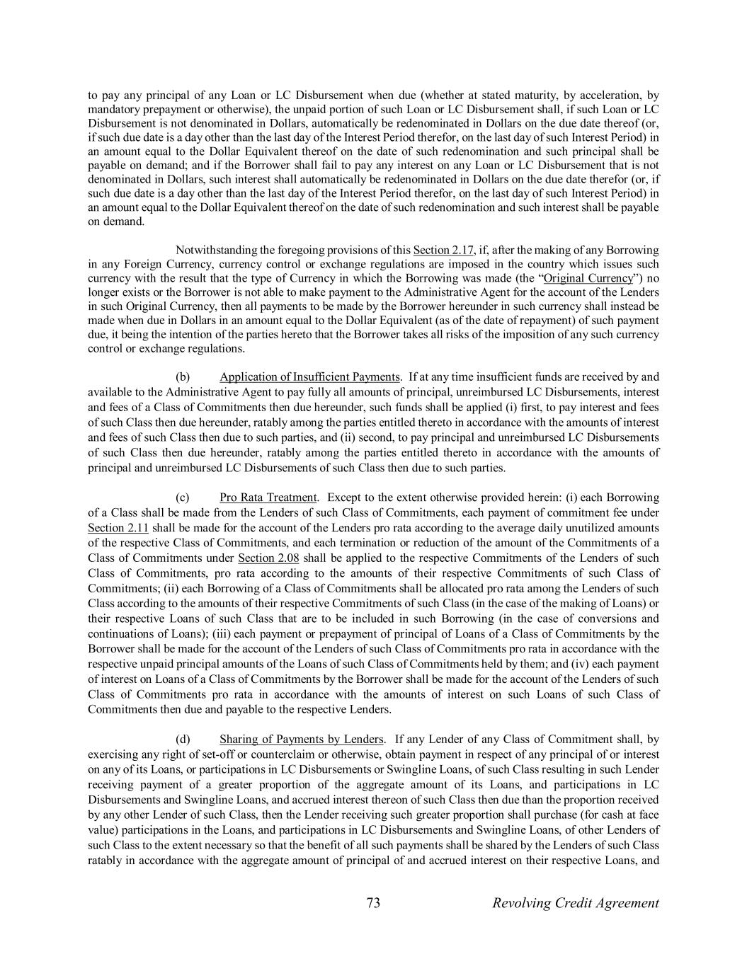 73 Revolving Credit Agreement to pay any principal of any Loan or LC Disbursement when due (whether at stated maturity, by acceleration, by mandatory prepayment or otherwise), the unpaid portion of such Loan or LC Disbursement shall, if such Loan or LC Disbursement is not denominated in Dollars, automatically be redenominated in Dollars on the due date thereof (or, if such due date is a day other than the last day of the Interest Period therefor, on the last day of such Interest Period) in an amount equal to the Dollar Equivalent thereof on the date of such redenomination and such principal shall be payable on demand; and if the Borrower shall fail to pay any interest on any Loan or LC Disbursement that is not denominated in Dollars, such interest shall automatically be redenominated in Dollars on the due date therefor (or, if such due date is a day other than the last day of the Interest Period therefor, on the last day of such Interest Period) in an amount equal to the Dollar Equivalent thereof on the date of such redenomination and such interest shall be payable on demand. Notwithstanding the foregoing provisions of this Section 2.17, if, after the making of any Borrowing in any Foreign Currency, currency control or exchange regulations are imposed in the country which issues such currency with the result that the type of Currency in which the Borrowing was made (the “Original Currency”) no longer exists or the Borrower is not able to make payment to the Administrative Agent for the account of the Lenders in such Original Currency, then all payments to be made by the Borrower hereunder in such currency shall instead be made when due in Dollars in an amount equal to the Dollar Equivalent (as of the date of repayment) of such payment due, it being the intention of the parties hereto that the Borrower takes all risks of the imposition of any such currency control or exchange regulations. (b) Application of Insufficient Payments. If at any time insufficient funds are received by and available to the Administrative Agent to pay fully all amounts of principal, unreimbursed LC Disbursements, interest and fees of a Class of Commitments then due hereunder, such funds shall be applied (i) first, to pay interest and fees of such Class then due hereunder, ratably among the parties entitled thereto in accordance with the amounts of interest and fees of such Class then due to such parties, and (ii) second, to pay principal and unreimbursed LC Disbursements of such Class then due hereunder, ratably among the parties entitled thereto in accordance with the amounts of principal and unreimbursed LC Disbursements of such Class then due to such parties. (c) Pro Rata Treatment. Except to the extent otherwise provided herein: (i) each Borrowing of a Class shall be made from the Lenders of such Class of Commitments, each payment of commitment fee under Section 2.11 shall be made for the account of the Lenders pro rata according to the average daily unutilized amounts of the respective Class of Commitments, and each termination or reduction of the amount of the Commitments of a Class of Commitments under Section 2.08 shall be applied to the respective Commitments of the Lenders of such Class of Commitments, pro rata according to the amounts of their respective Commitments of such Class of Commitments; (ii) each Borrowing of a Class of Commitments shall be allocated pro rata among the Lenders of such Class according to the amounts of their respective Commitments of such Class (in the case of the making of Loans) or their respective Loans of such Class that are to be included in such Borrowing (in the case of conversions and continuations of Loans); (iii) each payment or prepayment of principal of Loans of a Class of Commitments by the Borrower shall be made for the account of the Lenders of such Class of Commitments pro rata in accordance with the respective unpaid principal amounts of the Loans of such Class of Commitments held by them; and (iv) each payment of interest on Loans of a Class of Commitments by the Borrower shall be made for the account of the Lenders of such Class of Commitments pro rata in accordance with the amounts of interest on such Loans of such Class of Commitments then due and payable to the respective Lenders. (d) Sharing of Payments by Lenders. If any Lender of any Class of Commitment shall, by exercising any right of set-off or counterclaim or otherwise, obtain payment in respect of any principal of or interest on any of its Loans, or participations in LC Disbursements or Swingline Loans, of such Class resulting in such Lender receiving payment of a greater proportion of the aggregate amount of its Loans, and participations in LC Disbursements and Swingline Loans, and accrued interest thereon of such Class then due than the proportion received by any other Lender of such Class, then the Lender receiving such greater proportion shall purchase (for cash at face value) participations in the Loans, and participations in LC Disbursements and Swingline Loans, of other Lenders of such Class to the extent necessary so that the benefit of all such payments shall be shared by the Lenders of such Class ratably in accordance with the aggregate amount of principal of and accrued interest on their respective Loans, and
