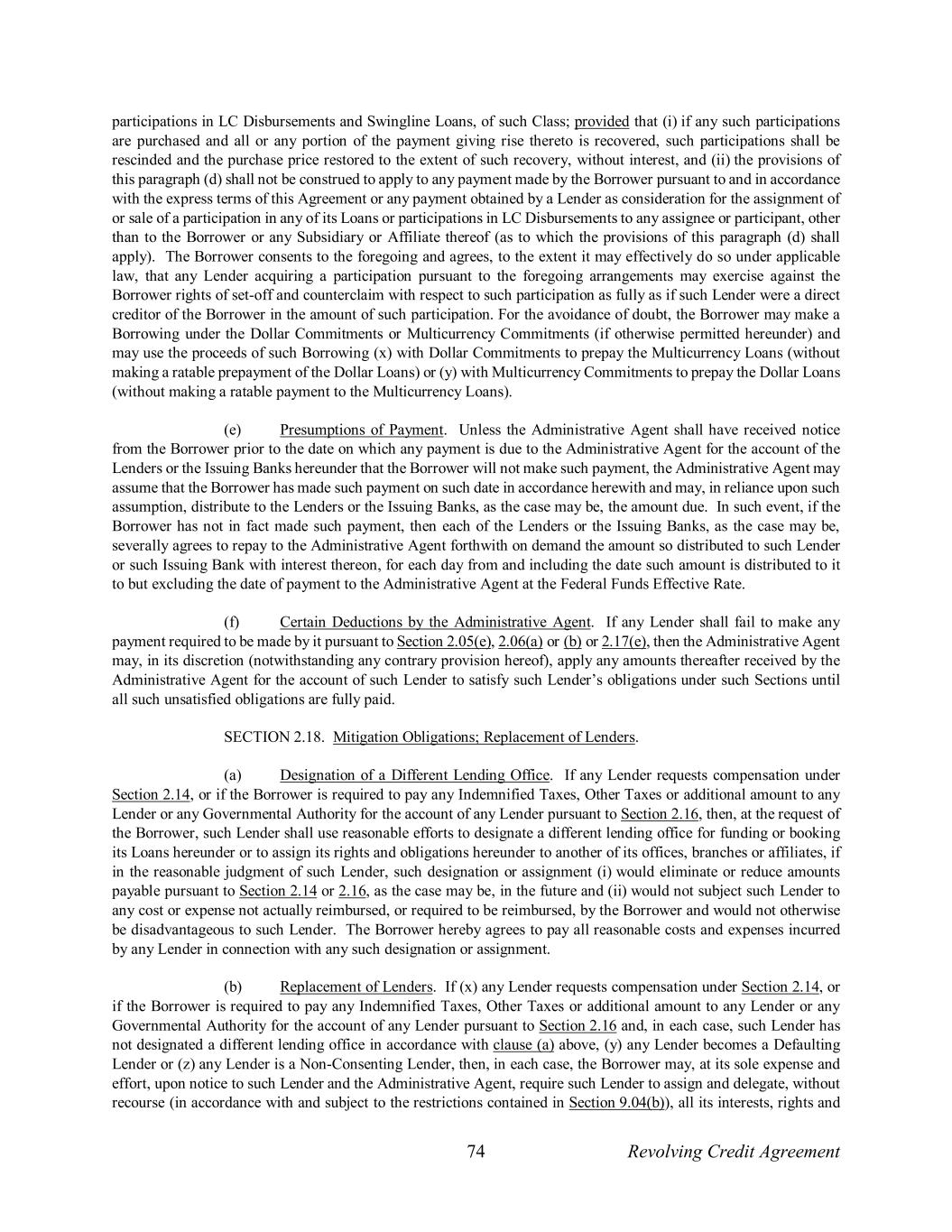 74 Revolving Credit Agreement participations in LC Disbursements and Swingline Loans, of such Class; provided that (i) if any such participations are purchased and all or any portion of the payment giving rise thereto is recovered, such participations shall be rescinded and the purchase price restored to the extent of such recovery, without interest, and (ii) the provisions of this paragraph (d) shall not be construed to apply to any payment made by the Borrower pursuant to and in accordance with the express terms of this Agreement or any payment obtained by a Lender as consideration for the assignment of or sale of a participation in any of its Loans or participations in LC Disbursements to any assignee or participant, other than to the Borrower or any Subsidiary or Affiliate thereof (as to which the provisions of this paragraph (d) shall apply). The Borrower consents to the foregoing and agrees, to the extent it may effectively do so under applicable law, that any Lender acquiring a participation pursuant to the foregoing arrangements may exercise against the Borrower rights of set-off and counterclaim with respect to such participation as fully as if such Lender were a direct creditor of the Borrower in the amount of such participation. For the avoidance of doubt, the Borrower may make a Borrowing under the Dollar Commitments or Multicurrency Commitments (if otherwise permitted hereunder) and may use the proceeds of such Borrowing (x) with Dollar Commitments to prepay the Multicurrency Loans (without making a ratable prepayment of the Dollar Loans) or (y) with Multicurrency Commitments to prepay the Dollar Loans (without making a ratable payment to the Multicurrency Loans). (e) Presumptions of Payment. Unless the Administrative Agent shall have received notice from the Borrower prior to the date on which any payment is due to the Administrative Agent for the account of the Lenders or the Issuing Banks hereunder that the Borrower will not make such payment, the Administrative Agent may assume that the Borrower has made such payment on such date in accordance herewith and may, in reliance upon such assumption, distribute to the Lenders or the Issuing Banks, as the case may be, the amount due. In such event, if the Borrower has not in fact made such payment, then each of the Lenders or the Issuing Banks, as the case may be, severally agrees to repay to the Administrative Agent forthwith on demand the amount so distributed to such Lender or such Issuing Bank with interest thereon, for each day from and including the date such amount is distributed to it to but excluding the date of payment to the Administrative Agent at the Federal Funds Effective Rate. (f) Certain Deductions by the Administrative Agent. If any Lender shall fail to make any payment required to be made by it pursuant to Section 2.05(e), 2.06(a) or (b) or 2.17(e), then the Administrative Agent may, in its discretion (notwithstanding any contrary provision hereof), apply any amounts thereafter received by the Administrative Agent for the account of such Lender to satisfy such Lender’s obligations under such Sections until all such unsatisfied obligations are fully paid. SECTION 2.18. Mitigation Obligations; Replacement of Lenders. (a) Designation of a Different Lending Office. If any Lender requests compensation under Section 2.14, or if the Borrower is required to pay any Indemnified Taxes, Other Taxes or additional amount to any Lender or any Governmental Authority for the account of any Lender pursuant to Section 2.16, then, at the request of the Borrower, such Lender shall use reasonable efforts to designate a different lending office for funding or booking its Loans hereunder or to assign its rights and obligations hereunder to another of its offices, branches or affiliates, if in the reasonable judgment of such Lender, such designation or assignment (i) would eliminate or reduce amounts payable pursuant to Section 2.14 or 2.16, as the case may be, in the future and (ii) would not subject such Lender to any cost or expense not actually reimbursed, or required to be reimbursed, by the Borrower and would not otherwise be disadvantageous to such Lender. The Borrower hereby agrees to pay all reasonable costs and expenses incurred by any Lender in connection with any such designation or assignment. (b) Replacement of Lenders. If (x) any Lender requests compensation under Section 2.14, or if the Borrower is required to pay any Indemnified Taxes, Other Taxes or additional amount to any Lender or any Governmental Authority for the account of any Lender pursuant to Section 2.16 and, in each case, such Lender has not designated a different lending office in accordance with clause (a) above, (y) any Lender becomes a Defaulting Lender or (z) any Lender is a Non-Consenting Lender, then, in each case, the Borrower may, at its sole expense and effort, upon notice to such Lender and the Administrative Agent, require such Lender to assign and delegate, without recourse (in accordance with and subject to the restrictions contained in Section 9.04(b)), all its interests, rights and