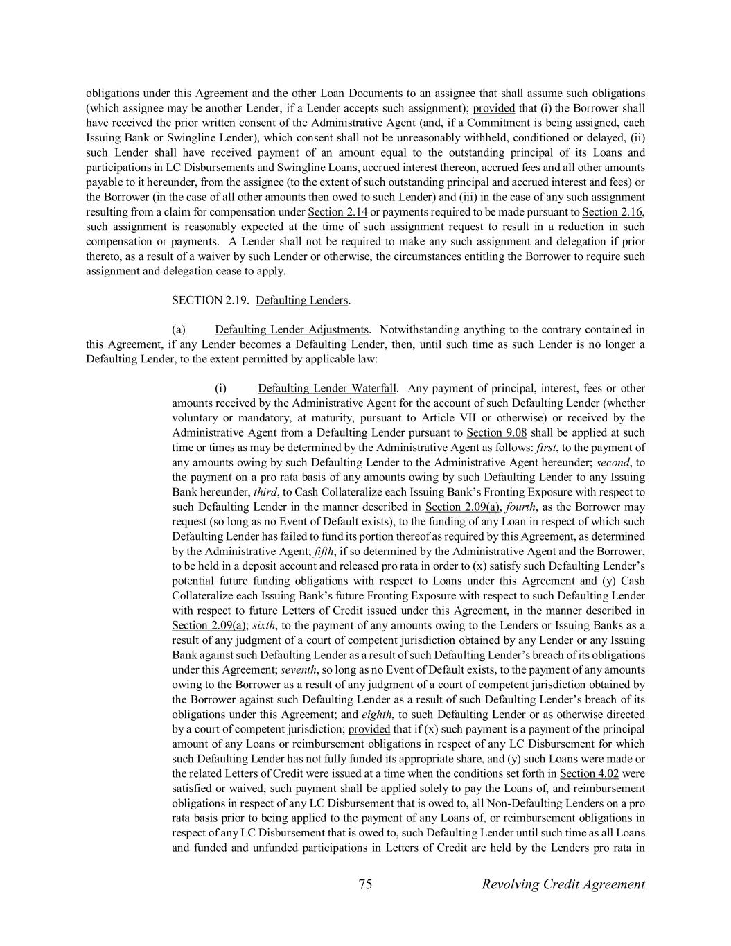75 Revolving Credit Agreement obligations under this Agreement and the other Loan Documents to an assignee that shall assume such obligations (which assignee may be another Lender, if a Lender accepts such assignment); provided that (i) the Borrower shall have received the prior written consent of the Administrative Agent (and, if a Commitment is being assigned, each Issuing Bank or Swingline Lender), which consent shall not be unreasonably withheld, conditioned or delayed, (ii) such Lender shall have received payment of an amount equal to the outstanding principal of its Loans and participations in LC Disbursements and Swingline Loans, accrued interest thereon, accrued fees and all other amounts payable to it hereunder, from the assignee (to the extent of such outstanding principal and accrued interest and fees) or the Borrower (in the case of all other amounts then owed to such Lender) and (iii) in the case of any such assignment resulting from a claim for compensation under Section 2.14 or payments required to be made pursuant to Section 2.16, such assignment is reasonably expected at the time of such assignment request to result in a reduction in such compensation or payments. A Lender shall not be required to make any such assignment and delegation if prior thereto, as a result of a waiver by such Lender or otherwise, the circumstances entitling the Borrower to require such assignment and delegation cease to apply. SECTION 2.19. Defaulting Lenders. (a) Defaulting Lender Adjustments. Notwithstanding anything to the contrary contained in this Agreement, if any Lender becomes a Defaulting Lender, then, until such time as such Lender is no longer a Defaulting Lender, to the extent permitted by applicable law: (i) Defaulting Lender Waterfall. Any payment of principal, interest, fees or other amounts received by the Administrative Agent for the account of such Defaulting Lender (whether voluntary or mandatory, at maturity, pursuant to Article VII or otherwise) or received by the Administrative Agent from a Defaulting Lender pursuant to Section 9.08 shall be applied at such time or times as may be determined by the Administrative Agent as follows: first, to the payment of any amounts owing by such Defaulting Lender to the Administrative Agent hereunder; second, to the payment on a pro rata basis of any amounts owing by such Defaulting Lender to any Issuing Bank hereunder, third, to Cash Collateralize each Issuing Bank’s Fronting Exposure with respect to such Defaulting Lender in the manner described in Section 2.09(a), fourth, as the Borrower may request (so long as no Event of Default exists), to the funding of any Loan in respect of which such Defaulting Lender has failed to fund its portion thereof as required by this Agreement, as determined by the Administrative Agent; fifth, if so determined by the Administrative Agent and the Borrower, to be held in a deposit account and released pro rata in order to (x) satisfy such Defaulting Lender’s potential future funding obligations with respect to Loans under this Agreement and (y) Cash Collateralize each Issuing Bank’s future Fronting Exposure with respect to such Defaulting Lender with respect to future Letters of Credit issued under this Agreement, in the manner described in Section 2.09(a); sixth, to the payment of any amounts owing to the Lenders or Issuing Banks as a result of any judgment of a court of competent jurisdiction obtained by any Lender or any Issuing Bank against such Defaulting Lender as a result of such Defaulting Lender’s breach of its obligations under this Agreement; seventh, so long as no Event of Default exists, to the payment of any amounts owing to the Borrower as a result of any judgment of a court of competent jurisdiction obtained by the Borrower against such Defaulting Lender as a result of such Defaulting Lender’s breach of its obligations under this Agreement; and eighth, to such Defaulting Lender or as otherwise directed by a court of competent jurisdiction; provided that if (x) such payment is a payment of the principal amount of any Loans or reimbursement obligations in respect of any LC Disbursement for which such Defaulting Lender has not fully funded its appropriate share, and (y) such Loans were made or the related Letters of Credit were issued at a time when the conditions set forth in Section 4.02 were satisfied or waived, such payment shall be applied solely to pay the Loans of, and reimbursement obligations in respect of any LC Disbursement that is owed to, all Non-Defaulting Lenders on a pro rata basis prior to being applied to the payment of any Loans of, or reimbursement obligations in respect of any LC Disbursement that is owed to, such Defaulting Lender until such time as all Loans and funded and unfunded participations in Letters of Credit are held by the Lenders pro rata in