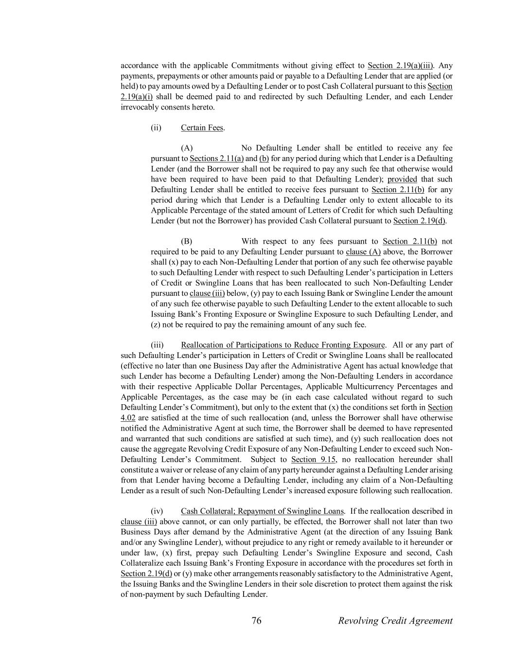 76 Revolving Credit Agreement accordance with the applicable Commitments without giving effect to Section 2.19(a)(iii). Any payments, prepayments or other amounts paid or payable to a Defaulting Lender that are applied (or held) to pay amounts owed by a Defaulting Lender or to post Cash Collateral pursuant to this Section 2.19(a)(i) shall be deemed paid to and redirected by such Defaulting Lender, and each Lender irrevocably consents hereto. (ii) Certain Fees. (A) No Defaulting Lender shall be entitled to receive any fee pursuant to Sections 2.11(a) and (b) for any period during which that Lender is a Defaulting Lender (and the Borrower shall not be required to pay any such fee that otherwise would have been required to have been paid to that Defaulting Lender); provided that such Defaulting Lender shall be entitled to receive fees pursuant to Section 2.11(b) for any period during which that Lender is a Defaulting Lender only to extent allocable to its Applicable Percentage of the stated amount of Letters of Credit for which such Defaulting Lender (but not the Borrower) has provided Cash Collateral pursuant to Section 2.19(d). (B) With respect to any fees pursuant to Section 2.11(b) not required to be paid to any Defaulting Lender pursuant to clause (A) above, the Borrower shall (x) pay to each Non-Defaulting Lender that portion of any such fee otherwise payable to such Defaulting Lender with respect to such Defaulting Lender’s participation in Letters of Credit or Swingline Loans that has been reallocated to such Non-Defaulting Lender pursuant to clause (iii) below, (y) pay to each Issuing Bank or Swingline Lender the amount of any such fee otherwise payable to such Defaulting Lender to the extent allocable to such Issuing Bank’s Fronting Exposure or Swingline Exposure to such Defaulting Lender, and (z) not be required to pay the remaining amount of any such fee. (iii) Reallocation of Participations to Reduce Fronting Exposure. All or any part of such Defaulting Lender’s participation in Letters of Credit or Swingline Loans shall be reallocated (effective no later than one Business Day after the Administrative Agent has actual knowledge that such Lender has become a Defaulting Lender) among the Non-Defaulting Lenders in accordance with their respective Applicable Dollar Percentages, Applicable Multicurrency Percentages and Applicable Percentages, as the case may be (in each case calculated without regard to such Defaulting Lender’s Commitment), but only to the extent that (x) the conditions set forth in Section 4.02 are satisfied at the time of such reallocation (and, unless the Borrower shall have otherwise notified the Administrative Agent at such time, the Borrower shall be deemed to have represented and warranted that such conditions are satisfied at such time), and (y) such reallocation does not cause the aggregate Revolving Credit Exposure of any Non-Defaulting Lender to exceed such Non- Defaulting Lender’s Commitment. Subject to Section 9.15, no reallocation hereunder shall constitute a waiver or release of any claim of any party hereunder against a Defaulting Lender arising from that Lender having become a Defaulting Lender, including any claim of a Non-Defaulting Lender as a result of such Non-Defaulting Lender’s increased exposure following such reallocation. (iv) Cash Collateral; Repayment of Swingline Loans. If the reallocation described in clause (iii) above cannot, or can only partially, be effected, the Borrower shall not later than two Business Days after demand by the Administrative Agent (at the direction of any Issuing Bank and/or any Swingline Lender), without prejudice to any right or remedy available to it hereunder or under law, (x) first, prepay such Defaulting Lender’s Swingline Exposure and second, Cash Collateralize each Issuing Bank’s Fronting Exposure in accordance with the procedures set forth in Section 2.19(d) or (y) make other arrangements reasonably satisfactory to the Administrative Agent, the Issuing Banks and the Swingline Lenders in their sole discretion to protect them against the risk of non-payment by such Defaulting Lender.