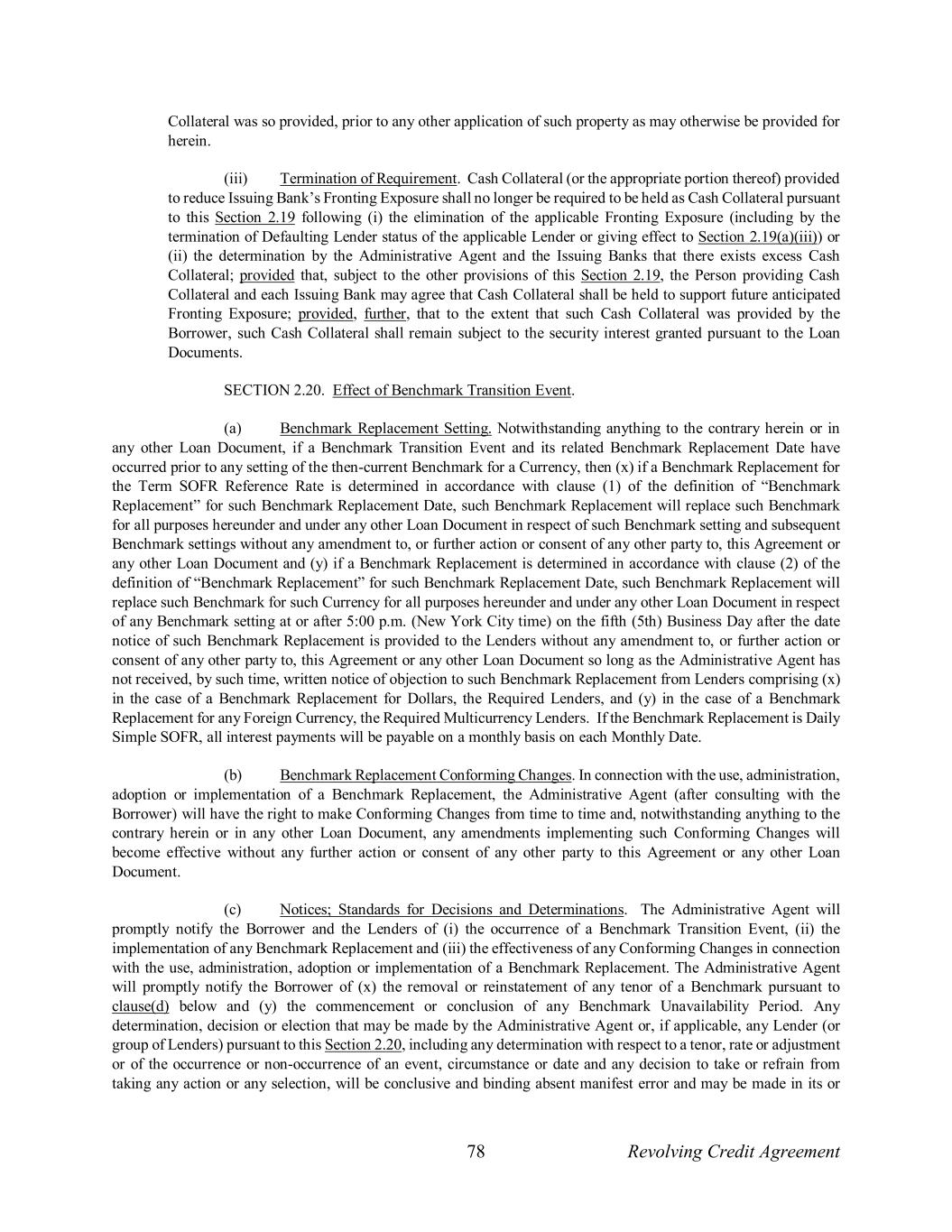 78 Revolving Credit Agreement Collateral was so provided, prior to any other application of such property as may otherwise be provided for herein. (iii) Termination of Requirement. Cash Collateral (or the appropriate portion thereof) provided to reduce Issuing Bank’s Fronting Exposure shall no longer be required to be held as Cash Collateral pursuant to this Section 2.19 following (i) the elimination of the applicable Fronting Exposure (including by the termination of Defaulting Lender status of the applicable Lender or giving effect to Section 2.19(a)(iii)) or (ii) the determination by the Administrative Agent and the Issuing Banks that there exists excess Cash Collateral; provided that, subject to the other provisions of this Section 2.19, the Person providing Cash Collateral and each Issuing Bank may agree that Cash Collateral shall be held to support future anticipated Fronting Exposure; provided, further, that to the extent that such Cash Collateral was provided by the Borrower, such Cash Collateral shall remain subject to the security interest granted pursuant to the Loan Documents. SECTION 2.20. Effect of Benchmark Transition Event. (a) Benchmark Replacement Setting. Notwithstanding anything to the contrary herein or in any other Loan Document, if a Benchmark Transition Event and its related Benchmark Replacement Date have occurred prior to any setting of the then-current Benchmark for a Currency, then (x) if a Benchmark Replacement for the Term SOFR Reference Rate is determined in accordance with clause (1) of the definition of “Benchmark Replacement” for such Benchmark Replacement Date, such Benchmark Replacement will replace such Benchmark for all purposes hereunder and under any other Loan Document in respect of such Benchmark setting and subsequent Benchmark settings without any amendment to, or further action or consent of any other party to, this Agreement or any other Loan Document and (y) if a Benchmark Replacement is determined in accordance with clause (2) of the definition of “Benchmark Replacement” for such Benchmark Replacement Date, such Benchmark Replacement will replace such Benchmark for such Currency for all purposes hereunder and under any other Loan Document in respect of any Benchmark setting at or after 5:00 p.m. (New York City time) on the fifth (5th) Business Day after the date notice of such Benchmark Replacement is provided to the Lenders without any amendment to, or further action or consent of any other party to, this Agreement or any other Loan Document so long as the Administrative Agent has not received, by such time, written notice of objection to such Benchmark Replacement from Lenders comprising (x) in the case of a Benchmark Replacement for Dollars, the Required Lenders, and (y) in the case of a Benchmark Replacement for any Foreign Currency, the Required Multicurrency Lenders. If the Benchmark Replacement is Daily Simple SOFR, all interest payments will be payable on a monthly basis on each Monthly Date. (b) Benchmark Replacement Conforming Changes. In connection with the use, administration, adoption or implementation of a Benchmark Replacement, the Administrative Agent (after consulting with the Borrower) will have the right to make Conforming Changes from time to time and, notwithstanding anything to the contrary herein or in any other Loan Document, any amendments implementing such Conforming Changes will become effective without any further action or consent of any other party to this Agreement or any other Loan Document. (c) Notices; Standards for Decisions and Determinations. The Administrative Agent will promptly notify the Borrower and the Lenders of (i) the occurrence of a Benchmark Transition Event, (ii) the implementation of any Benchmark Replacement and (iii) the effectiveness of any Conforming Changes in connection with the use, administration, adoption or implementation of a Benchmark Replacement. The Administrative Agent will promptly notify the Borrower of (x) the removal or reinstatement of any tenor of a Benchmark pursuant to clause(d) below and (y) the commencement or conclusion of any Benchmark Unavailability Period. Any determination, decision or election that may be made by the Administrative Agent or, if applicable, any Lender (or group of Lenders) pursuant to this Section 2.20, including any determination with respect to a tenor, rate or adjustment or of the occurrence or non-occurrence of an event, circumstance or date and any decision to take or refrain from taking any action or any selection, will be conclusive and binding absent manifest error and may be made in its or
